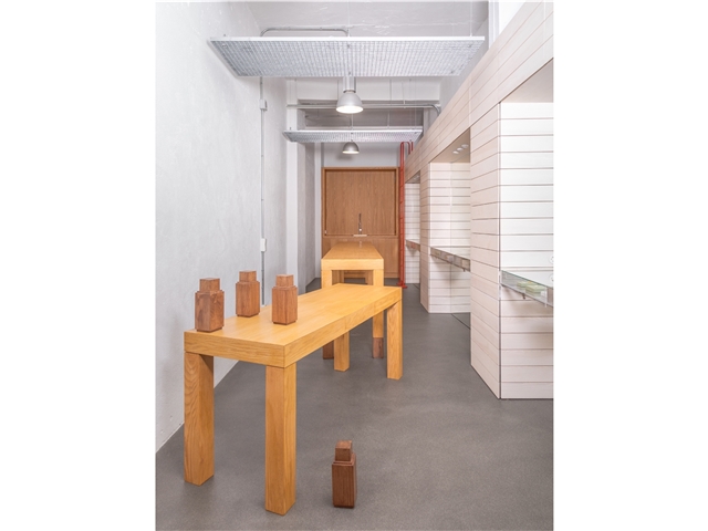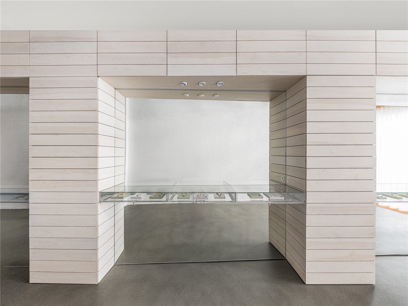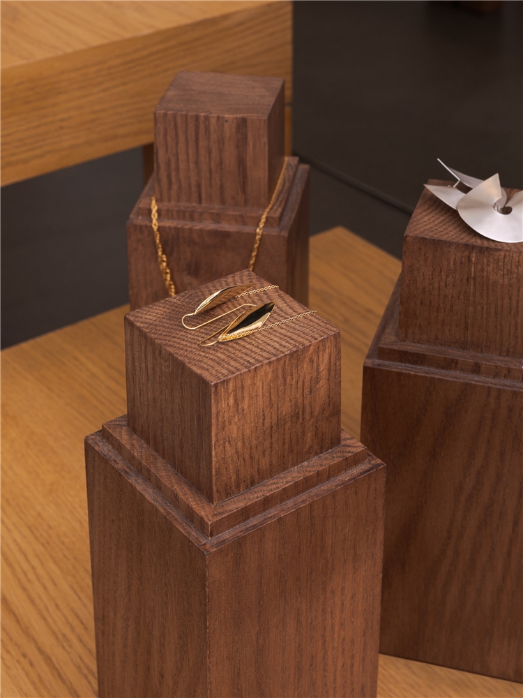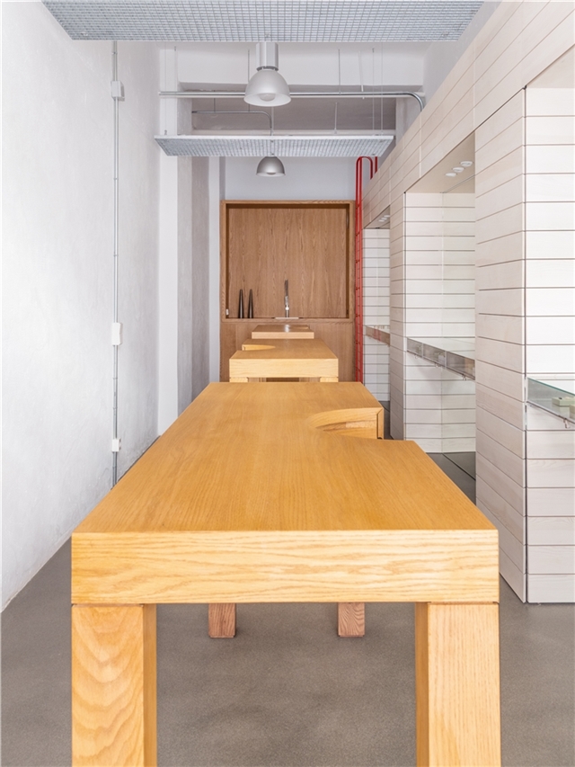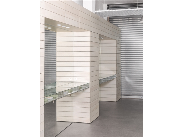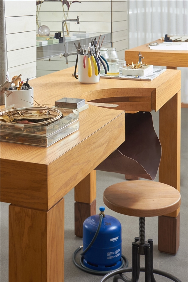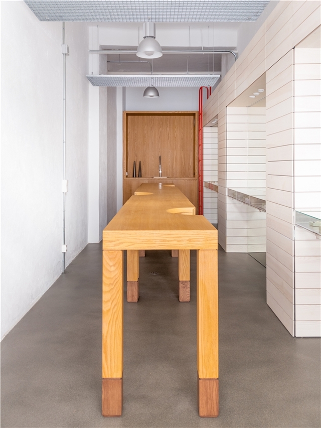 La propuesta opera de manera trans-escalar: de la joya al objeto, del objeto al mueble, del mueble al espacio y del espacio a la ciudad. Esta lógica se materializa a través de dos elementos históricamente ligados a la joyería: la mesa y el cajón. Un sistema de mesas transformables en superficie y altura revisita la mesa tradicional de joyería y articula los procesos de diseño, fabricación y venta, pudiendo combinarse para talleres, ventas privadas o eventos. Paralelamente, un dispositivo lateral continuo resuelve el almacenamiento mediante cajones y armarios ocultos, integra baño y climatización, corrige las irregularidades del local e incorpora tres espejos a modo de “ventanas” interiores que amplifican la percepción espacial y evocan una logia pública. De ellas se suspenden vitrinas transparentes que exponen piezas singulares y construyen una narrativa a lo largo del espacio.