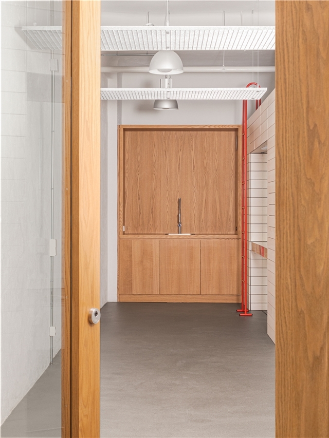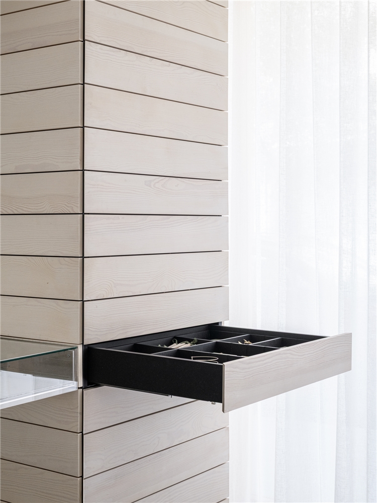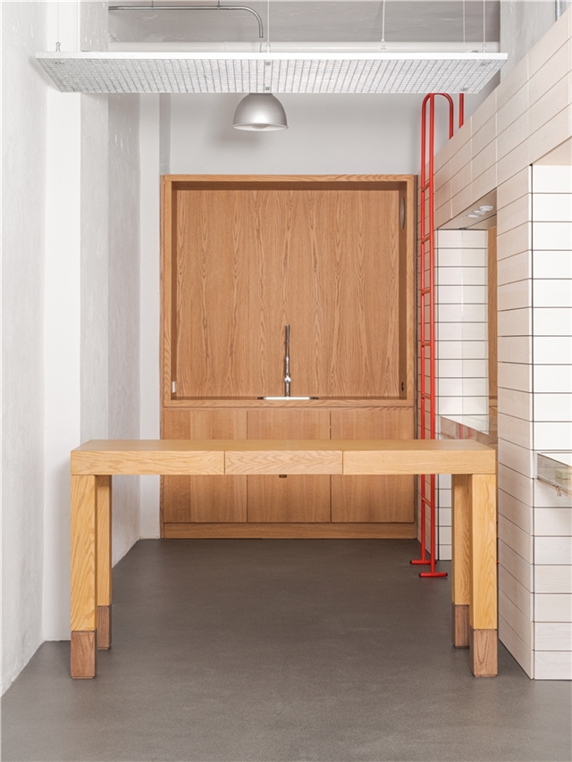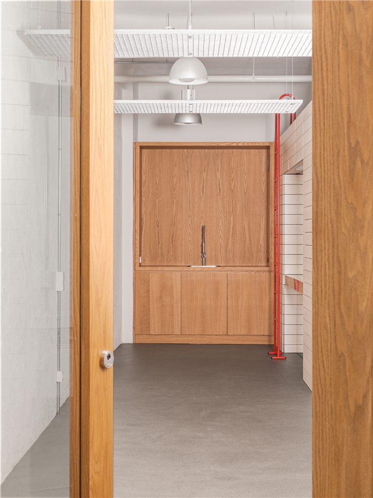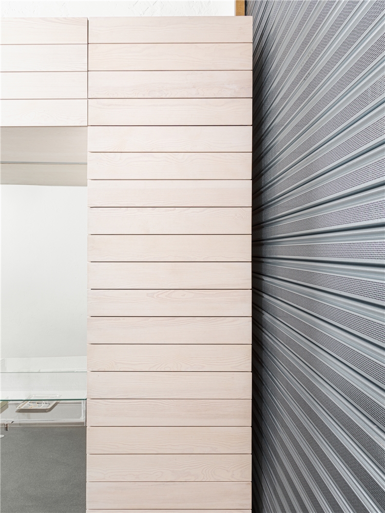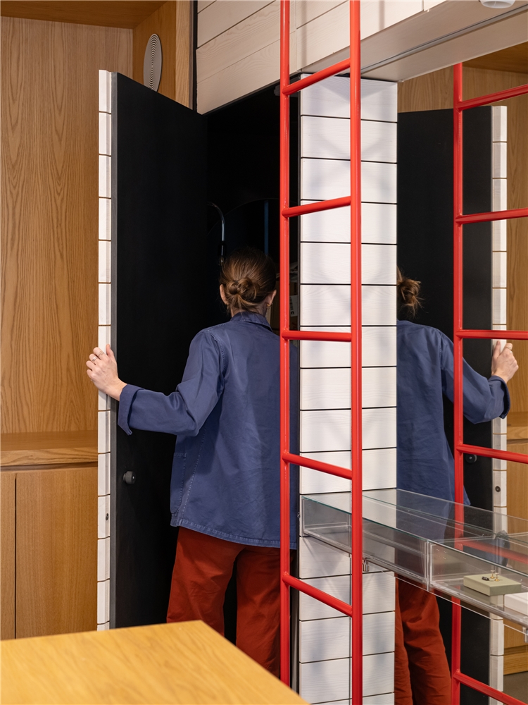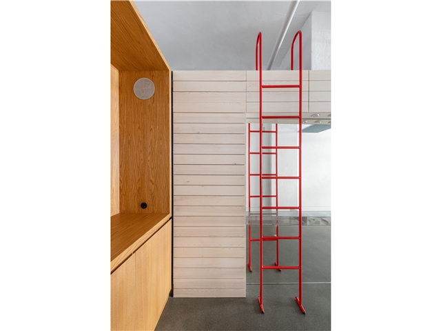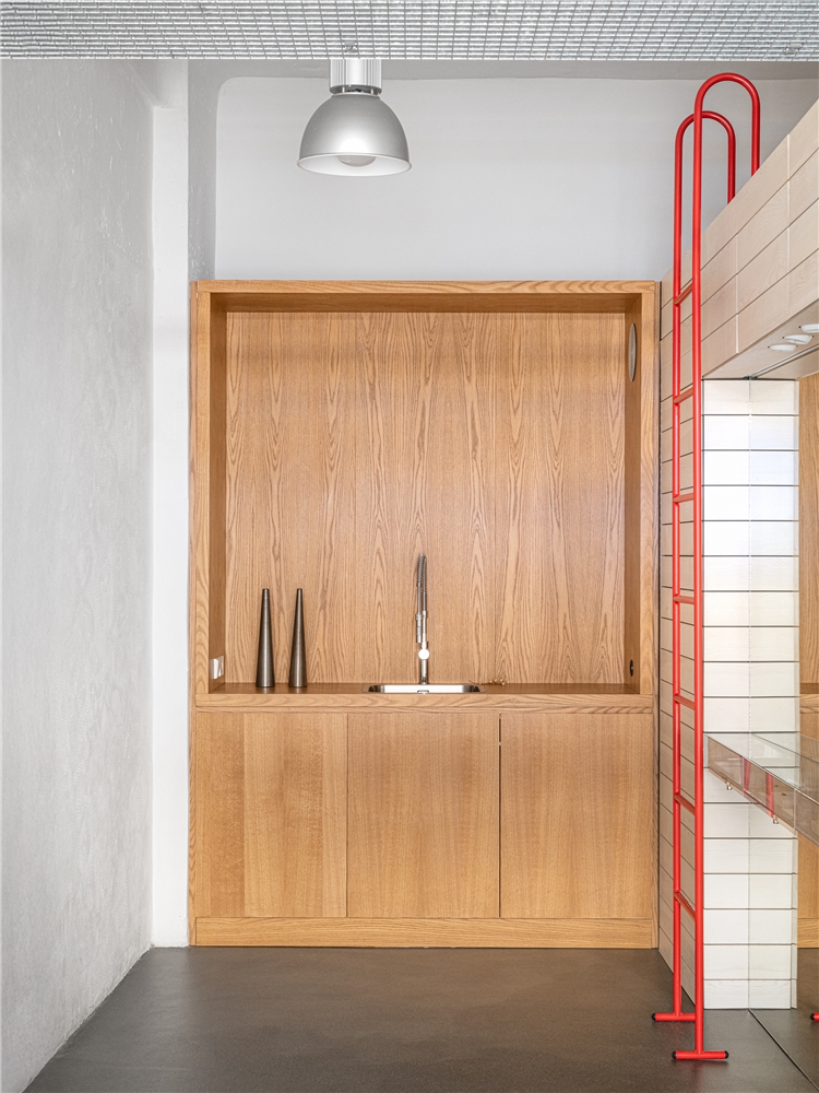 Otros elementos móviles refuerzan la adaptabilidad y la identidad del proyecto: la escalera al altillo diseñada junto al artesano Fran FFFF, las bandejas elevables de tramex que reinterpretan las barras de la antigua tintorería, las cortinas y cierres que permiten modular la privacidad, y las embocaduras en acceso y fondo, que actúan como filtros y umbrales.