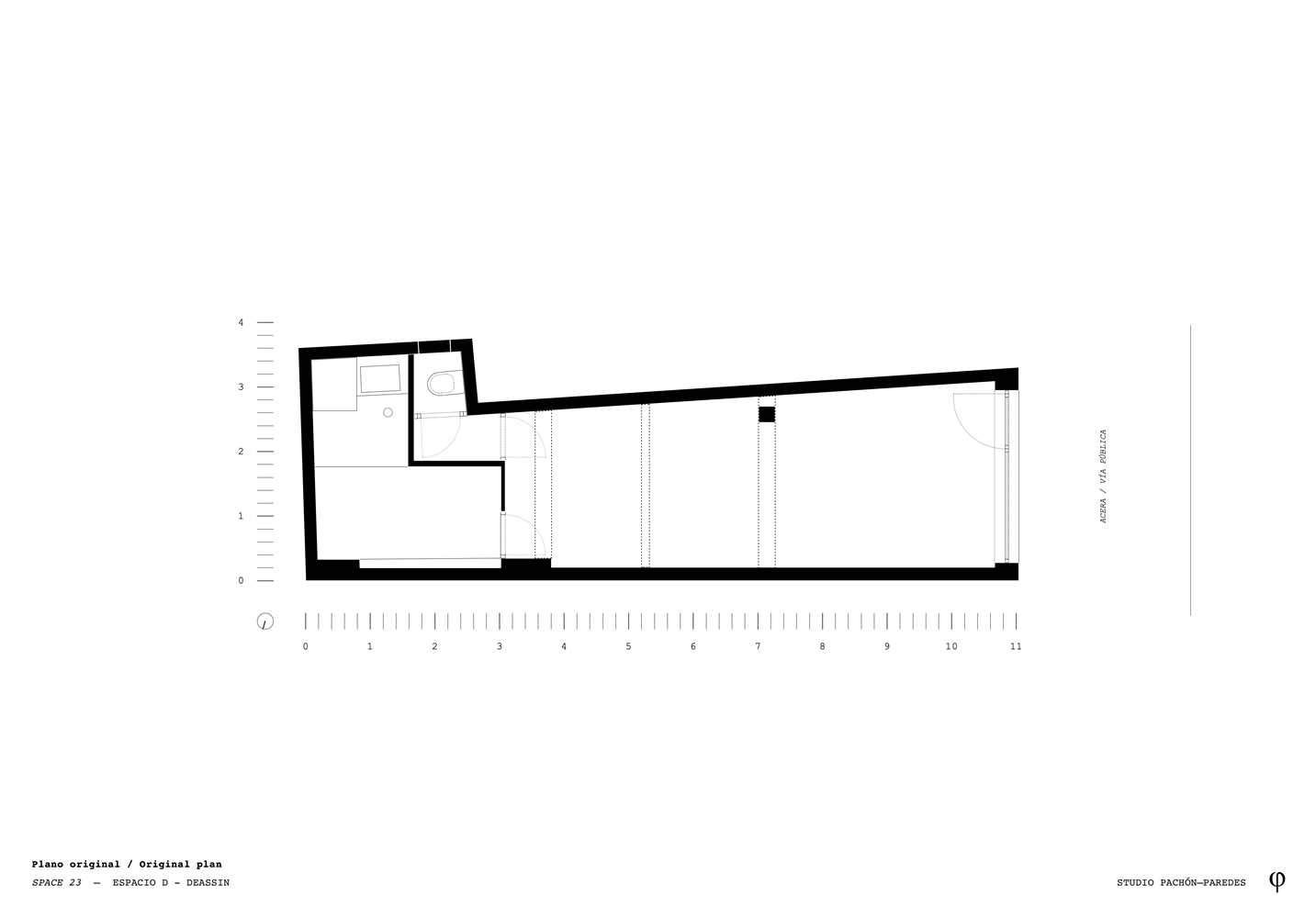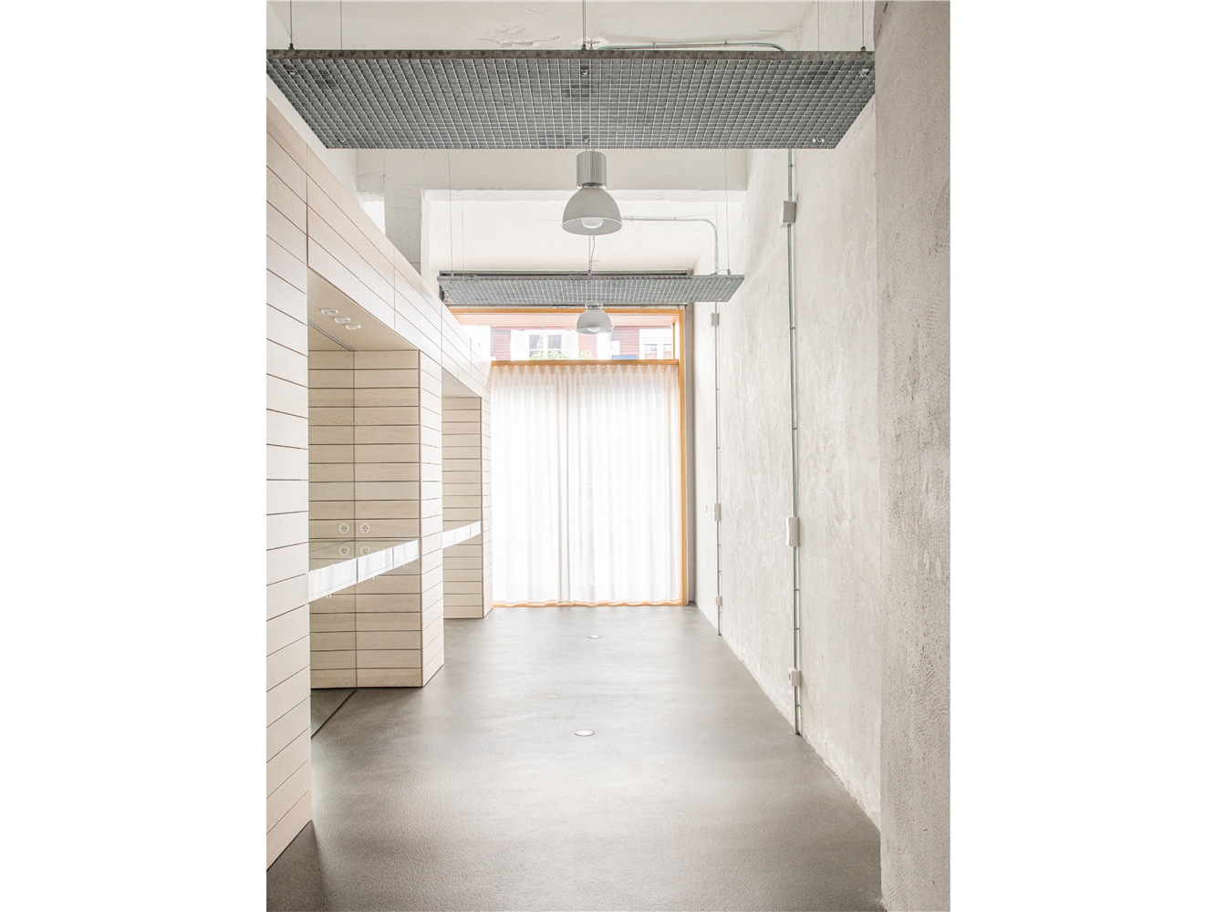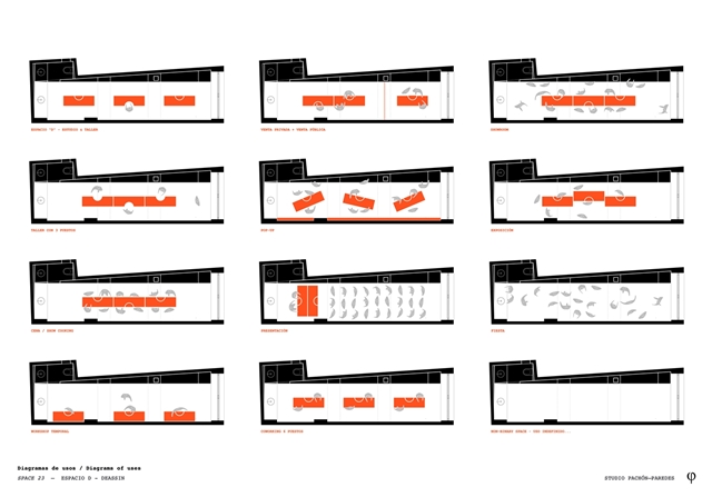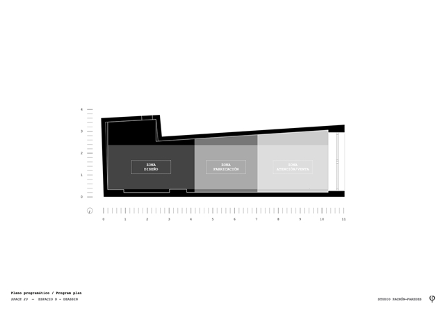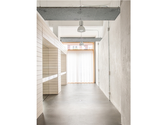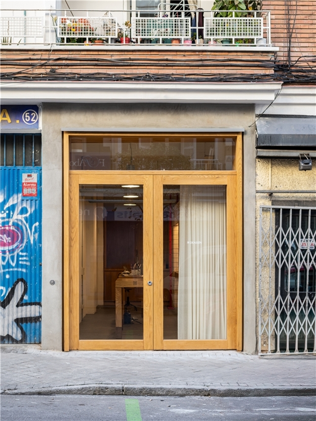 El local, estrecho y alargado (10×2,16 m), se abre hasta un 50% de su fachada a cota de calle, elimina las barreras arquitectónicas preexistentes y establece una relación directa con el exterior, fomentando la continuidad espacial y el intercambio con el barrio. La organización interior propone un gradiente de privacidad, situando los usos más públicos junto a la fachada y los procesos más íntimos en el fondo, permitiendo una reconfiguración constante según las necesidades.