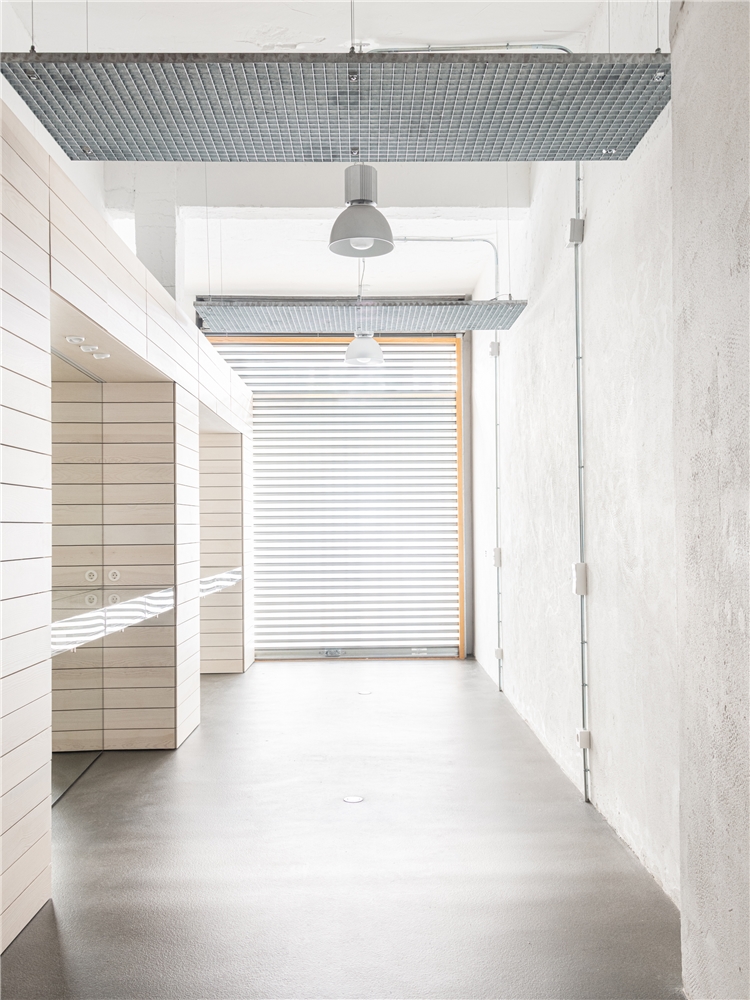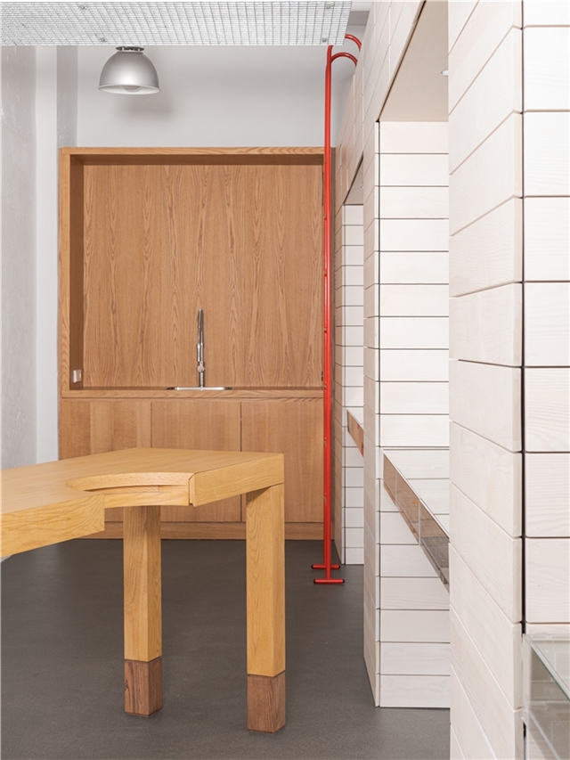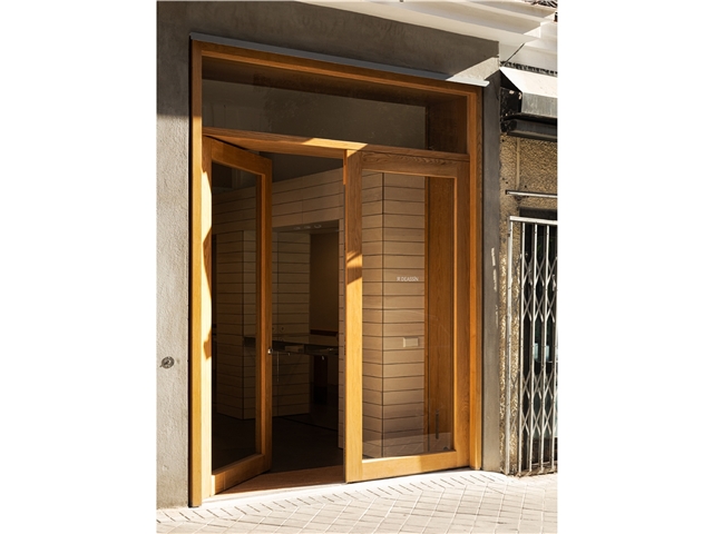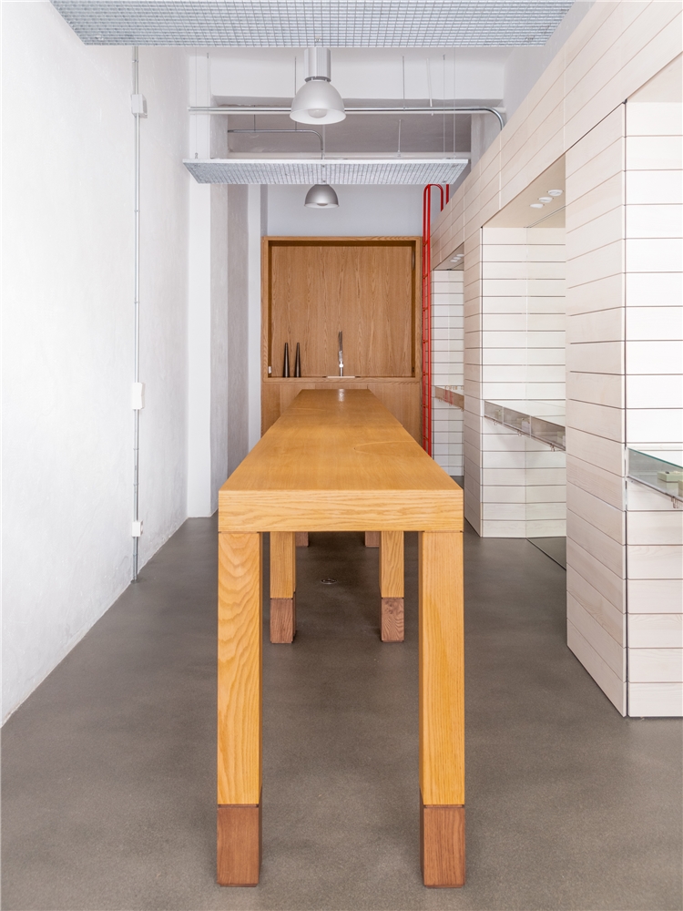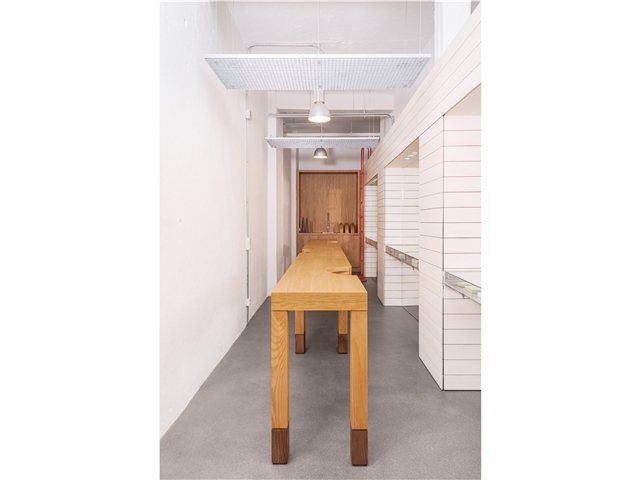 El local, estrecho y alargado (10×2,16 m), se abre hasta un 50% de su fachada a cota de calle, elimina las barreras arquitectónicas preexistentes y establece una relación directa con el exterior, fomentando la continuidad espacial y el intercambio con el barrio. La organización interior propone un gradiente de privacidad, situando los usos más públicos junto a la fachada y los procesos más íntimos en el fondo, permitiendo una reconfiguración constante según las necesidades.