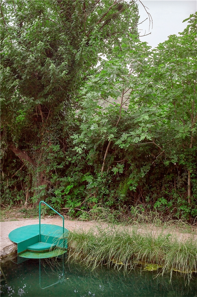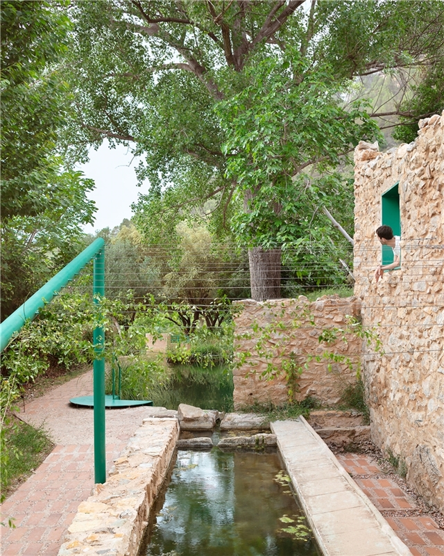 Para finalizar el recorrido de la intervención y, antes de retomar el camino que atraviesa la aldea, en uno de los muros de la almazara aparece una viga en voladizo en la que se anuda una cuerda para poder trepar y desde la que lanzarse al agua, reproduciendo la que ya existía colgada entre las ramas.