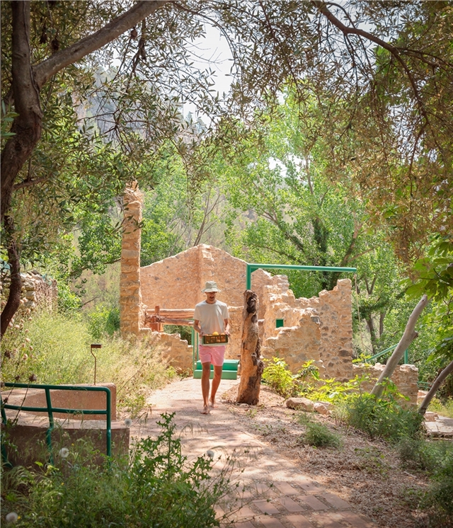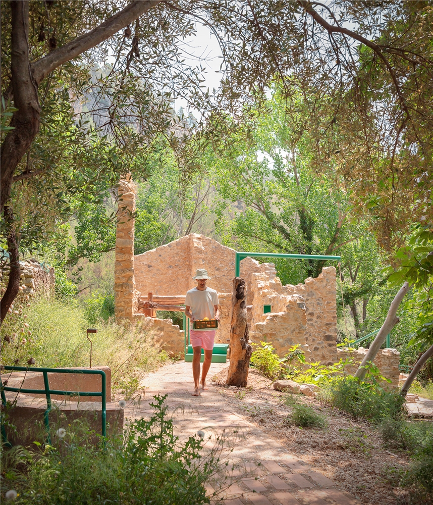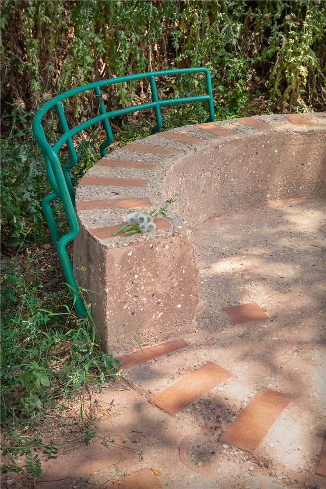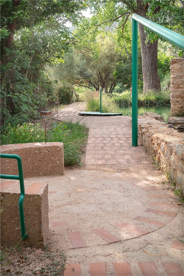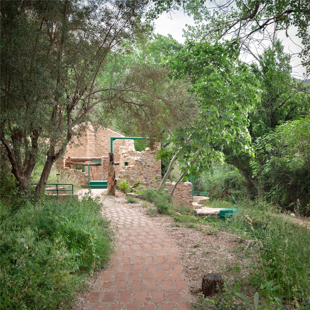 El paseo se inicia descendiendo desde las últimas viviendas. Una alfombra de hormigón desactivado, un terrazo in situ fabricado con restos del derrumbe y distintos aparejos de gres nos recoge y nos guía en un recorrido entre bancales que, salpicado de distintos hitos, nos acerca a la almazara. Un banco mirador entre los olivos sigue la estela de las sillas que los habitantes habían ido dejando en los lugares en los que mejor se estaba. De él surge un caño por el que sale el agua bombeada de la balsa en la que poder darse una ducha en los meses cálidos. Sigue el camino y a la vera de la balsa una pieza circular metálica indica un nuevo acceso al agua de manera más segura y accesible.