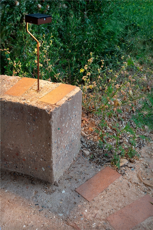 Por un lado están los materiales reutilizados: áridos, gravas o restos de la construcción como tejas y maderas del lugar que se emplean para pavimentar los distintos puntos del recorrido en función del tamaño del árido: los de menor tamaño como un hormigón desactivado para el camino y los de mayor tamaño como un terrazo conglomerado con cemento para pavimentar las piezas circulares o hitos. Y por último, se utiliza la teja para, siguiendo el mismo procedimiento de conformar un hormigón, ejecutar los puntos de inflexión del camino que anteceden a los hitos.