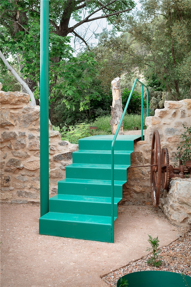 El segundo de los conjuntos de materiales son los que hemos llamado los materiales ajenos: elementos metálicos fabricados y ensamblados en taller que llegan a la obra destinados a ser montados en seco: vigas IPE y UPN para consolidar la estructura de la almazara combinadas con las vigas existentes de madera, una escalera de acero, piezas prefabricadas como marcos y dinteles para estabilizar los huecos de la almazara, y un caño para la balsa que permite ducharse.