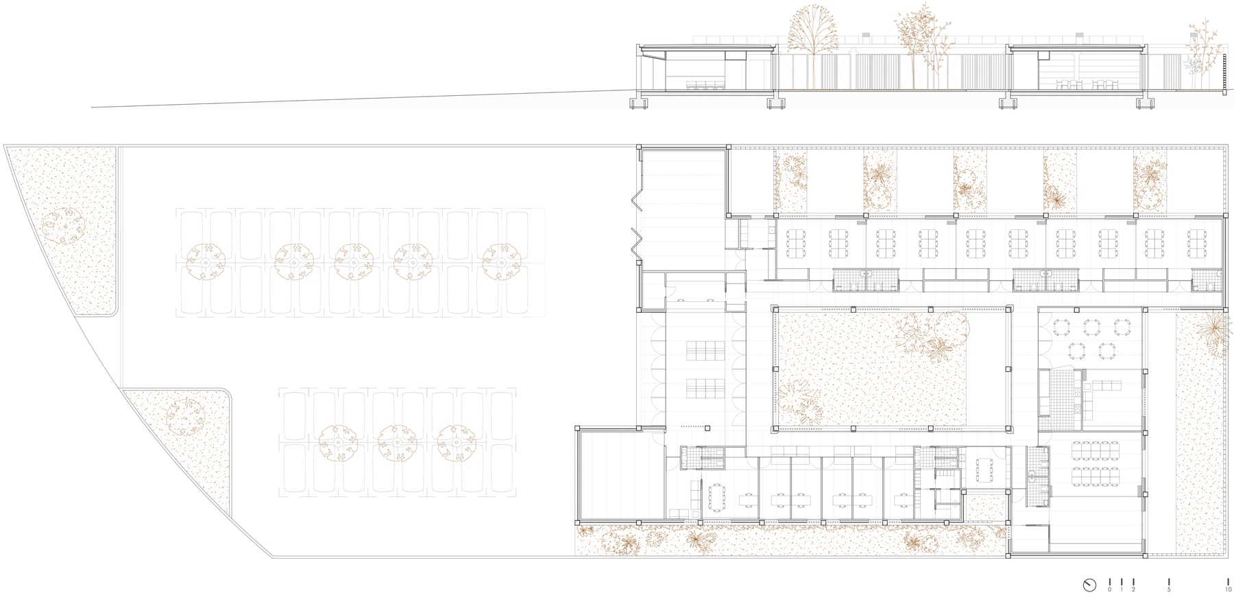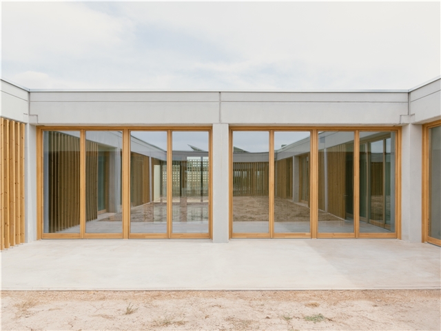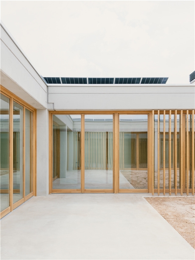 La organización del edificio se articula a partir de una geometría clara y reconocible, una cruz de cuatro brazos en torno a un patio central, que facilita la orientación espacial de los usuarios, reduce recorridos y evita situaciones de desorientación, habituales en personas con deterioro cognitivo. Cada ala acoge un ámbito funcional diferenciado —administración, atención personalizada, talleres y espacios comunes— y todos ellos se relacionan visual y físicamente con patios y jardines protegidos, favoreciendo la continuidad entre interior y exterior, la entrada de luz natural, la ventilación cruzada y el contacto con la naturaleza como parte del proceso terapéutico.