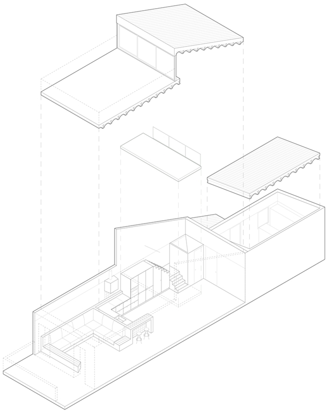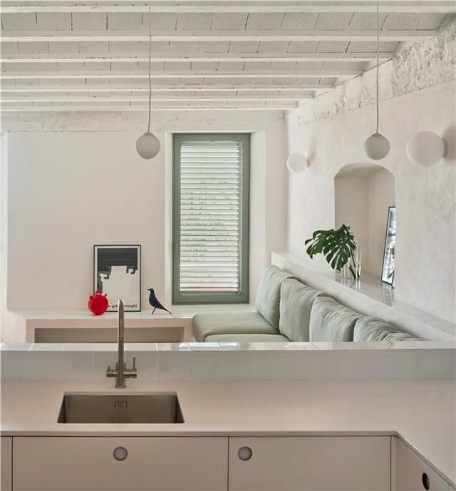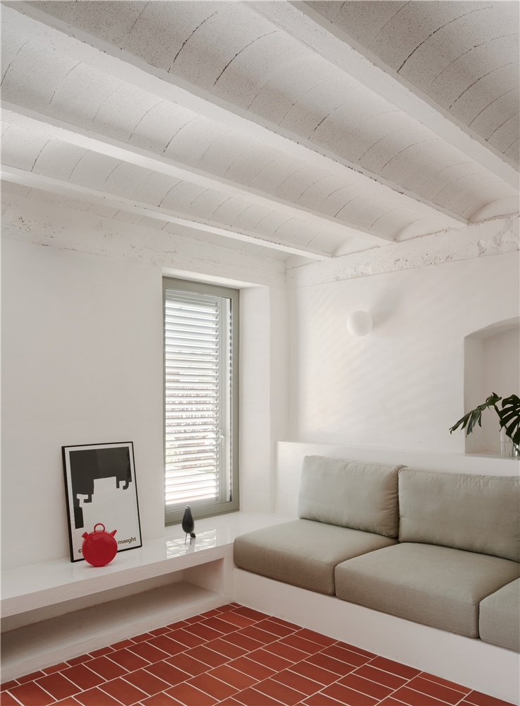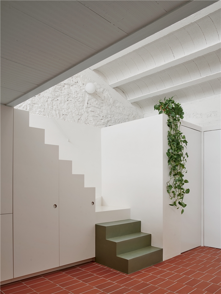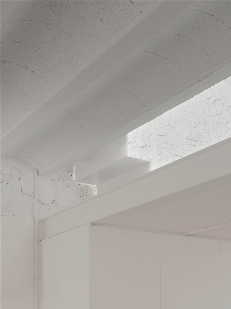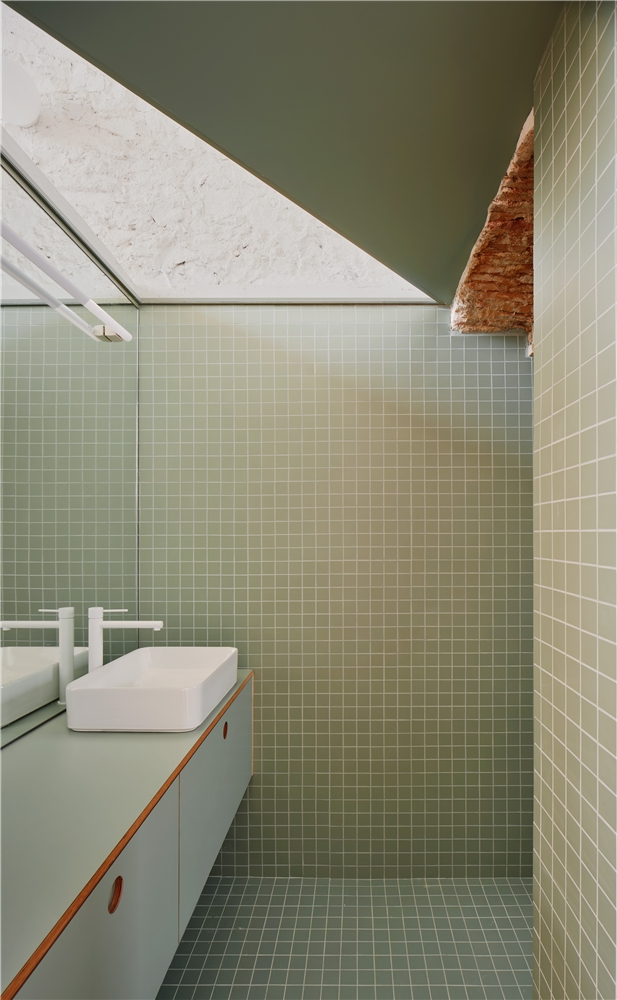 El baño, originalmente de dimensiones mínimas, se amplía mediante la incorporación de un nuevo volumen coronado por un lucernario que introduce luz cenital. El antiguo espacio de la cocina se transforma en dormitorio, mientras que el resto de la vivienda se mantiene diáfano. El mobiliario de obra —como se hacía en la época en que se construyó la casa— organiza el espacio sin necesidad de compartimentarlo.