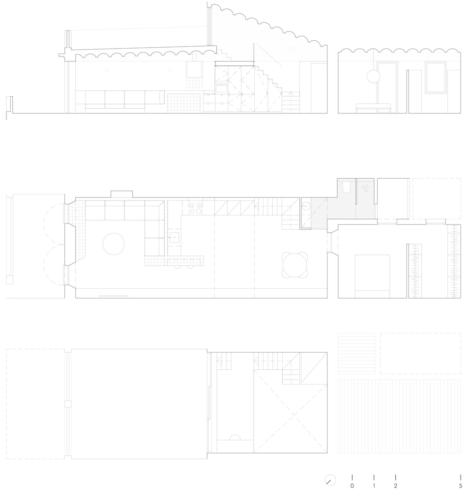 La estrategia se basa en abrir y vaciar, entendiendo la sección como herramienta principal de proyecto. Se eliminan todas las particiones preexistentes, manteniendo únicamente el muro de carga —antigua fachada— que separaba el volumen original del añadido posterior. El vacío se convierte así en el motor de la intervención, permitiendo que la luz atraviese la vivienda y que las visuales se prolonguen.