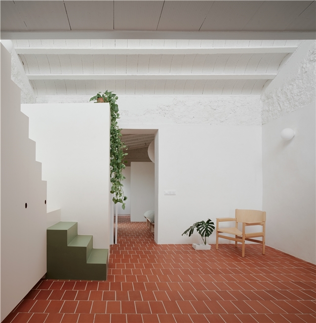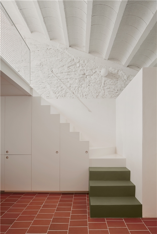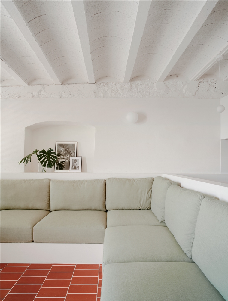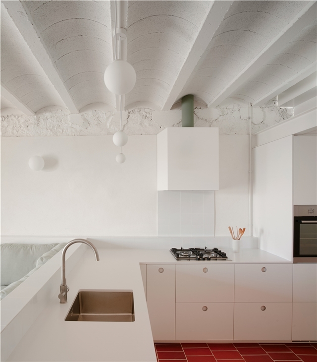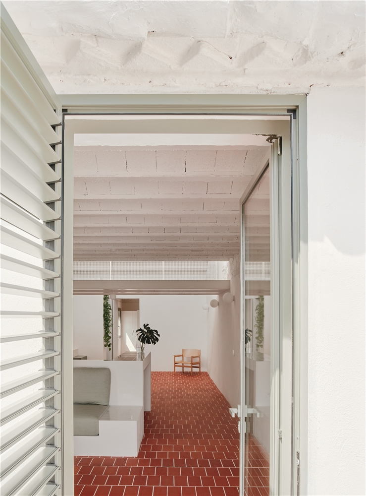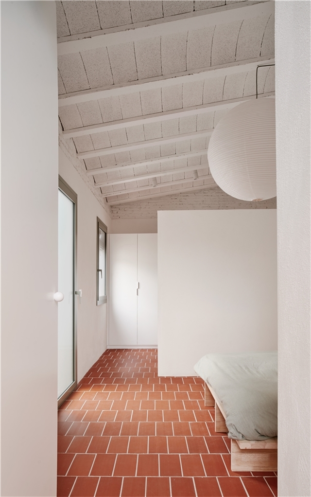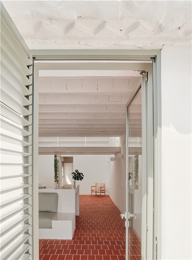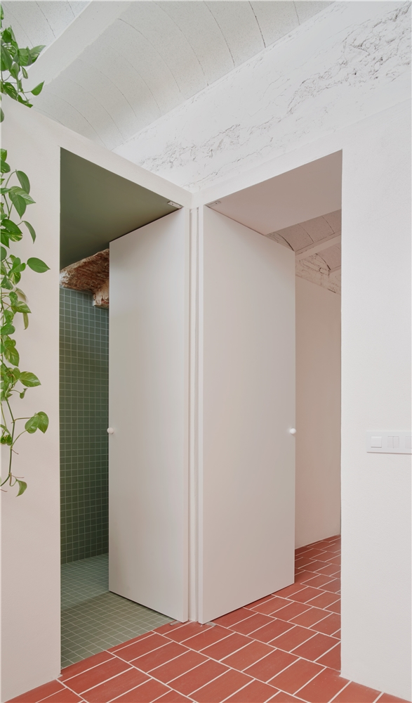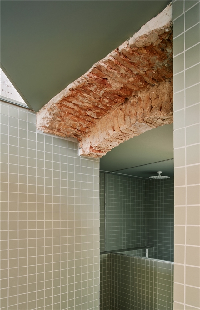 La elección de materiales y la paleta cromática dialogan con la identidad original del edificio, estableciendo un vínculo claro entre pasado y presente. El pavimento de rasilla, tradicionalmente utilizada para rematar terrazas, refuerza la continuidad material entre interior y exterior y, junto con la gran altura libre y la mejora de la iluminación natural, contribuye a que el interior se perciba como una gran terraza habitable.