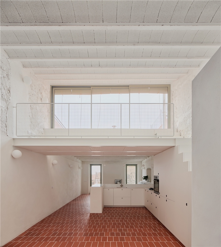 Se derriban y reconstruyen las cubiertas, que se encontraban en muy mal estado, para mejorar la iluminación natural y el rendimiento energético, generando nuevas pendientes que permiten habilitar una terraza desde la que, a lo lejos, se divisa el mar. Las antiguas golfas desaparecen para dar lugar a un altillo abierto que funciona como estudio y da acceso a la terraza superior. Este espacio actúa como transición entre interior y exterior, prolonga las visuales y aprovecha la máxima altura disponible.