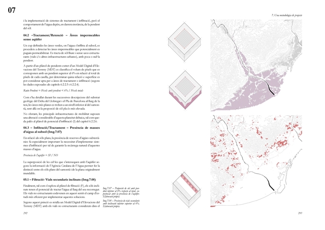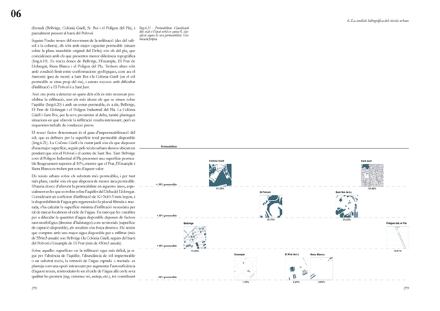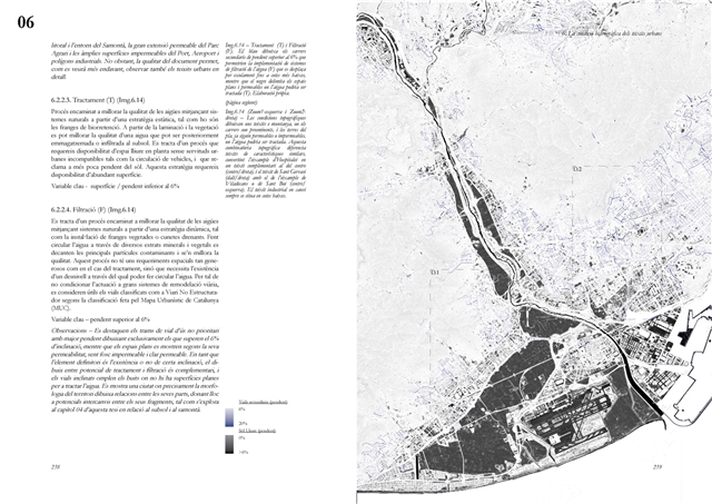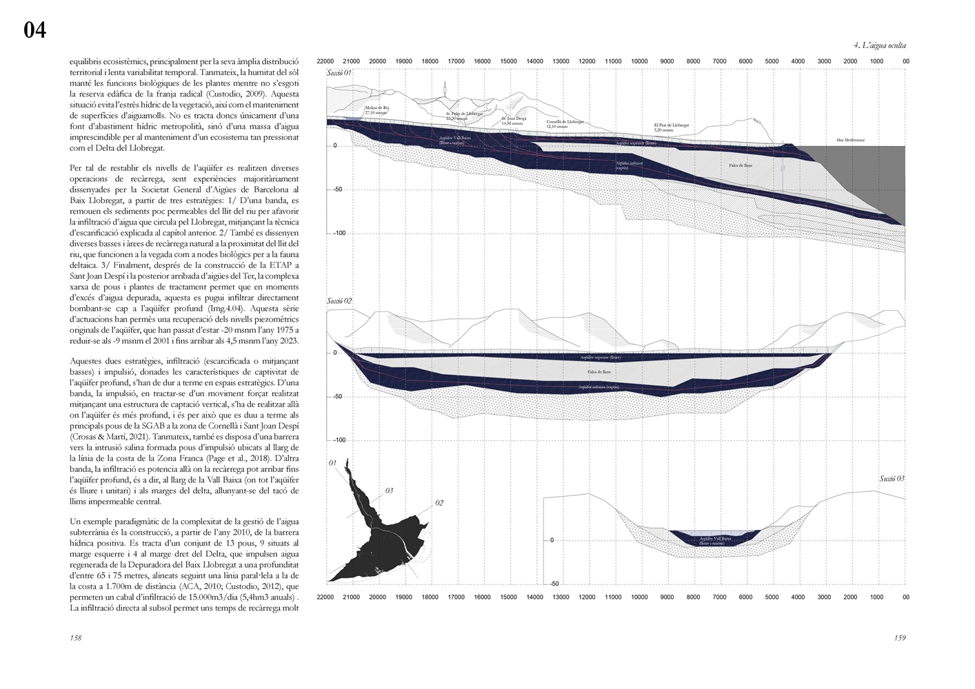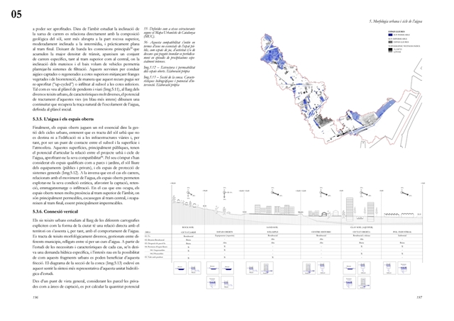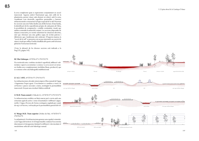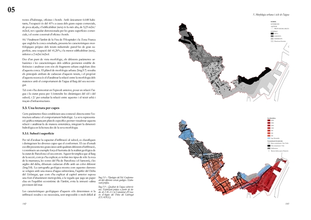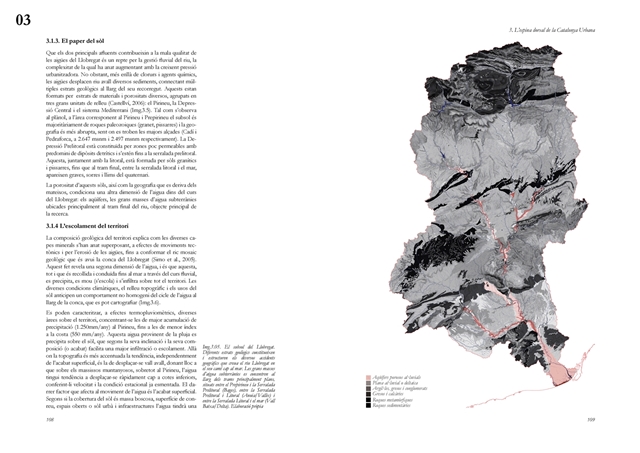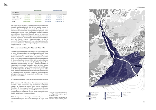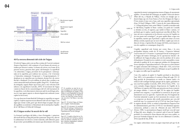 La dimensión subterránea del sistema se examina mediante el análisis del acuífero (masa libre superficial y masa cautiva profunda), cuya dinámica hidrodinámica se halla fuertemente afectada por la urbanización sobre suelos permeables. La reducción de la recarga natural y la necesidad de dispositivos artificiales para evitar la intrusión salina evidencian los desajustes sistémicos del modelo vigente. La lectura seccional permite identificar ámbitos estratégicos de intervención en rieras laterales y tejidos industriales, proponiendo soluciones de infiltración, renaturalización y captación pluvial orientadas a restituir funciones hidrológicas sin incrementar la complejidad infraestructural.