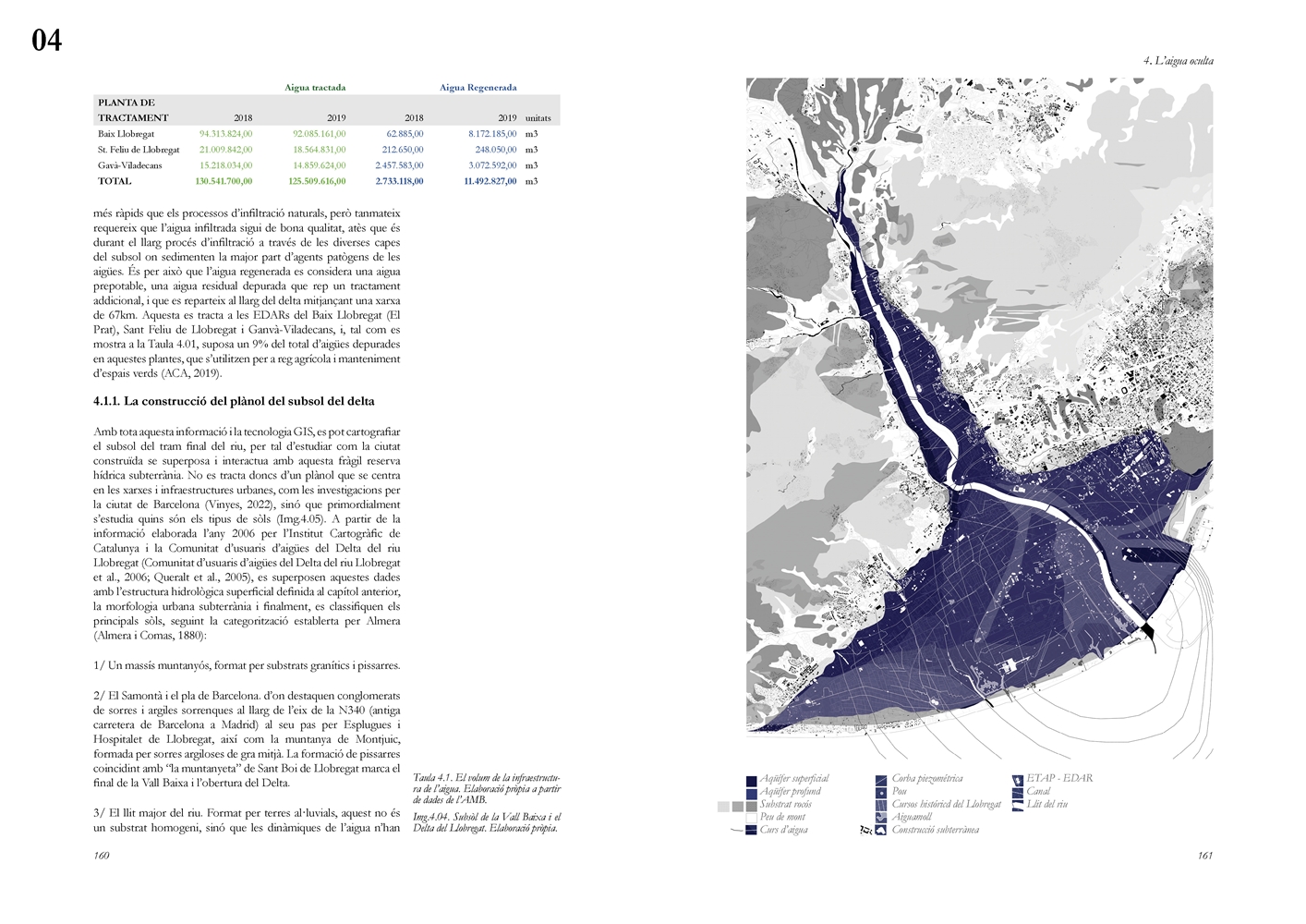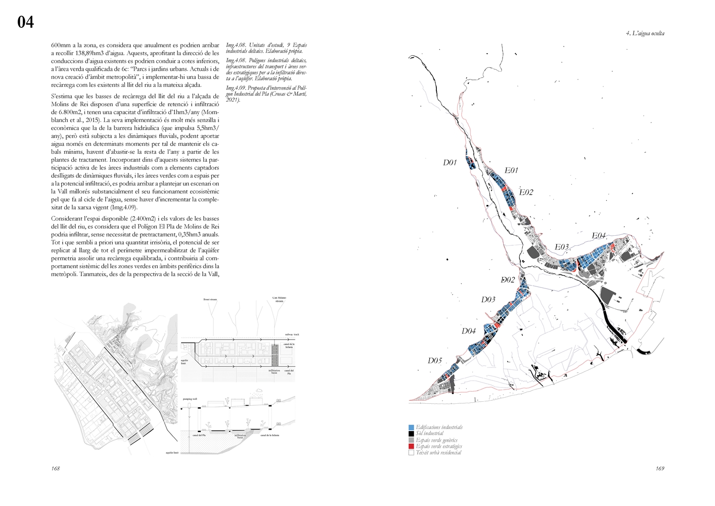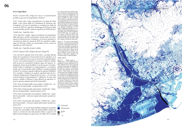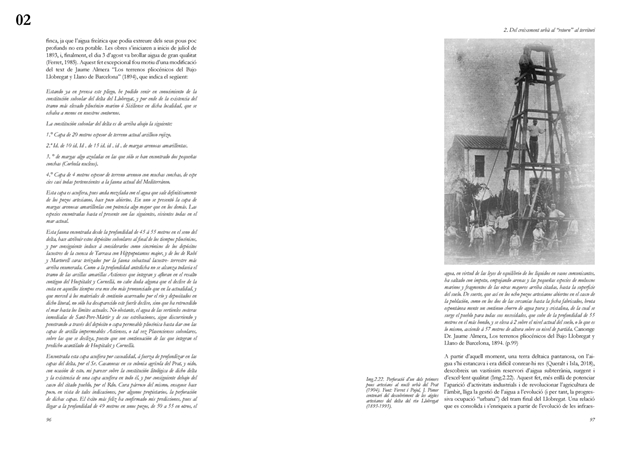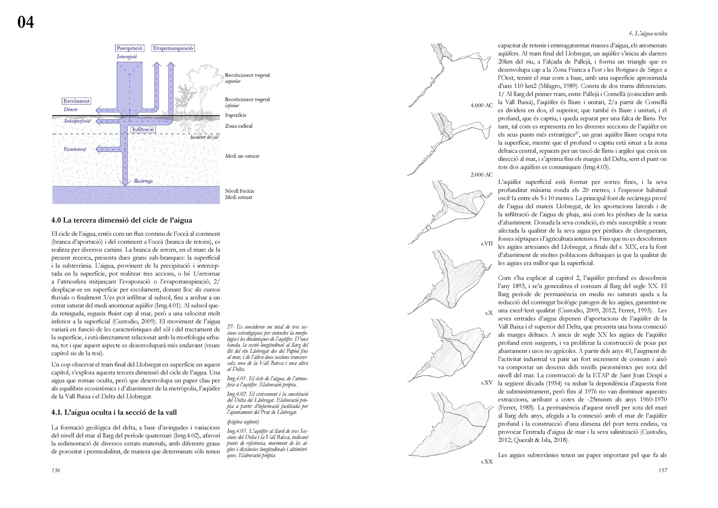 La dimensión subterránea del sistema se examina mediante el análisis del acuífero (masa libre superficial y masa cautiva profunda), cuya dinámica hidrodinámica se halla fuertemente afectada por la urbanización sobre suelos permeables. La reducción de la recarga natural y la necesidad de dispositivos artificiales para evitar la intrusión salina evidencian los desajustes sistémicos del modelo vigente. La lectura seccional permite identificar ámbitos estratégicos de intervención en rieras laterales y tejidos industriales, proponiendo soluciones de infiltración, renaturalización y captación pluvial orientadas a restituir funciones hidrológicas sin incrementar la complejidad infraestructural.