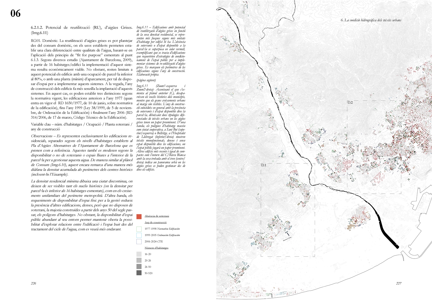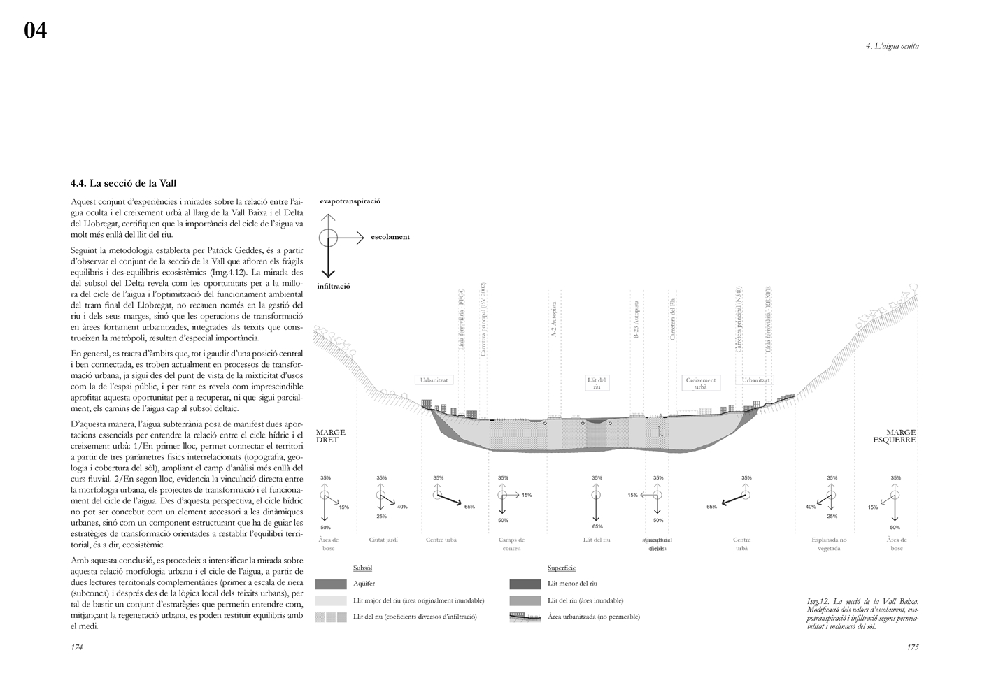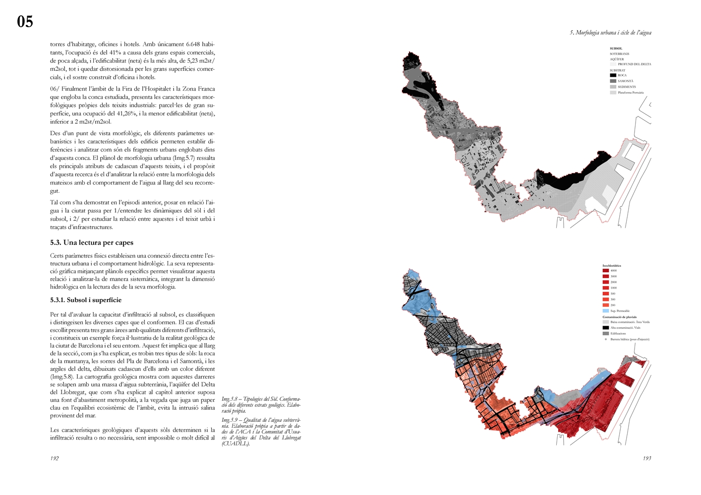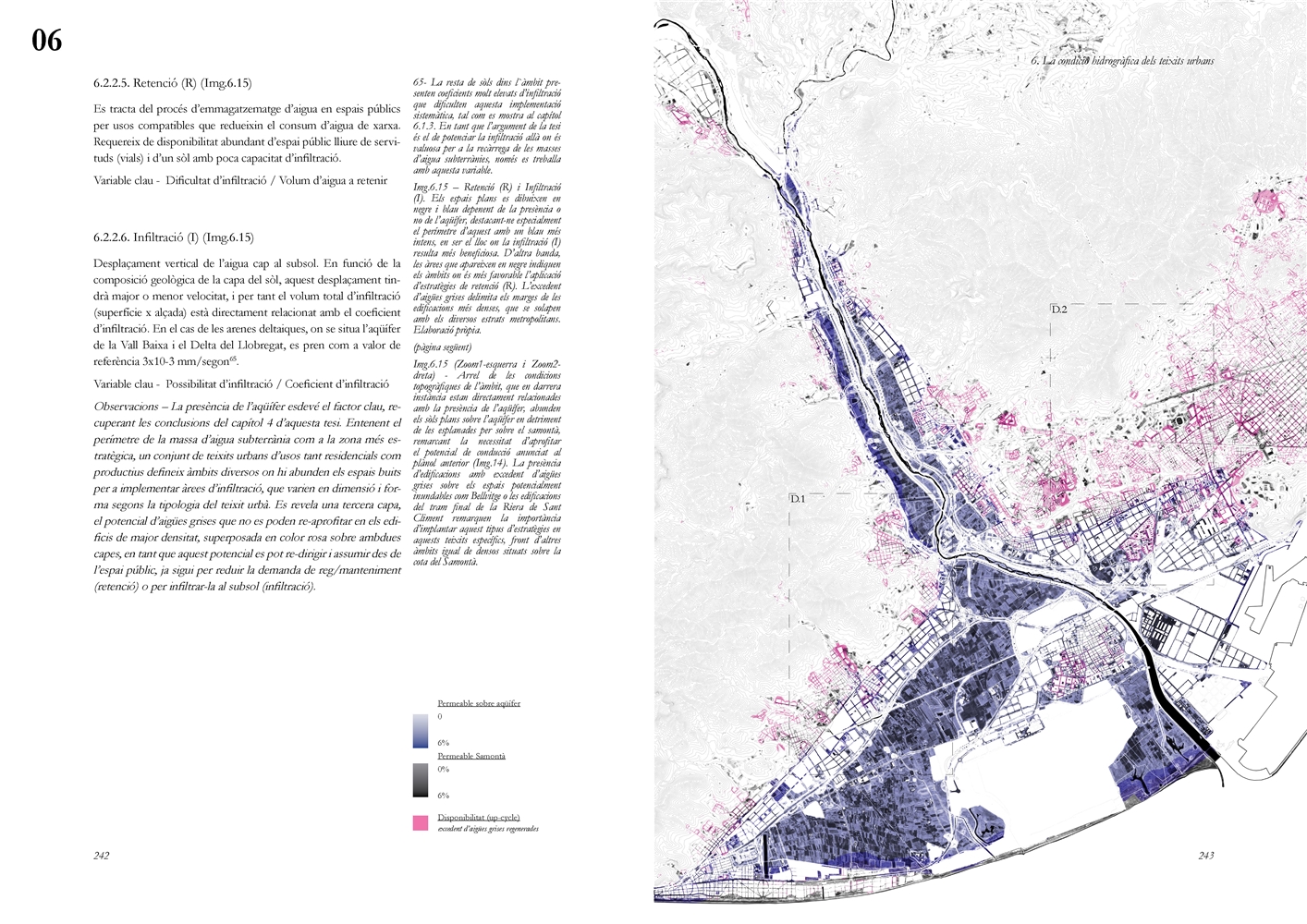 La dimensión subterránea del sistema se examina mediante el análisis del acuífero (masa libre superficial y masa cautiva profunda), cuya dinámica hidrodinámica se halla fuertemente afectada por la urbanización sobre suelos permeables. La reducción de la recarga natural y la necesidad de dispositivos artificiales para evitar la intrusión salina evidencian los desajustes sistémicos del modelo vigente. La lectura seccional permite identificar ámbitos estratégicos de intervención en rieras laterales y tejidos industriales, proponiendo soluciones de infiltración, renaturalización y captación pluvial orientadas a restituir funciones hidrológicas sin incrementar la complejidad infraestructural.