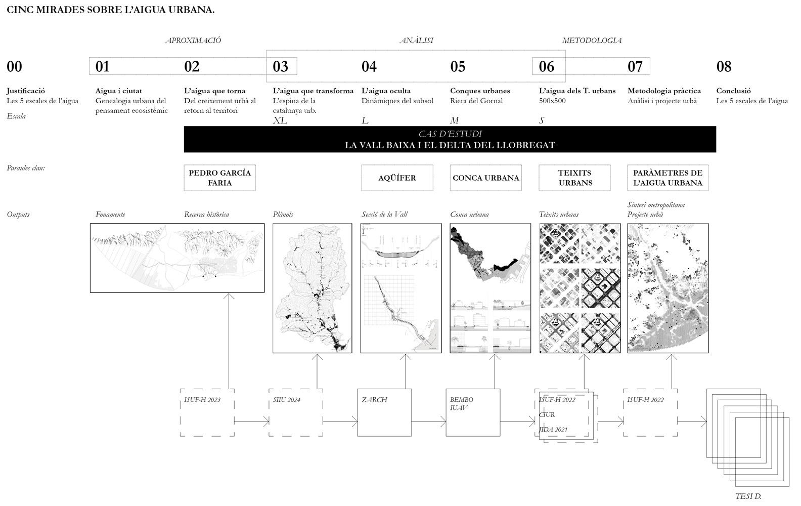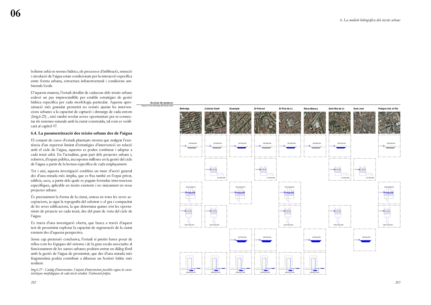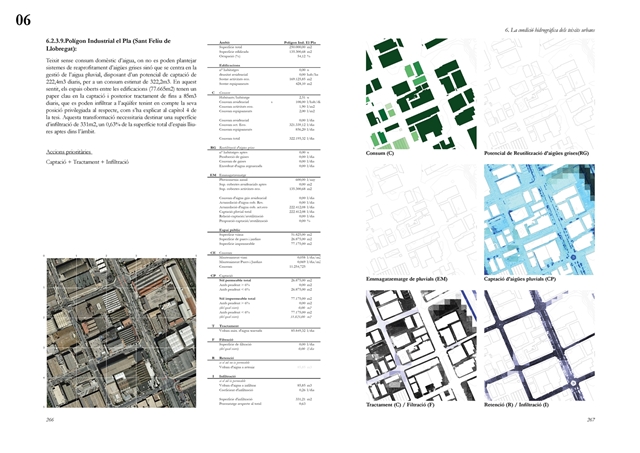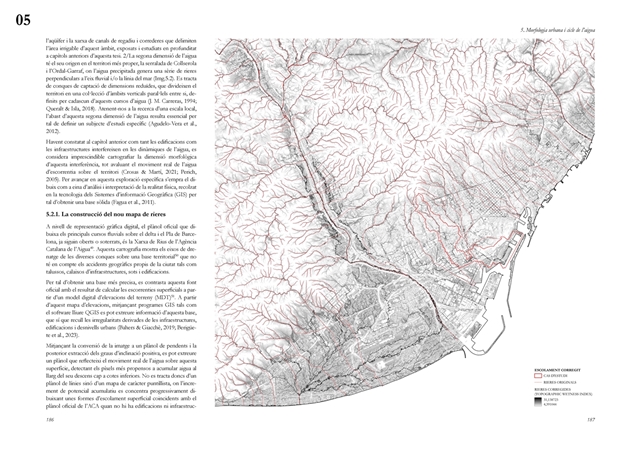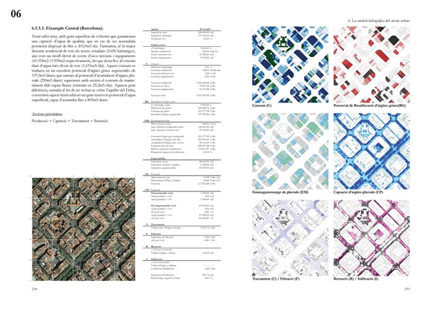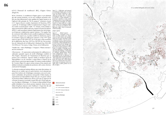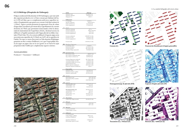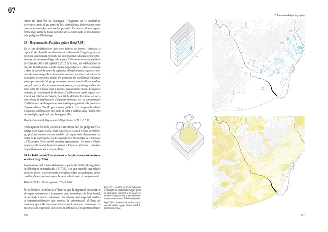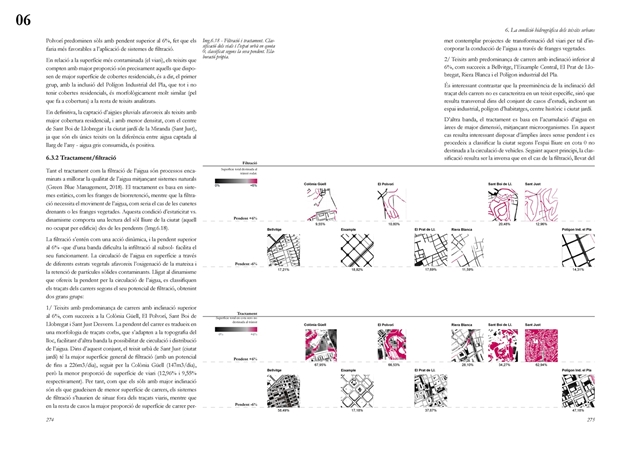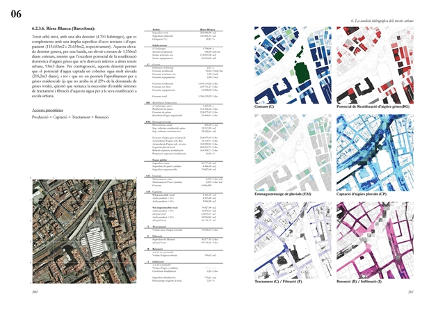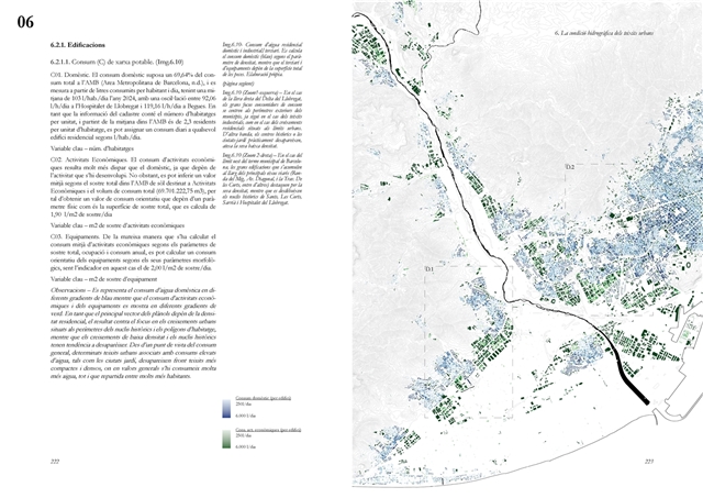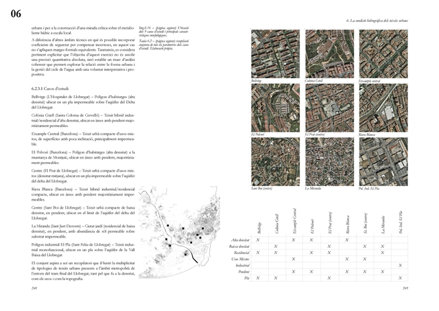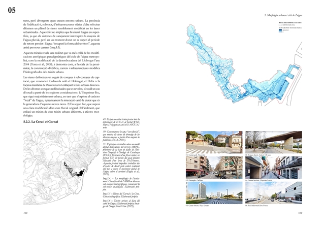 Finalmente, la investigación desarrolla una metodología transferible basada en seis acciones (consumo, captación, tratamiento, filtración, retención e infiltración), aplicada comparativamente a diversos tejidos del Área Metropolitana de Barcelona mediante análisis GIS y verificación manual. El resultado es un atlas hidromorfológico que permite establecer relaciones entre forma urbana y metabolismo hídrico y fundamentar criterios operativos de proyecto. En conjunto, la tesis consolida un cambio de paradigma que sitúa el agua de proximidad como elemento estructurante del diseño y la planificación urbana, integrando escala territorial, morfología urbana y dinámica hidrológica en un marco ecosistémico coherente.