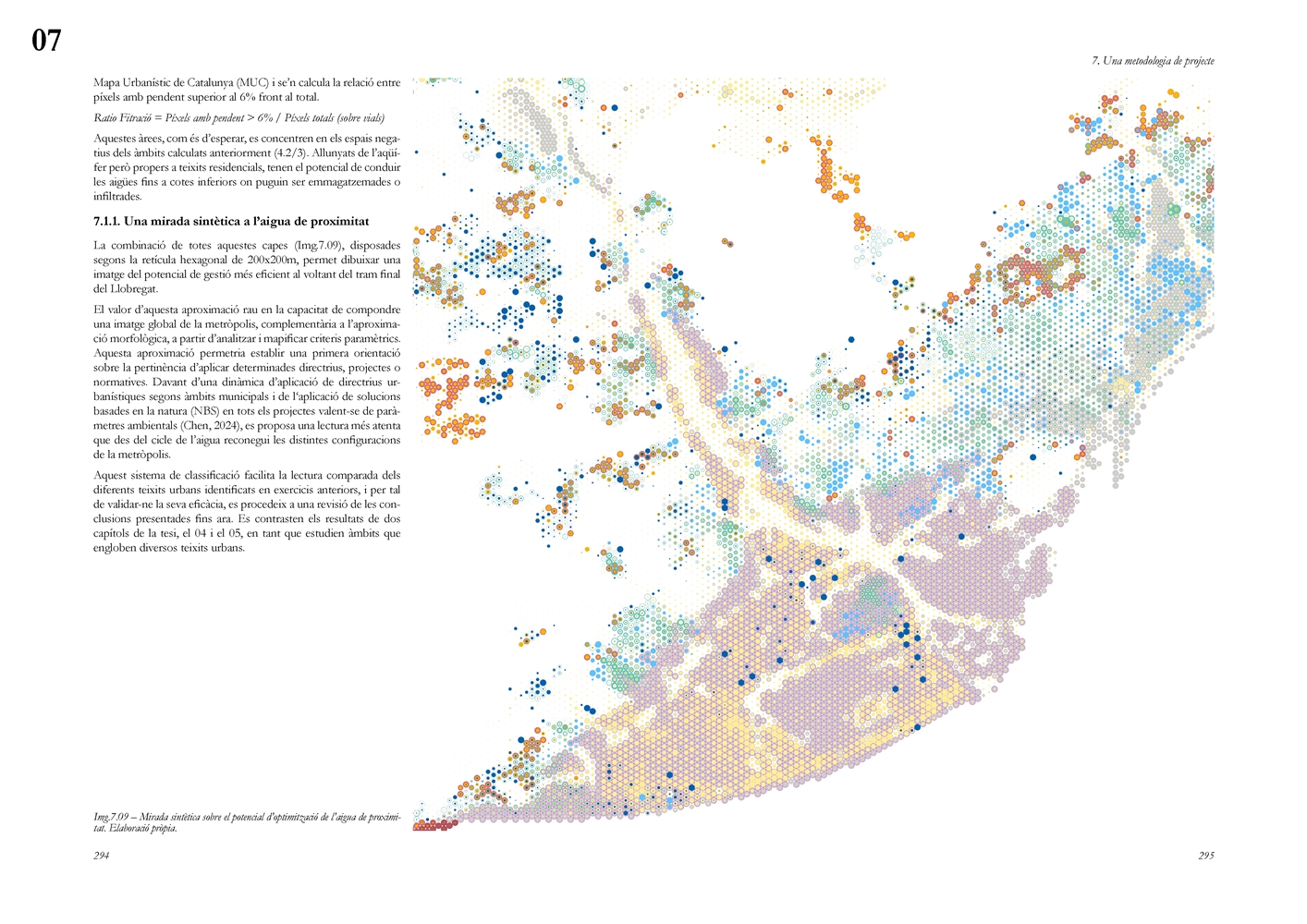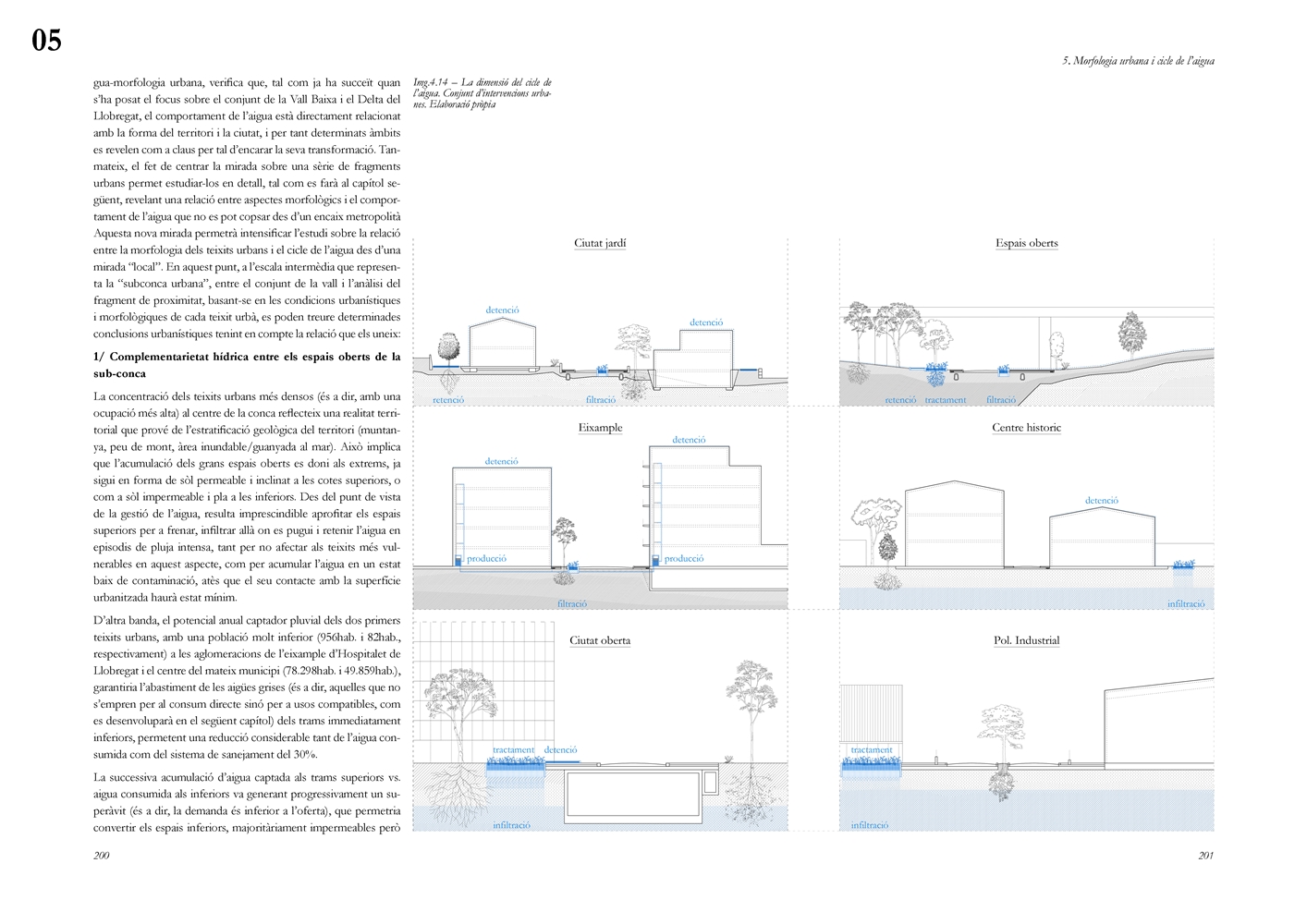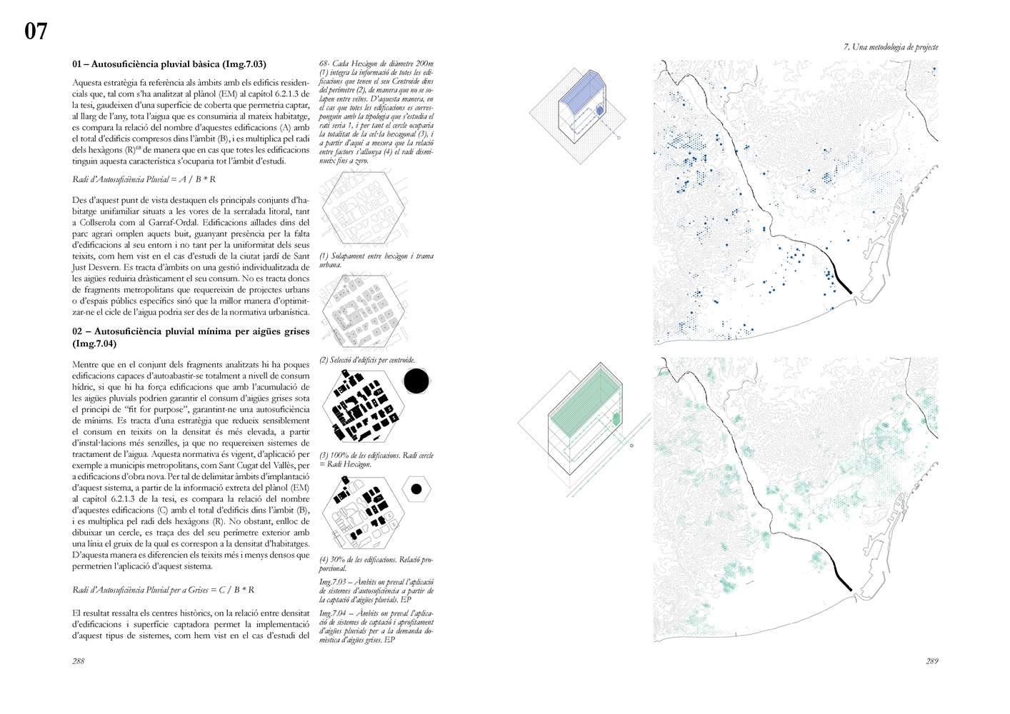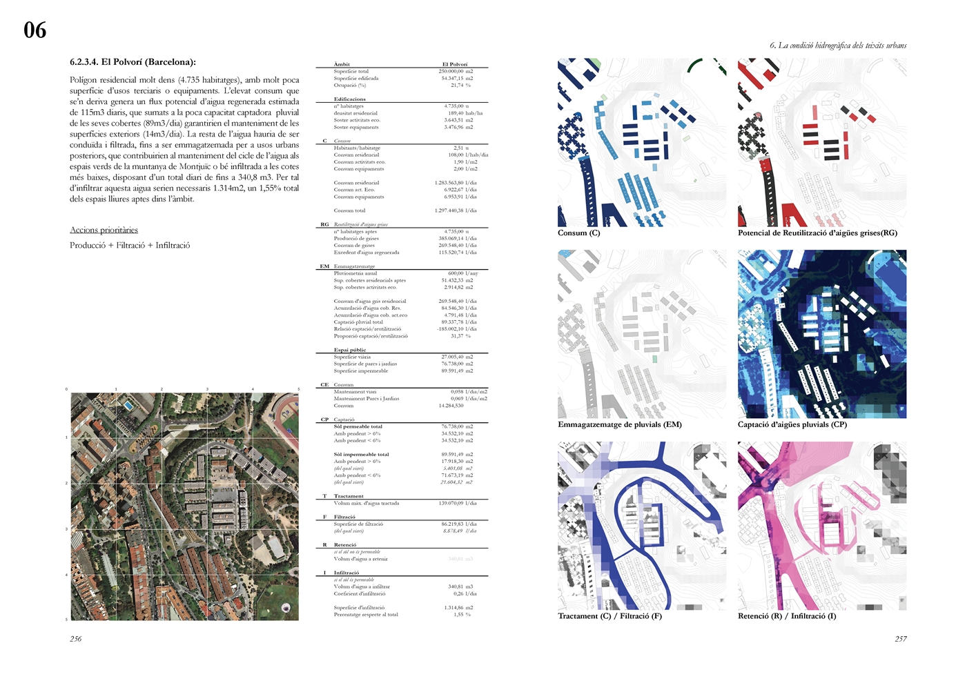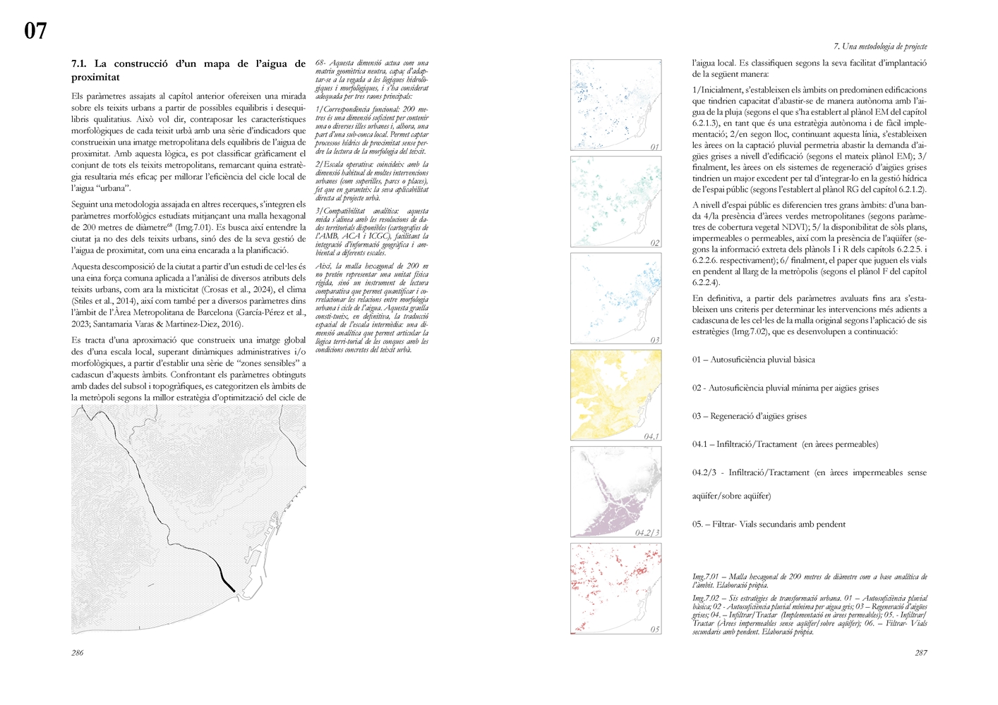 Finalmente, la investigación desarrolla una metodología transferible basada en seis acciones (consumo, captación, tratamiento, filtración, retención e infiltración), aplicada comparativamente a diversos tejidos del Área Metropolitana de Barcelona mediante análisis GIS y verificación manual. El resultado es un atlas hidromorfológico que permite establecer relaciones entre forma urbana y metabolismo hídrico y fundamentar criterios operativos de proyecto. En conjunto, la tesis consolida un cambio de paradigma que sitúa el agua de proximidad como elemento estructurante del diseño y la planificación urbana, integrando escala territorial, morfología urbana y dinámica hidrológica en un marco ecosistémico coherente.