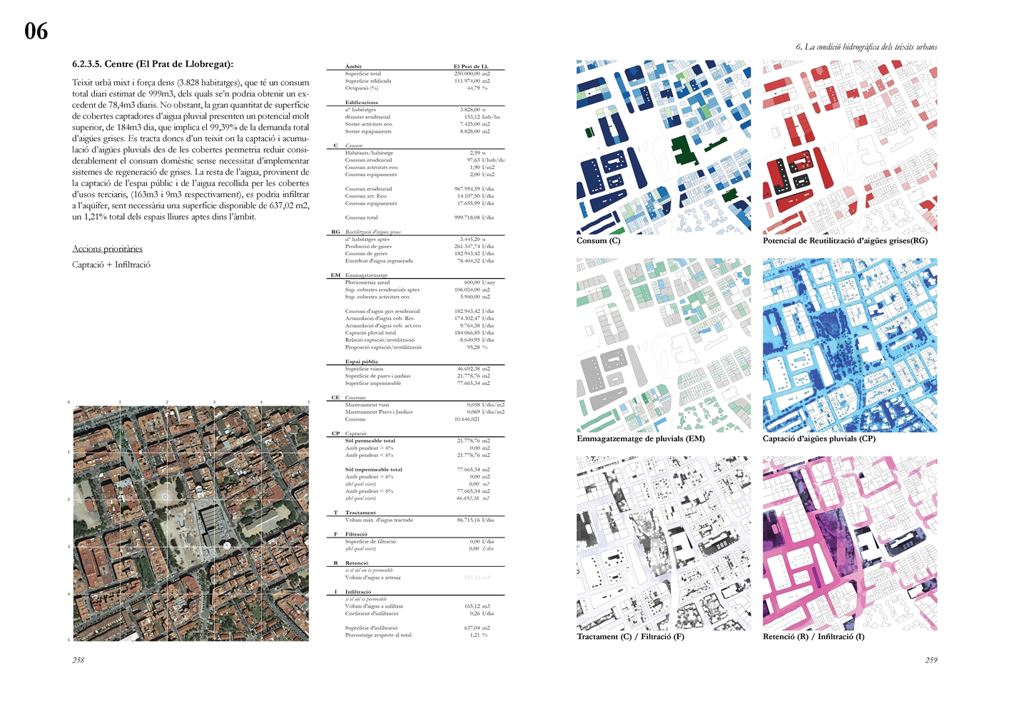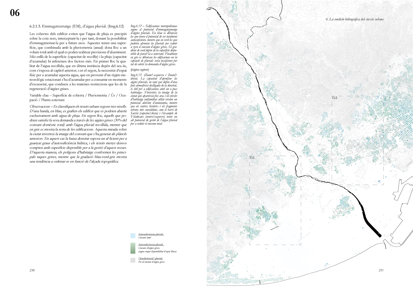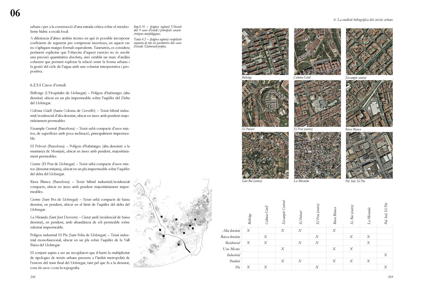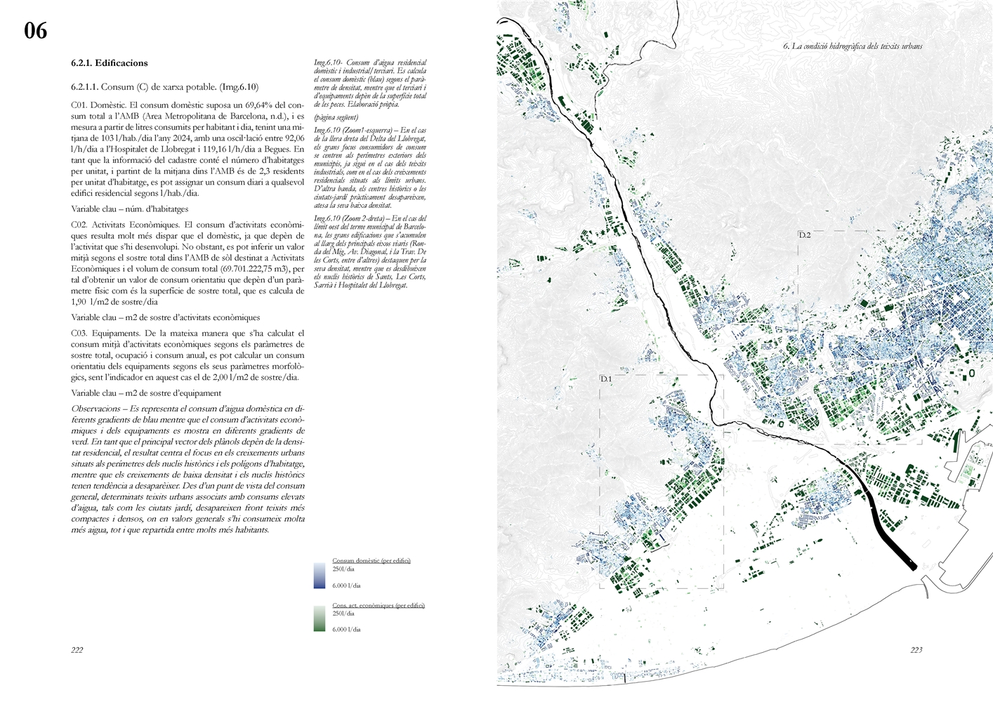 Finalmente, la investigación desarrolla una metodología transferible basada en seis acciones (consumo, captación, tratamiento, filtración, retención e infiltración), aplicada comparativamente a diversos tejidos del Área Metropolitana de Barcelona mediante análisis GIS y verificación manual. El resultado es un atlas hidromorfológico que permite establecer relaciones entre forma urbana y metabolismo hídrico y fundamentar criterios operativos de proyecto. En conjunto, la tesis consolida un cambio de paradigma que sitúa el agua de proximidad como elemento estructurante del diseño y la planificación urbana, integrando escala territorial, morfología urbana y dinámica hidrológica en un marco ecosistémico coherente.