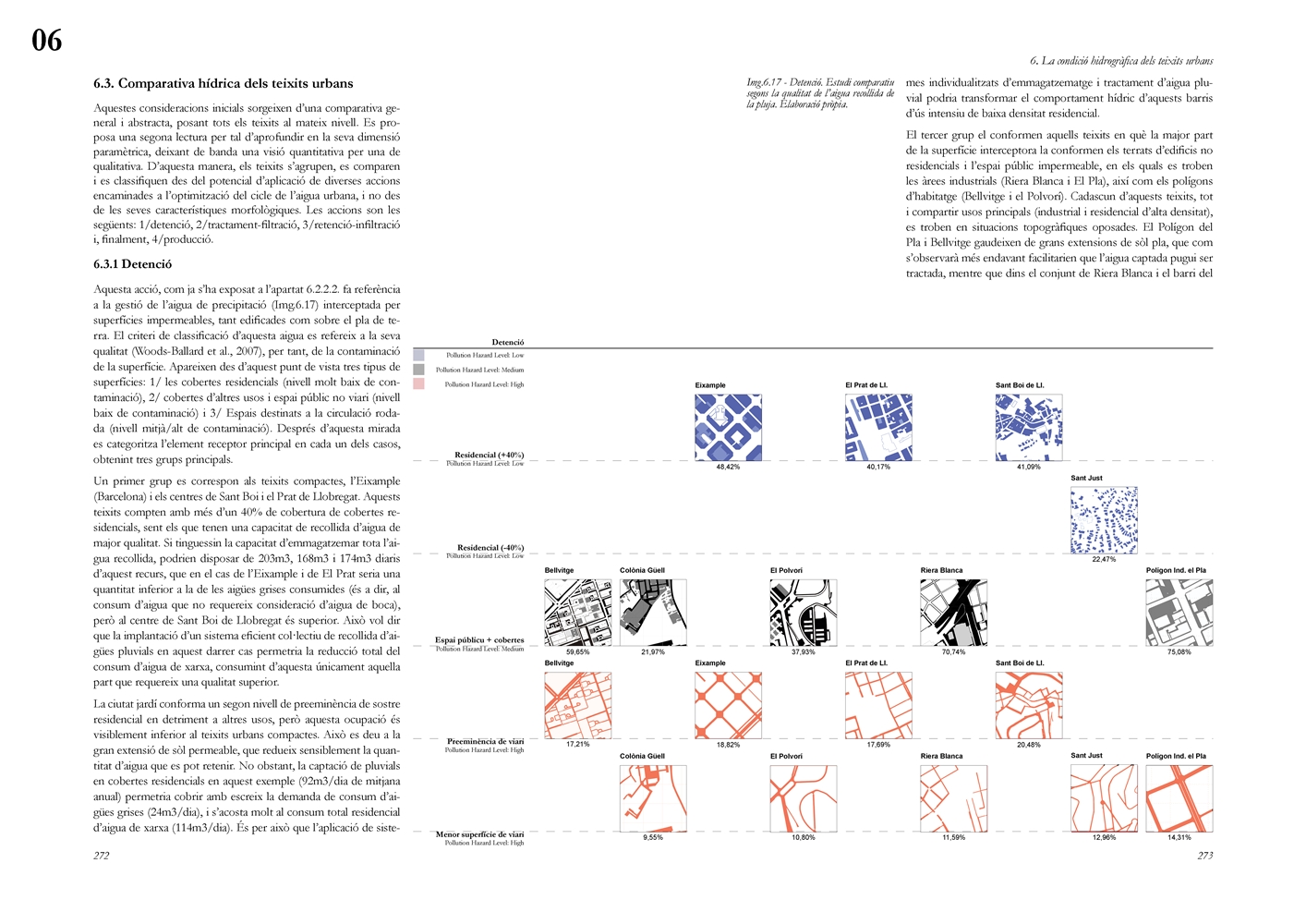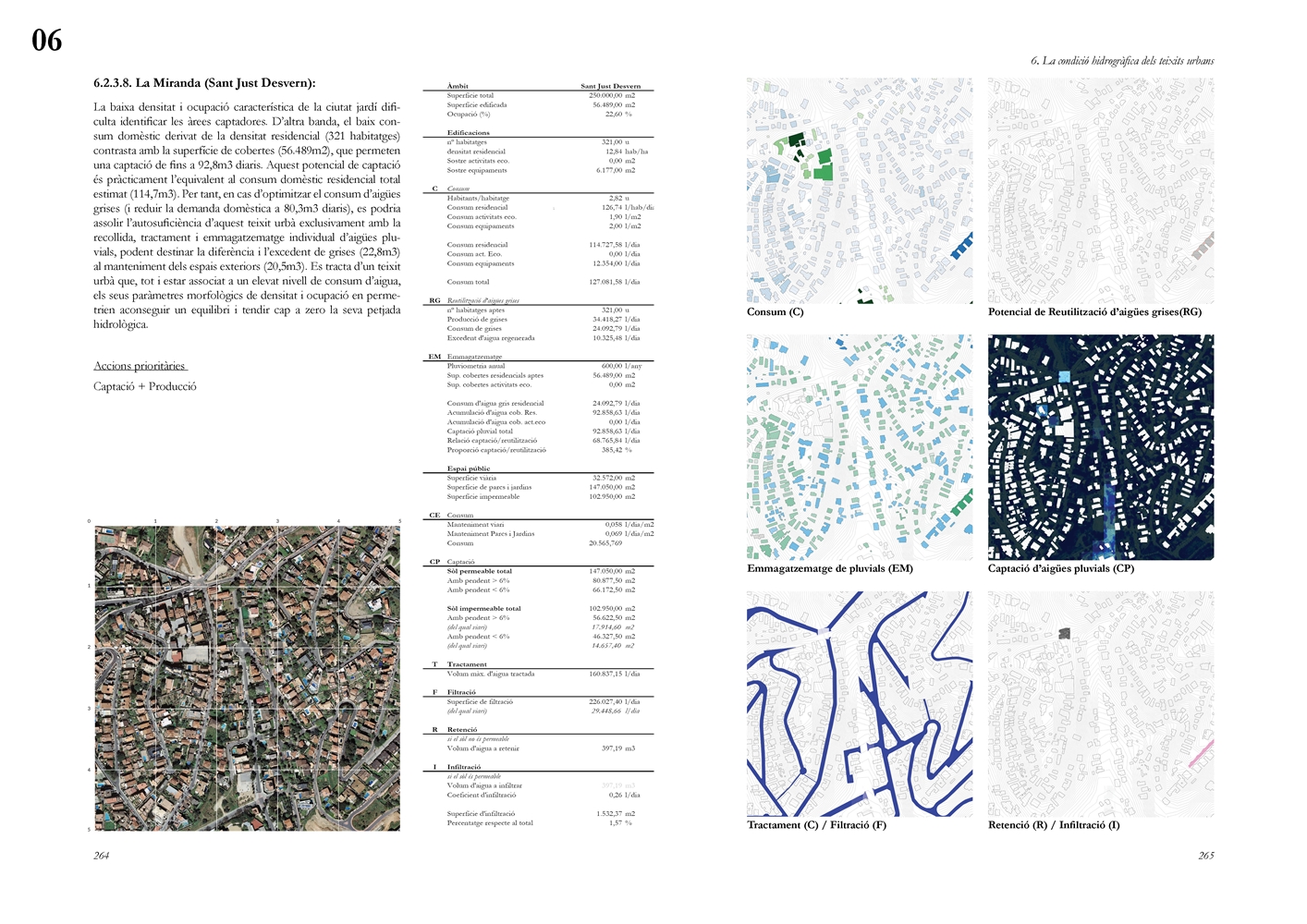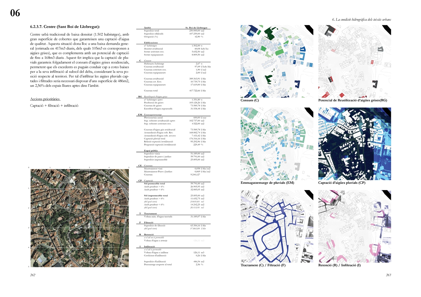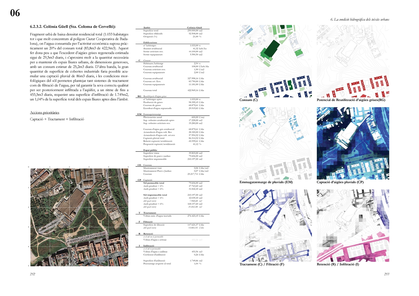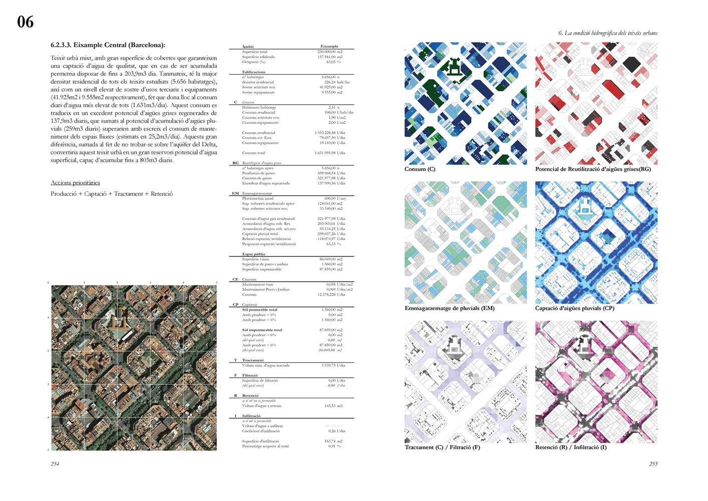 Finalmente, la investigación desarrolla una metodología transferible basada en seis acciones (consumo, captación, tratamiento, filtración, retención e infiltración), aplicada comparativamente a diversos tejidos del Área Metropolitana de Barcelona mediante análisis GIS y verificación manual. El resultado es un atlas hidromorfológico que permite establecer relaciones entre forma urbana y metabolismo hídrico y fundamentar criterios operativos de proyecto. En conjunto, la tesis consolida un cambio de paradigma que sitúa el agua de proximidad como elemento estructurante del diseño y la planificación urbana, integrando escala territorial, morfología urbana y dinámica hidrológica en un marco ecosistémico coherente.
