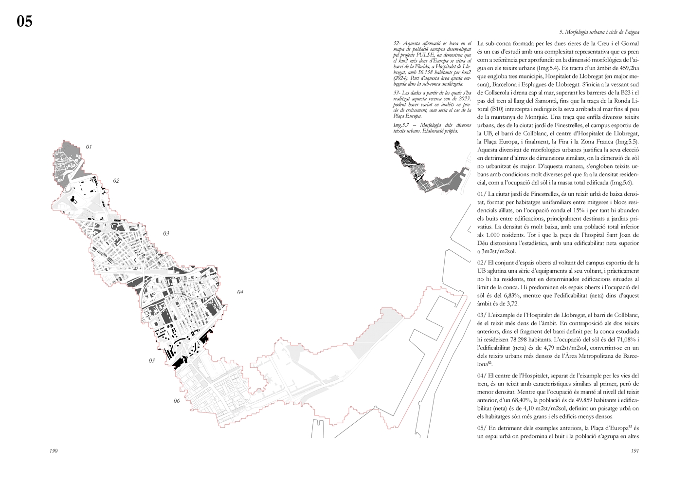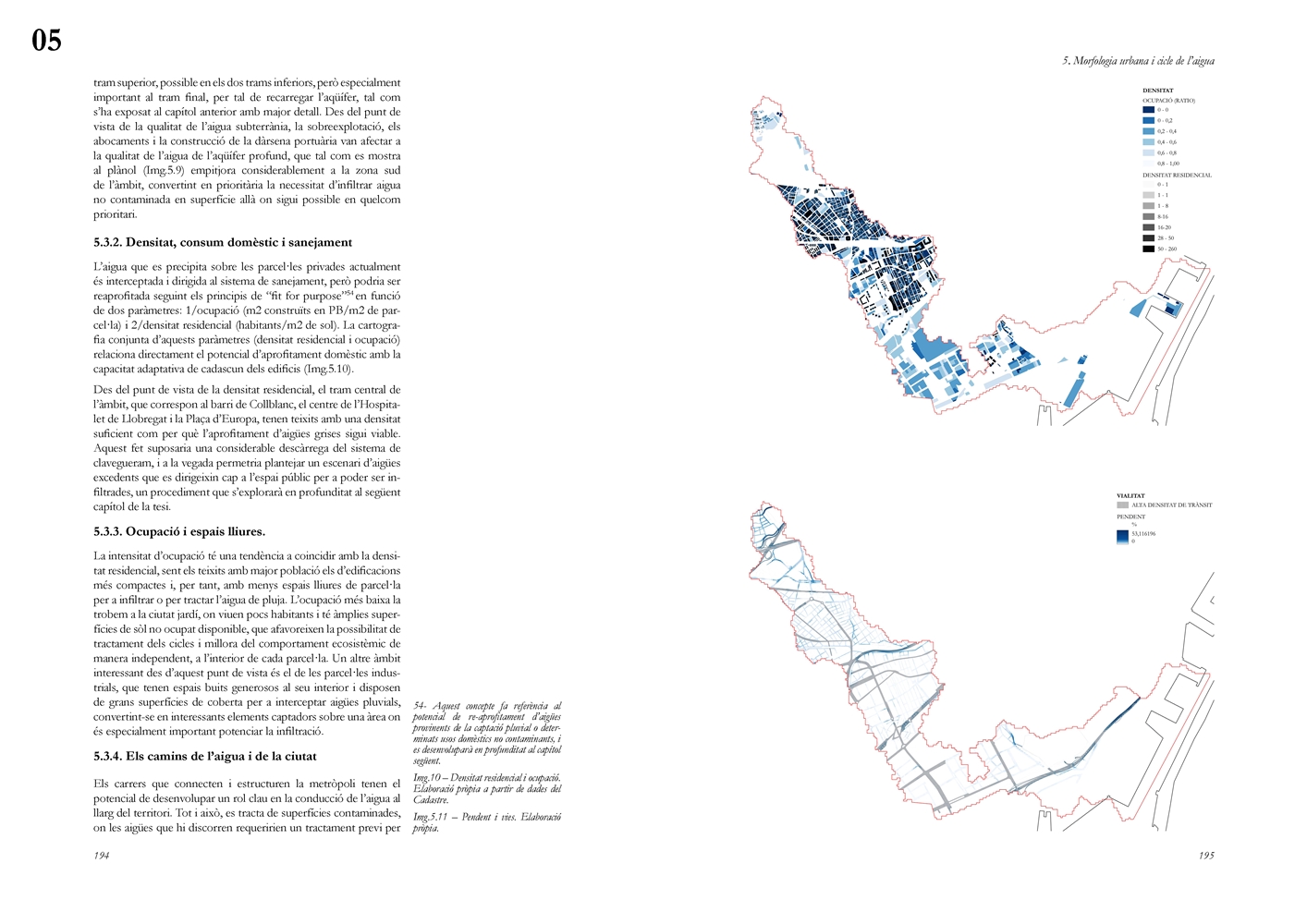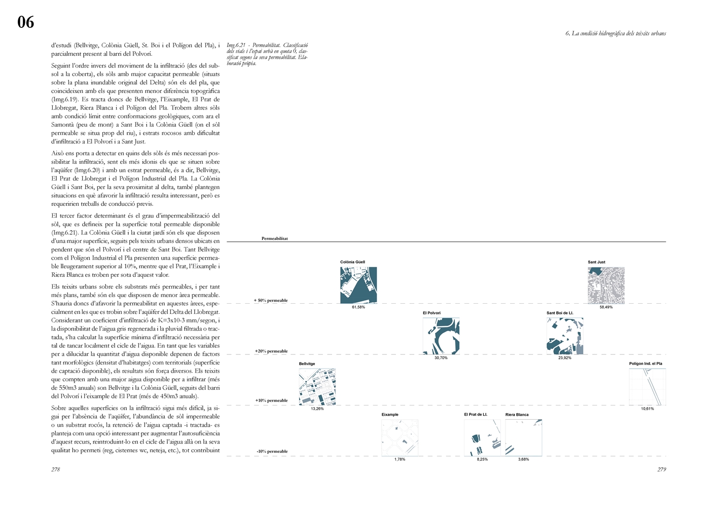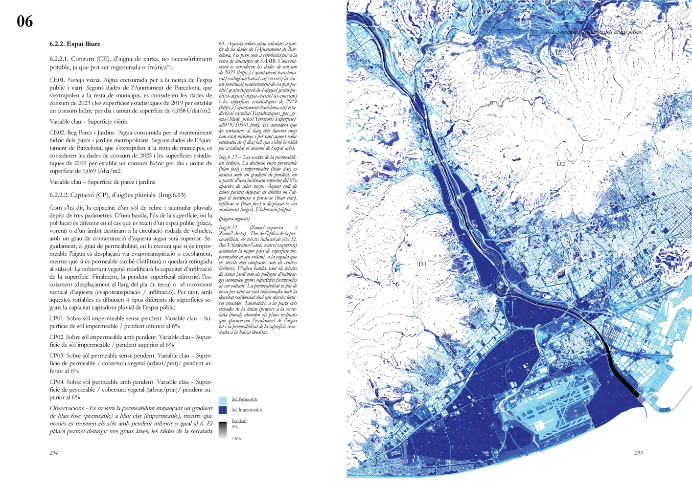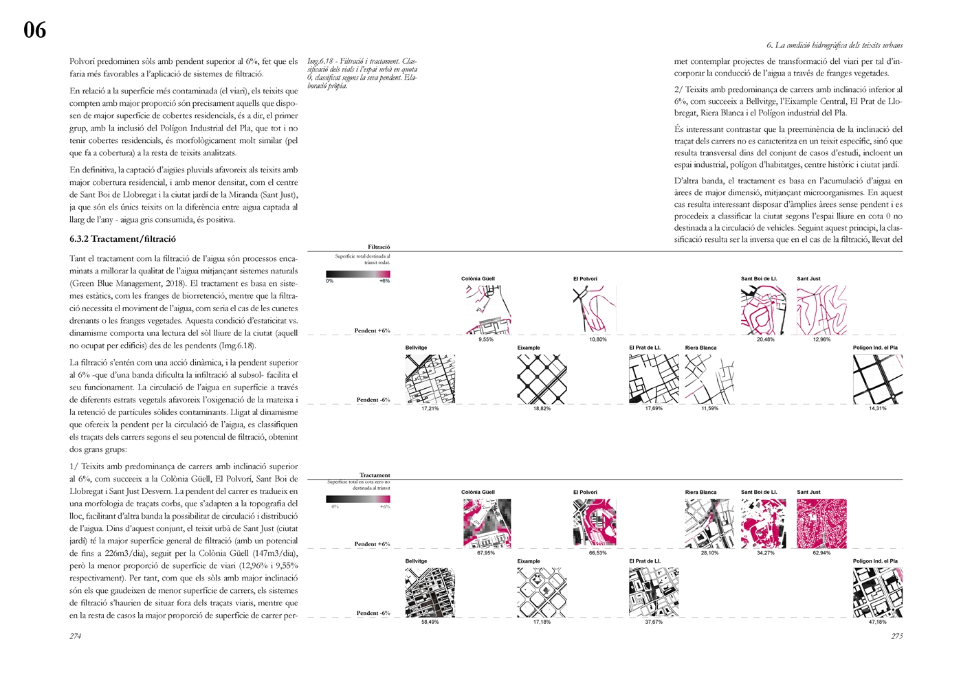 Finalmente, la investigación desarrolla una metodología transferible basada en seis acciones (consumo, captación, tratamiento, filtración, retención e infiltración), aplicada comparativamente a diversos tejidos del Área Metropolitana de Barcelona mediante análisis GIS y verificación manual. El resultado es un atlas hidromorfológico que permite establecer relaciones entre forma urbana y metabolismo hídrico y fundamentar criterios operativos de proyecto. En conjunto, la tesis consolida un cambio de paradigma que sitúa el agua de proximidad como elemento estructurante del diseño y la planificación urbana, integrando escala territorial, morfología urbana y dinámica hidrológica en un marco ecosistémico coherente.