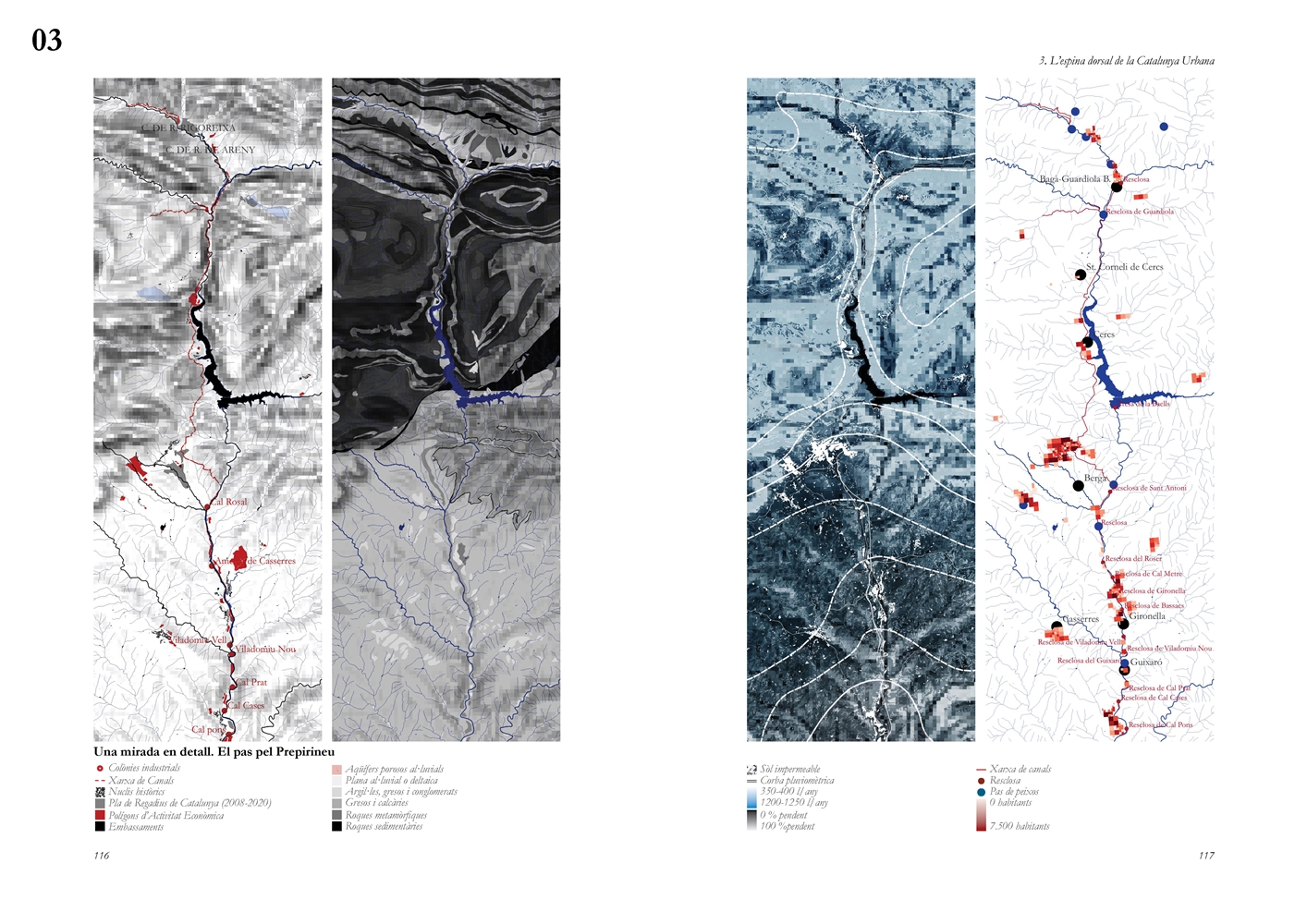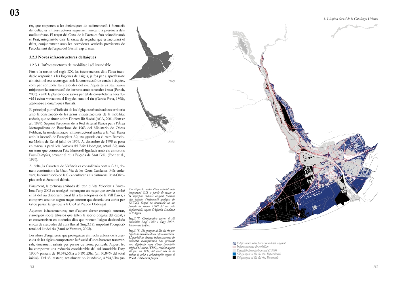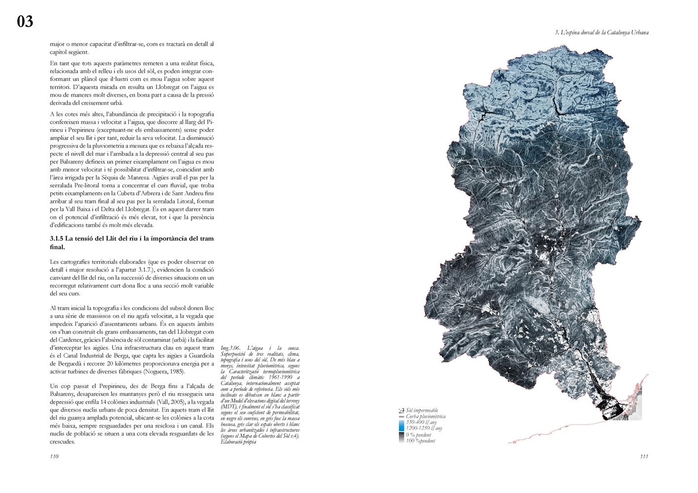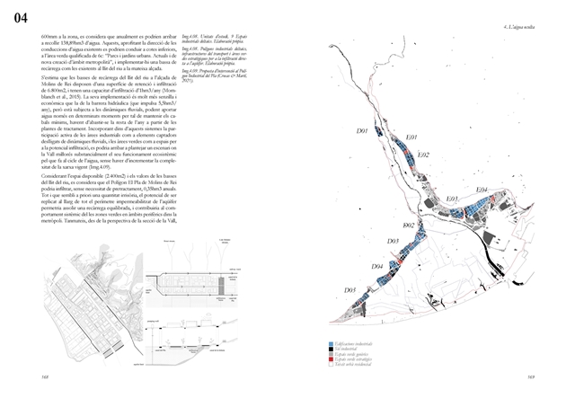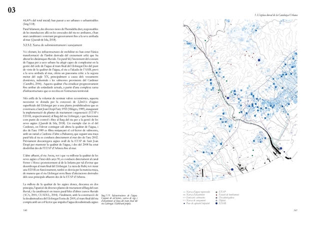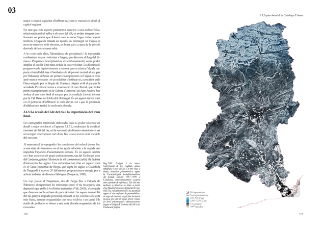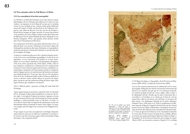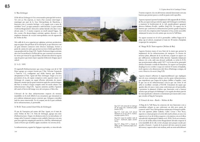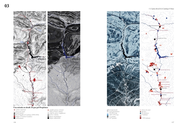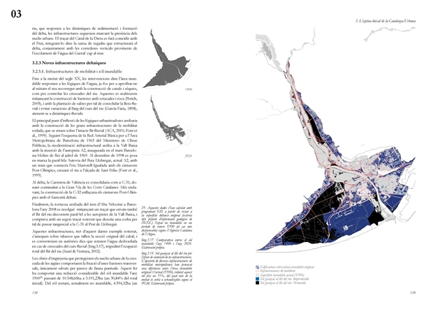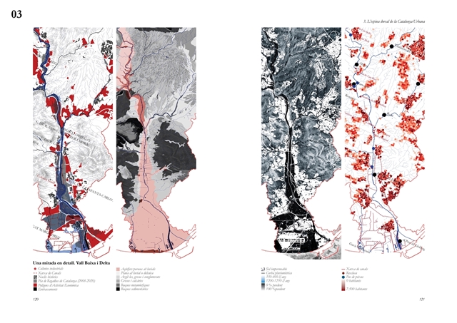 La investigación aborda posteriormente el Llobregat contemporáneo como estructura vertebradora de la Catalunya urbana, entendida tanto en su dimensión física como en su condición de sistema complejo de intercambios metabólicos. A partir de una lectura integral de cuenca, se analiza la Vall Baixa y el Delta como espacio estratificado donde confluyen capas agrícolas, urbanas, infraestructurales y ambientales, bajo la tensión entre vacío productivo y presión urbanizadora. El estudio cartográfico y seccional pone de relieve cómo microrelieves, trazas hidráulicas, redes de riego y corredores ecológicos han condicionado históricamente la ocupación y continúan definiendo la lógica territorial del tramo final del río.