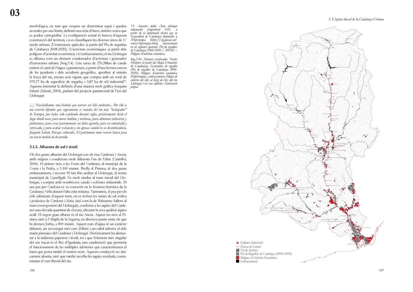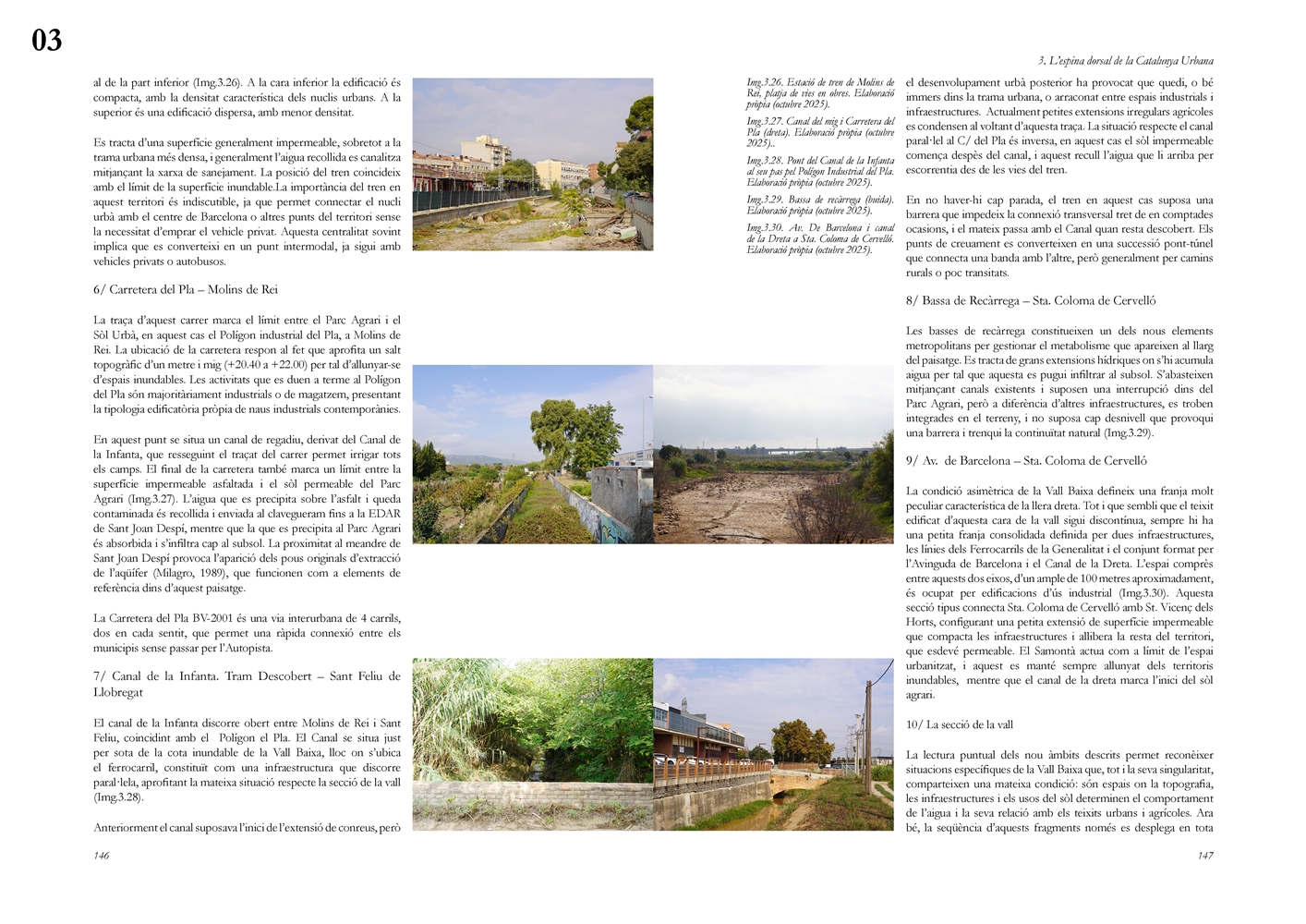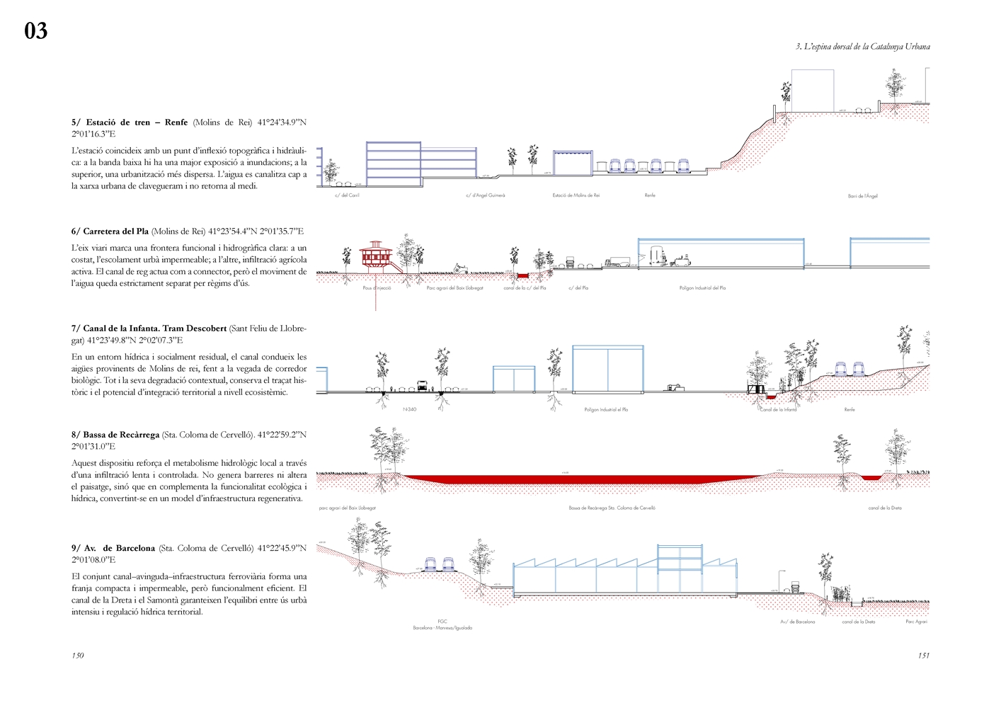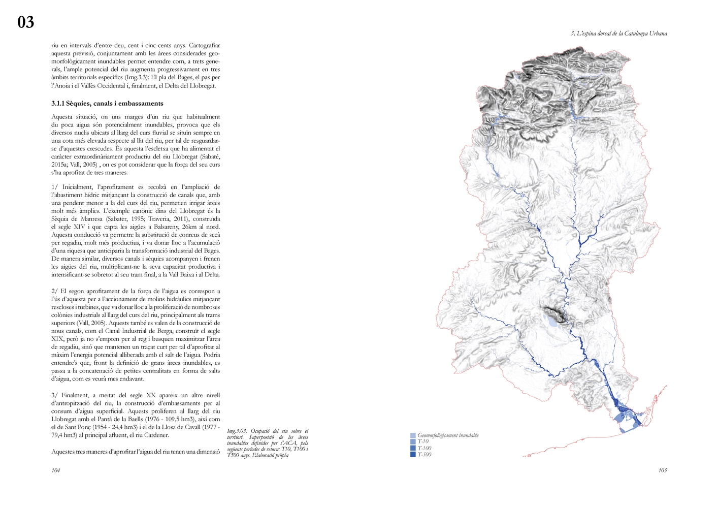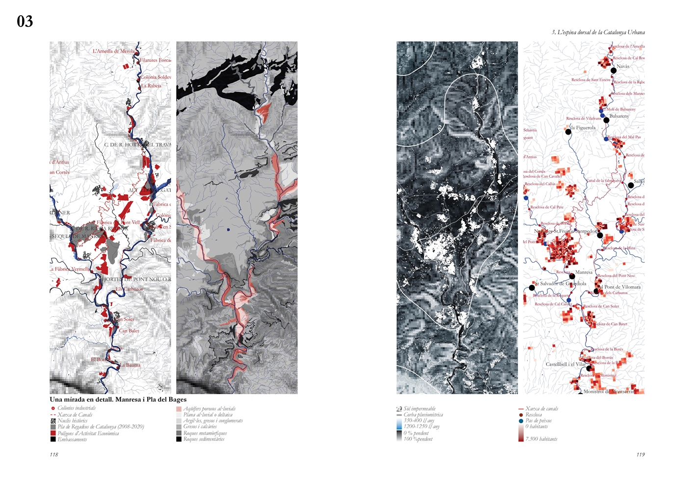 La investigación aborda posteriormente el Llobregat contemporáneo como estructura vertebradora de la Catalunya urbana, entendida tanto en su dimensión física como en su condición de sistema complejo de intercambios metabólicos. A partir de una lectura integral de cuenca, se analiza la Vall Baixa y el Delta como espacio estratificado donde confluyen capas agrícolas, urbanas, infraestructurales y ambientales, bajo la tensión entre vacío productivo y presión urbanizadora. El estudio cartográfico y seccional pone de relieve cómo microrelieves, trazas hidráulicas, redes de riego y corredores ecológicos han condicionado históricamente la ocupación y continúan definiendo la lógica territorial del tramo final del río.