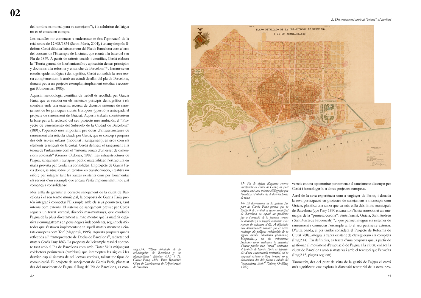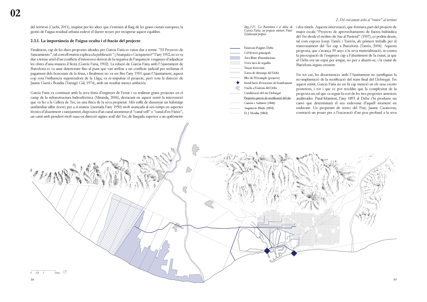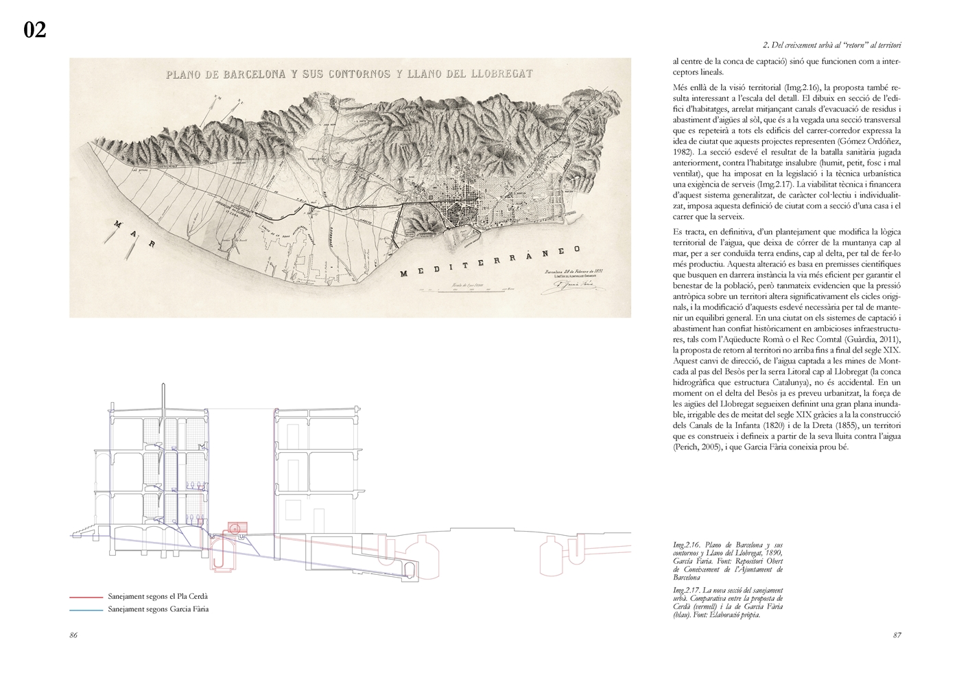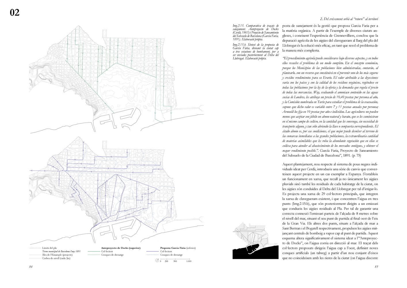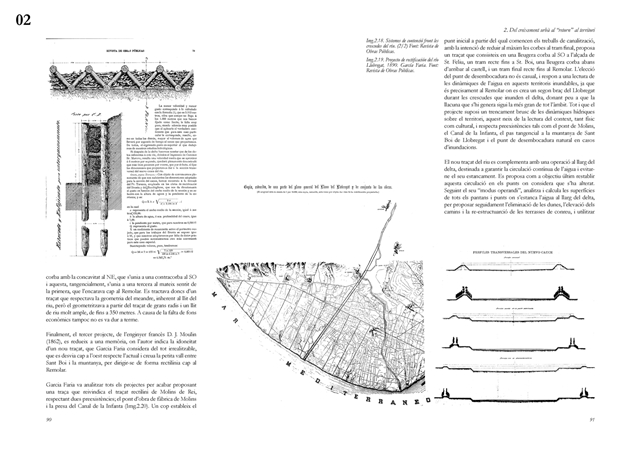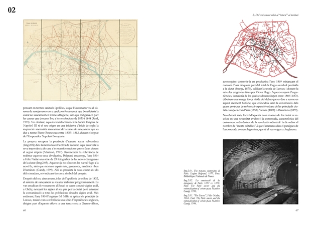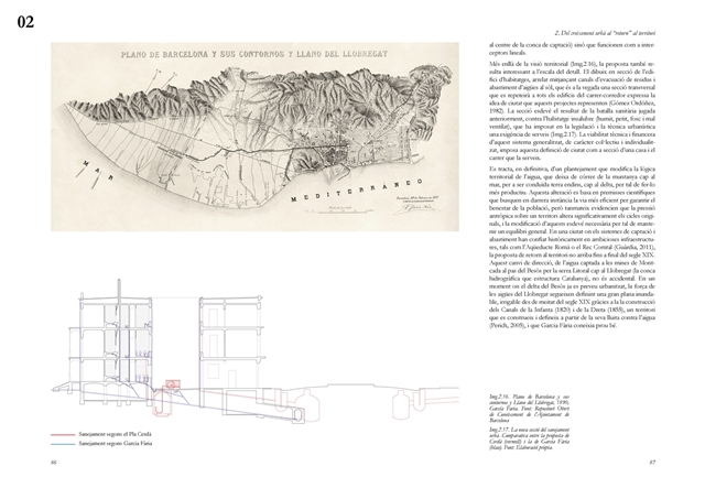 El segundo bloque analiza el papel estructurante del ciclo hidrológico en los procesos de transformación urbana europeos del siglo XIX y su traducción al caso de Barcelona. El modelo parisino se examina desde aproximaciones literarias, filosóficas y técnicas, evidenciando cómo el saneamiento moderno operó simultáneamente como respuesta sanitaria y como dispositivo político territorial, al reconfigurar los vínculos entre ciudad y campo mediante la valorización productiva de las aguas residuales. En este contexto, el Proyecto de Saneamiento del Subsuelo de Barcelona (1891) de Pere Garcia Fària, en diálogo crítico con el Plan Cerdà, se interpreta como una propuesta protoecológica que integra la estructura urbana con el delta del Llobregat y plantea el cierre del ciclo material a escala territorial. Junto con el Proyecto de Rectificación del Río Llobregat, constituye un antecedente de articulación urbano metropolitana basada en la gestión metabolista del agua, aun cuando no llegara a materializarse.