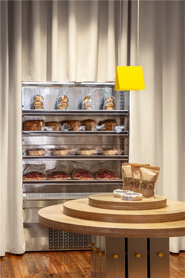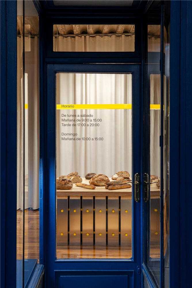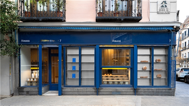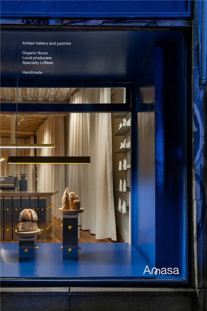 En el caso concreto de Amasa Santa Isabel, la intervención se centró en la recuperación de los escaparates originales del local, así como en la conservación del color azul característico de esta esquina madrileña. También se rehabilitó el pavimento de madera existente antes de introducir los fondos textiles y las piezas de mobiliario.
