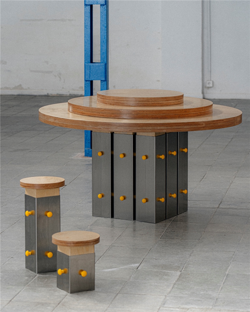 Cada base se compone por agregación de estos elementos tubulares, coronados por encimeras de formas y materiales variables, seleccionados en función de su uso específico: expositores, mesas auxiliares, puntos de cobro, etc. Los materiales empleados para estas superficies incluyen maderas, piedras o metales lacados, elegidos para realzar los distintos productos dispuestos sobre ellas.