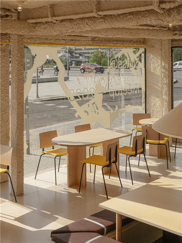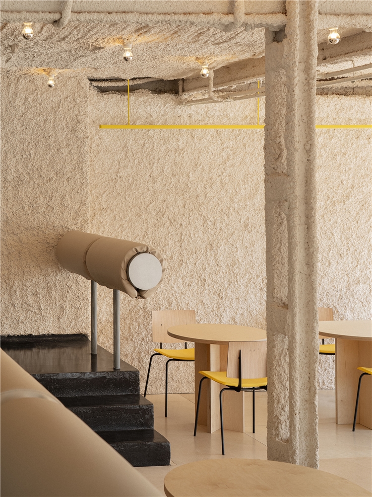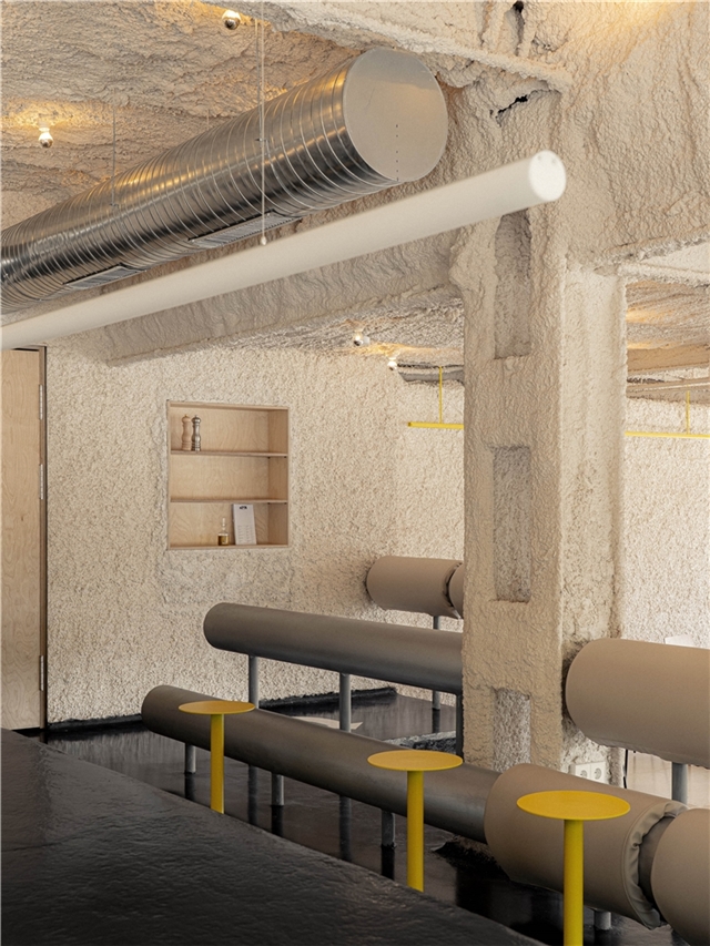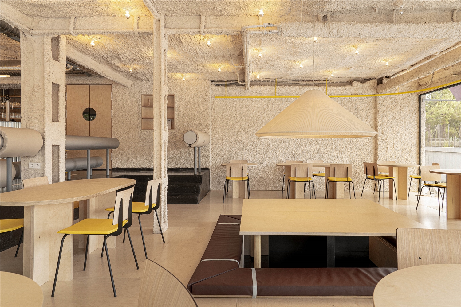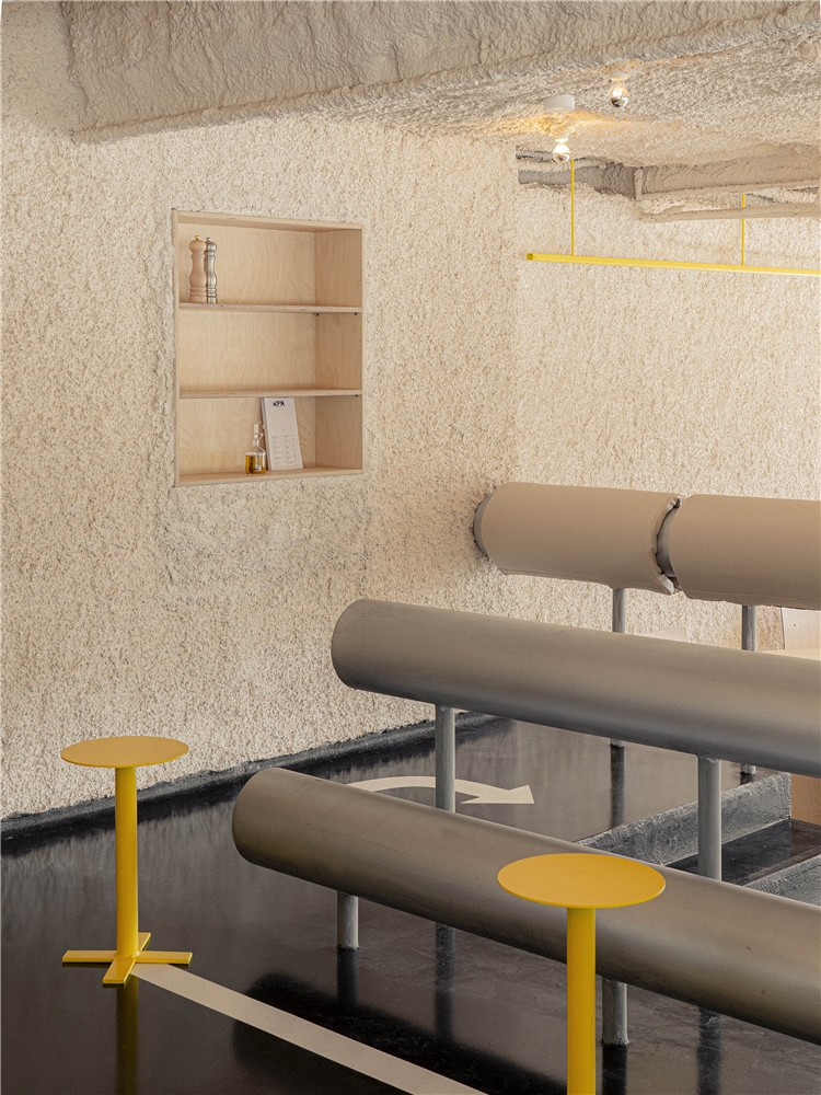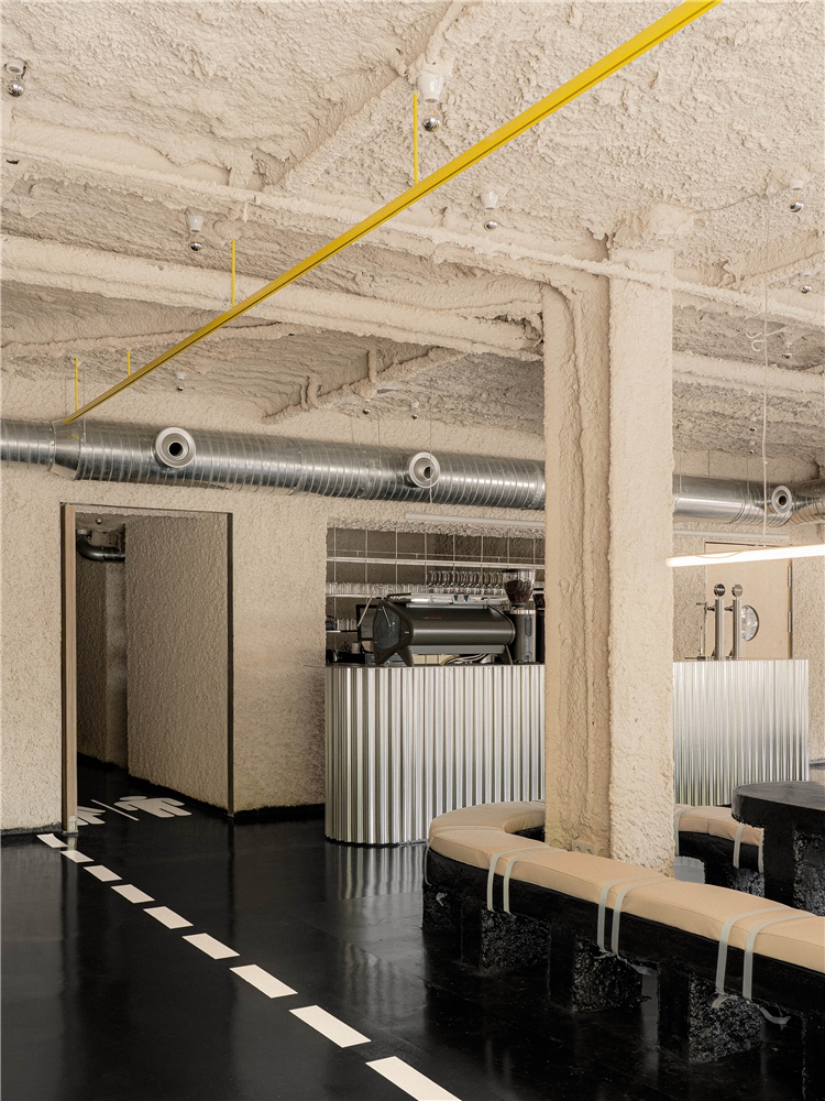 El espacio principal se plantea como un fragmento de infraestructura trasladado al interior. El pavimento remite al asfalto: una superficie negra, continua, dura, que acepta el desgaste y la marca como parte de su condición. La señalética no aparece como gráfica corporativa pulcra, sino como rastro: pintadas de ánimo, mensajes breves y utilitarios, esa escritura improvisada que aparece en los grandes recorridos; un lenguaje de apoyo y orientación más que de representación. En esta zona, el mobiliario referencia los merenderos de estaciones de servicio: mesas robustas, directas, sin gesto doméstico, pensadas para parar sin instalarse. A su alrededor emergen elementos de borde y protección, quitamiedos, vallas y barandillas, que no se entienden como decoración, sino como dispositivos que ordenan el movimiento y acogen al visitante.