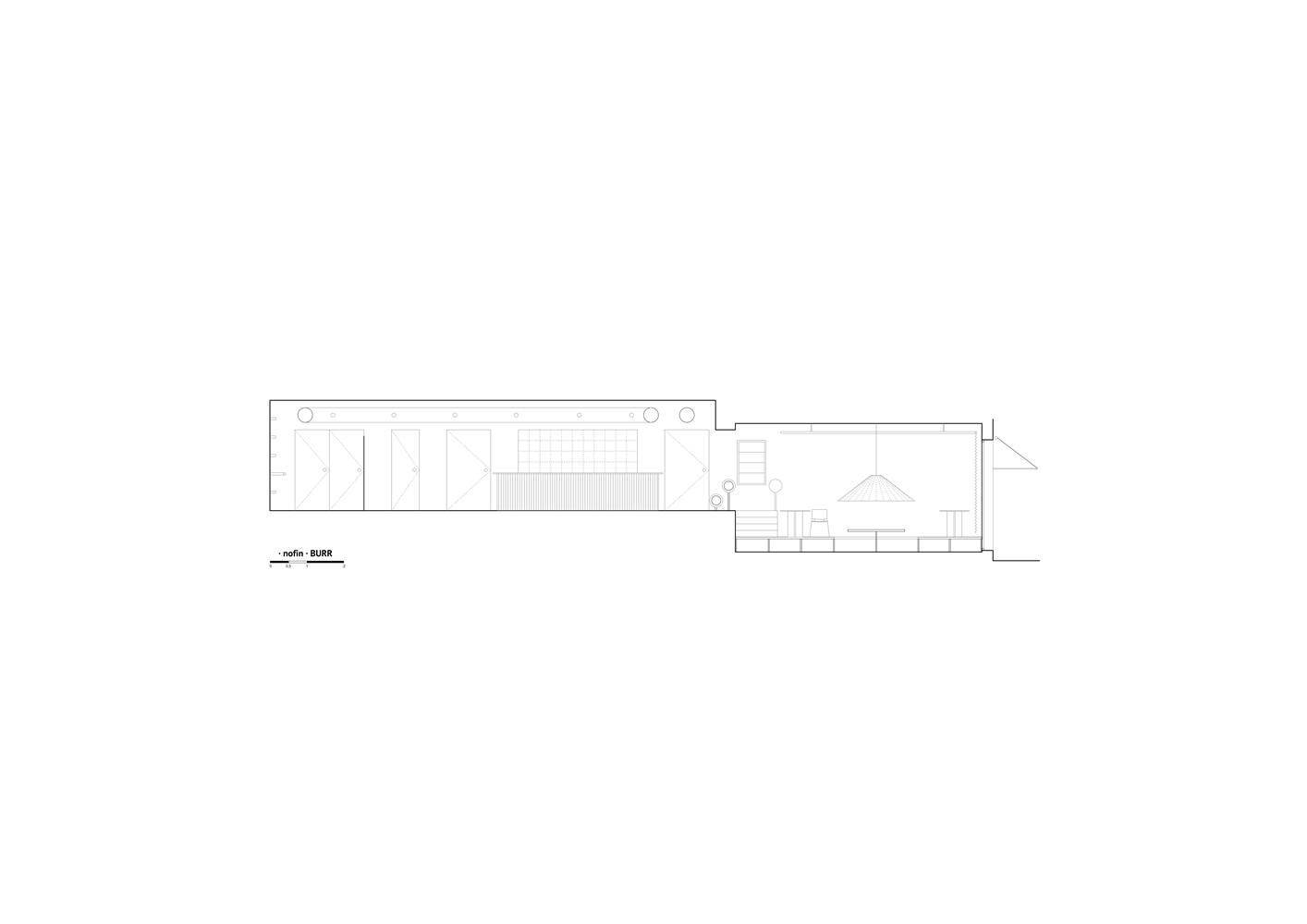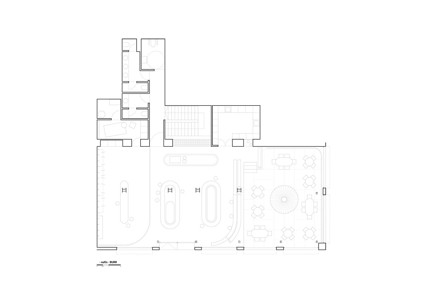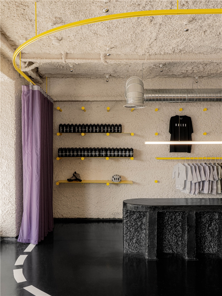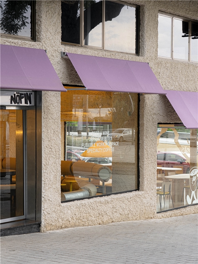 Nofin es una cafetería y una tienda de ropa para ciclistas vinculada a la marca Endless. Se ubica en un enclave singular dentro de Madrid: en las inmediaciones de Madrid Río, un espacio público en forma de recorrido, que funciona como una infraestructura cotidiana: una ruta. El local asume, por tanto, una condición de parada, de punto de avituallamiento para una masa constante de ciclistas que recorren el borde del río. Más que un destino, Nofin se entiende como un umbral en mitad del movimiento.