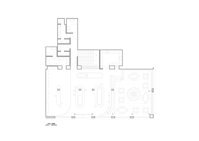 En paralelo, la intervención asume una condición pragmática: el local arrastra “accidentes” propios del edificio: irregularidades, encuentros forzados, huellas de instalaciones previas. La estrategia material se plantea entonces como un sistema de unificación: un material (o una familia coherente de acabados) capaz de absorber esos incidentes, ordenarlos sin ocultarlos del todo y construir continuidad donde hoy hay fragmento. Más que “terminar” el espacio con capas innecesarias, se trata de fijar una lógica clara: una base continua que acepte la imperfección como dato, y sobre ella, una serie de elementos precisos (bordes, piezas de mobiliario, luminarias).