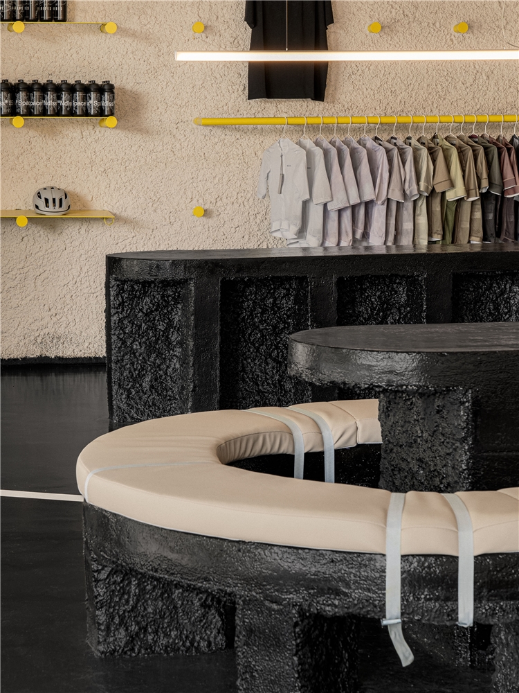 La propuesta conceptual toma esa experiencia del ciclismo en ruta como punto de partida, pero la desplaza hacia un registro más abstracto: no se trata de ilustrar la bicicleta ni de construir una escenografía evidente, sino de capturar el clima material y espacial de la ruta: sus superficies, sus señales, sus elementos de protección y pausa. En contraposición, una parte del espacio asume la materialidad y el ambiente de un espacio doméstico; que prácticamente pide descalzarse, tumbarse en el suelo. El proyecto se construye, así, como una arquitectura de dos estados: exterior e interior, fricción y calma, asfalto y tatami. Dos mundos superpuestos que no buscan mezclarse por completo, sino coexistir como capas que se rozan.