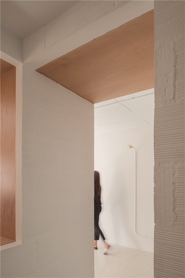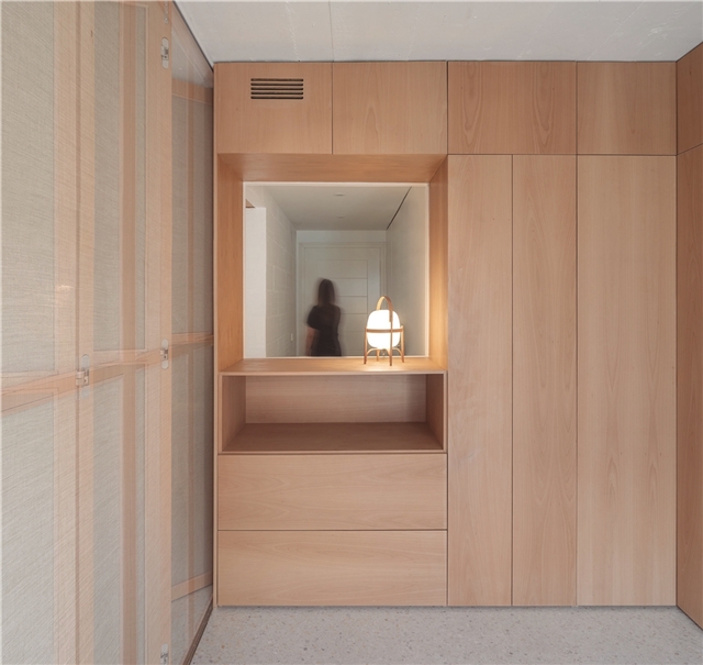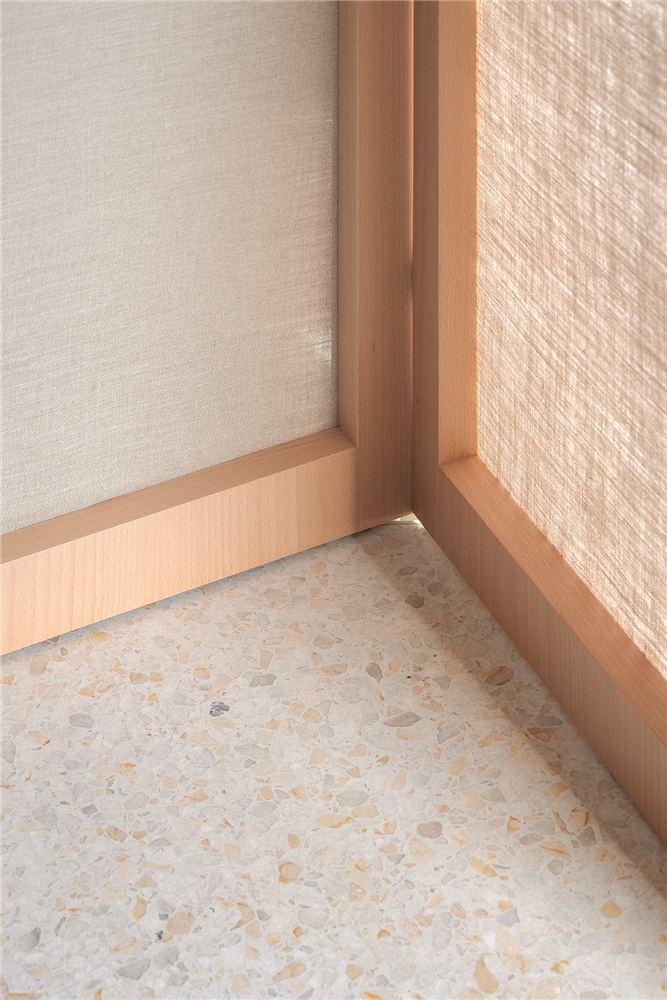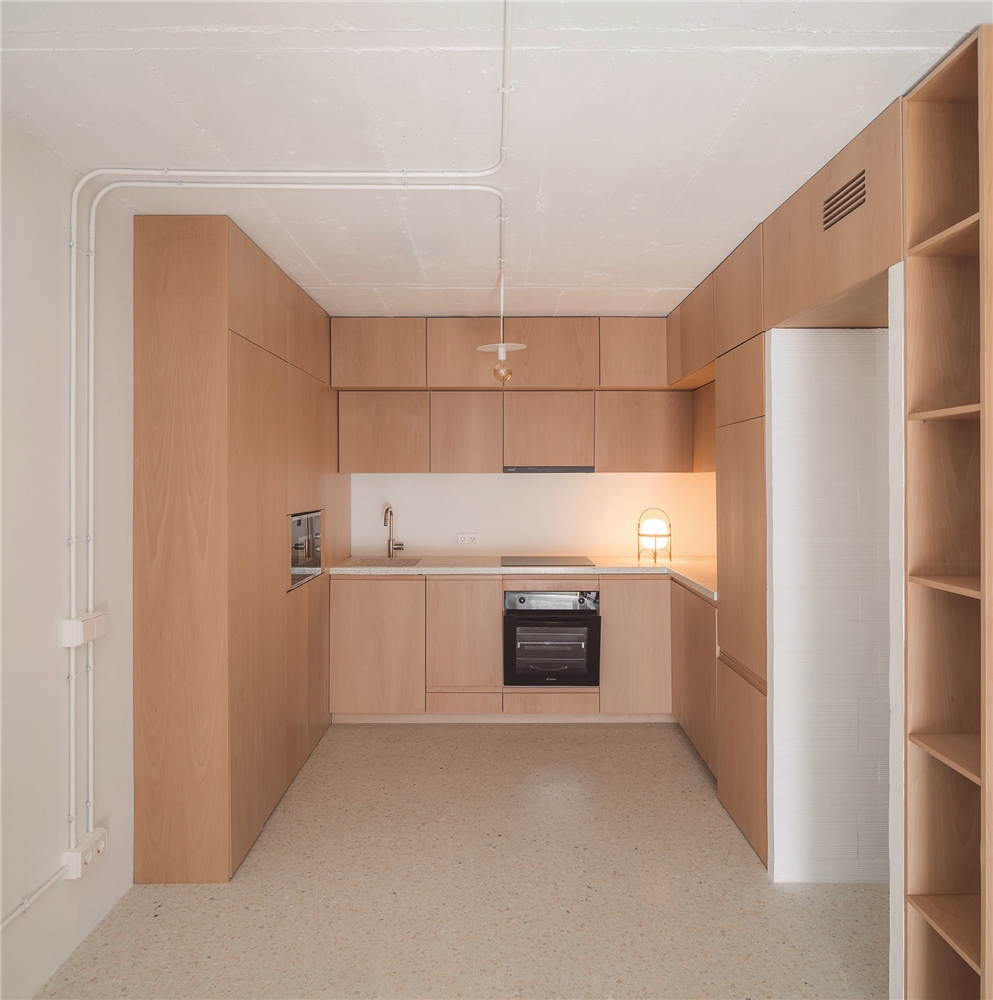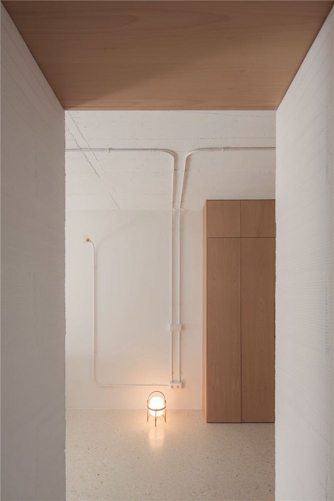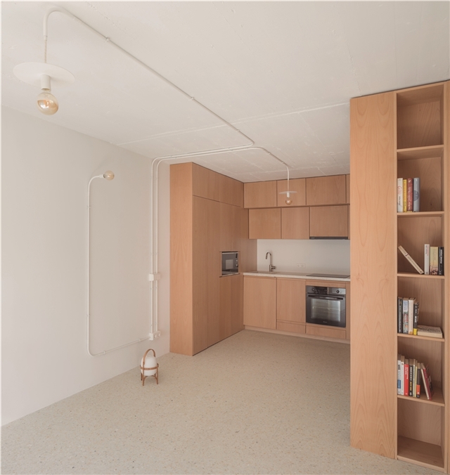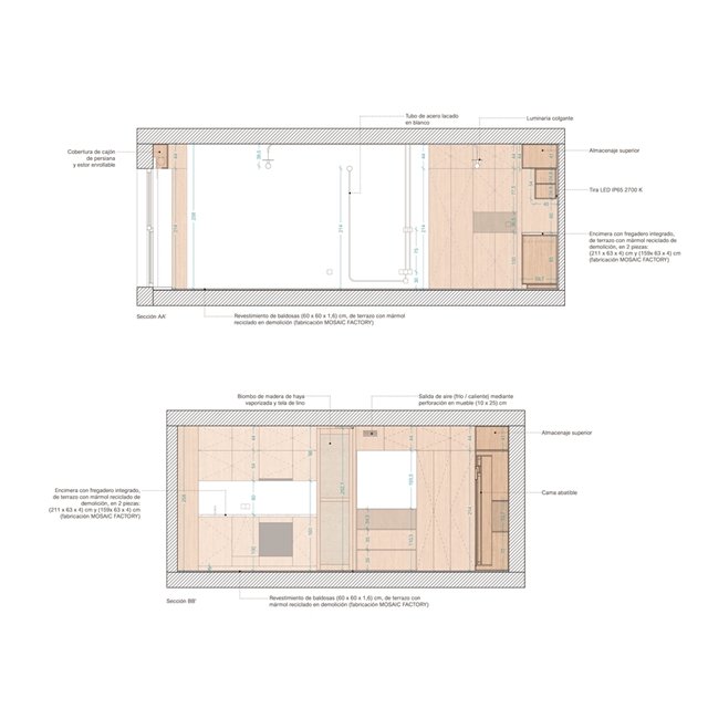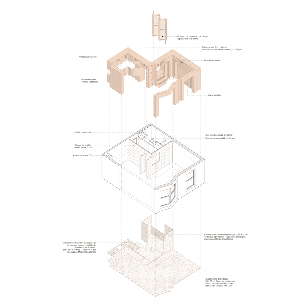 De esta forma, CASA GABINETE, queda resuelta sólo con tres materiales principales: el rasillón cerámico visto, que conforma la nueva tabiquería; la madera de haya vaporizada, que caracteriza todo el mueble “gabinete”; y el terrazo, generado a partir del mármol reciclado de la vivienda en su estado original.