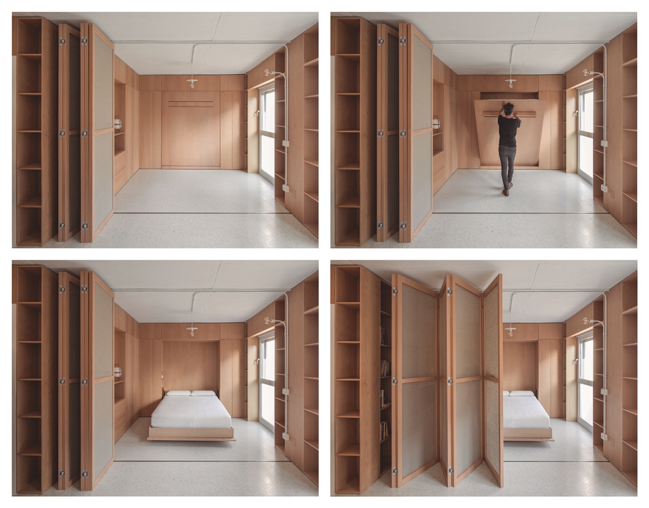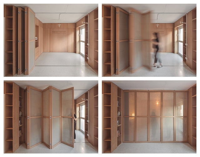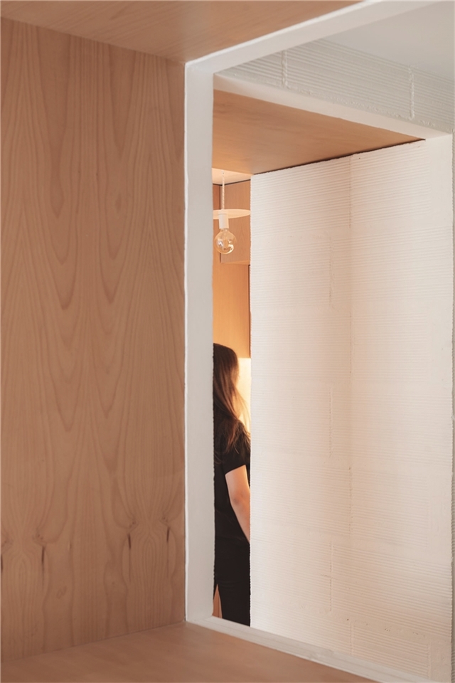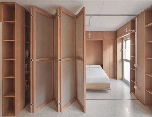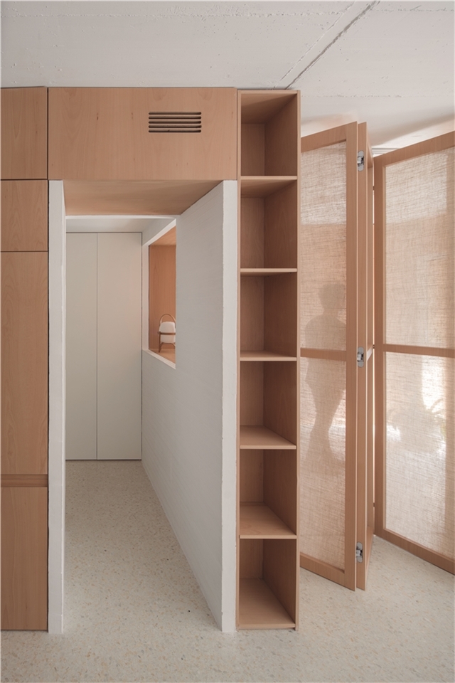 CASA GABINETE recoge este principio de mueble continuo, resuelto íntegramente en madera de haya vaporizada, capaz de albergar la entropía natural de la vida doméstica; así mismo, diversos programas mono funcionales de uso, como la cocina o el dormitorio, quedan incorporados a esta cinta programática que, junto a un biombo desplegable, otorgan flexibilidad de uso y posibilidad de transformación al espacio, a partir del ejercicio de mostrar o esconder los elementos que la componen, aportando de esta manera la necesaria cuota de indeterminación al espacio doméstico.