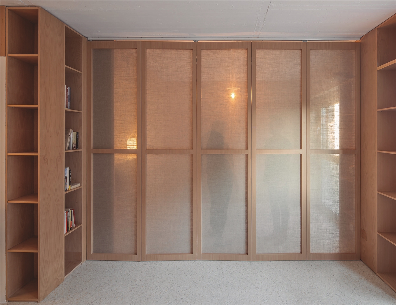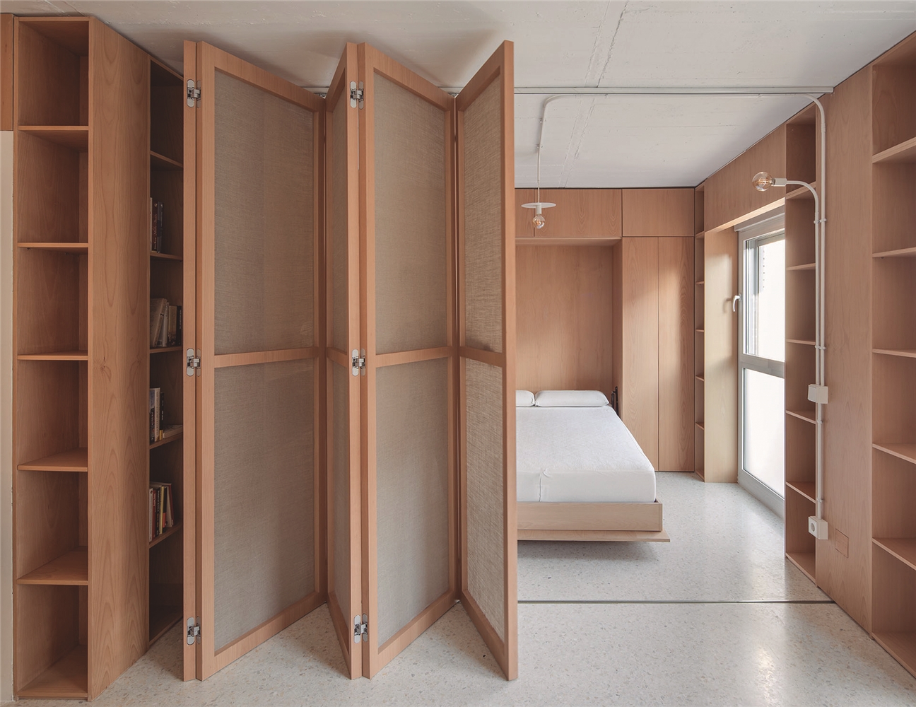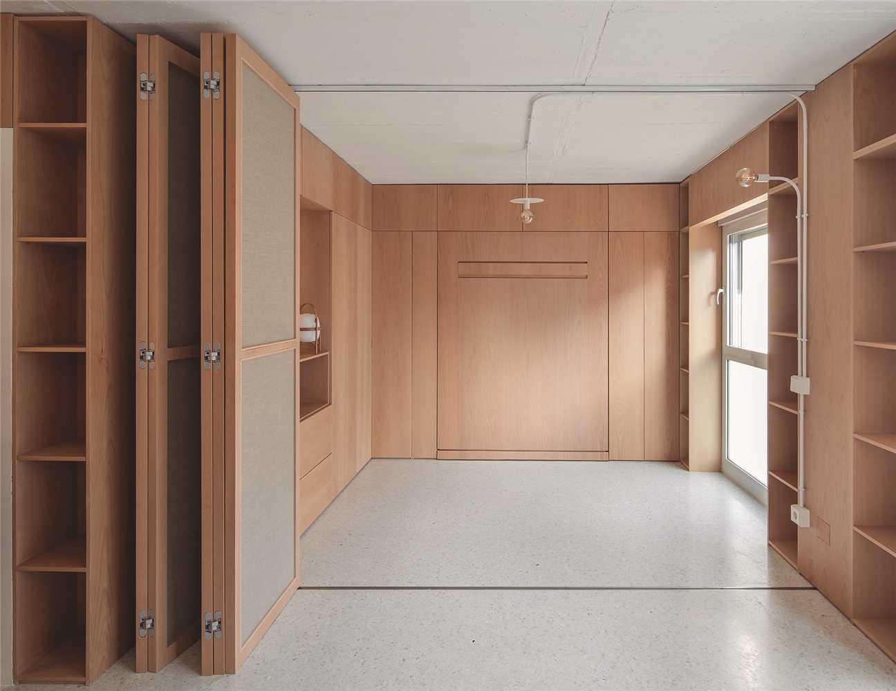 CASA GABINETE recoge este principio de mueble continuo, resuelto íntegramente en madera de haya vaporizada, capaz de albergar la entropía natural de la vida doméstica; así mismo, diversos programas mono funcionales de uso, como la cocina o el dormitorio, quedan incorporados a esta cinta programática que, junto a un biombo desplegable, otorgan flexibilidad de uso y posibilidad de transformación al espacio, a partir del ejercicio de mostrar o esconder los elementos que la componen, aportando de esta manera la necesaria cuota de indeterminación al espacio doméstico.