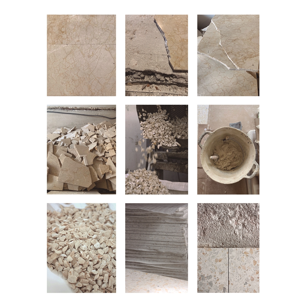 La segunda decisión surgió al encontrarnos con la presencia de un baldosado de mármol en todo el suelo de la vivienda y el revestimiento del baño original, que optamos por reciclar, transformándolo en el árido principal de un nuevo terrazo que sirvió para pavimentar toda la superficie de la vivienda reformada, revestir el interior del baño, y a su vez, elaborar dos encimeras a medida para los muebles de baño y cocina.
