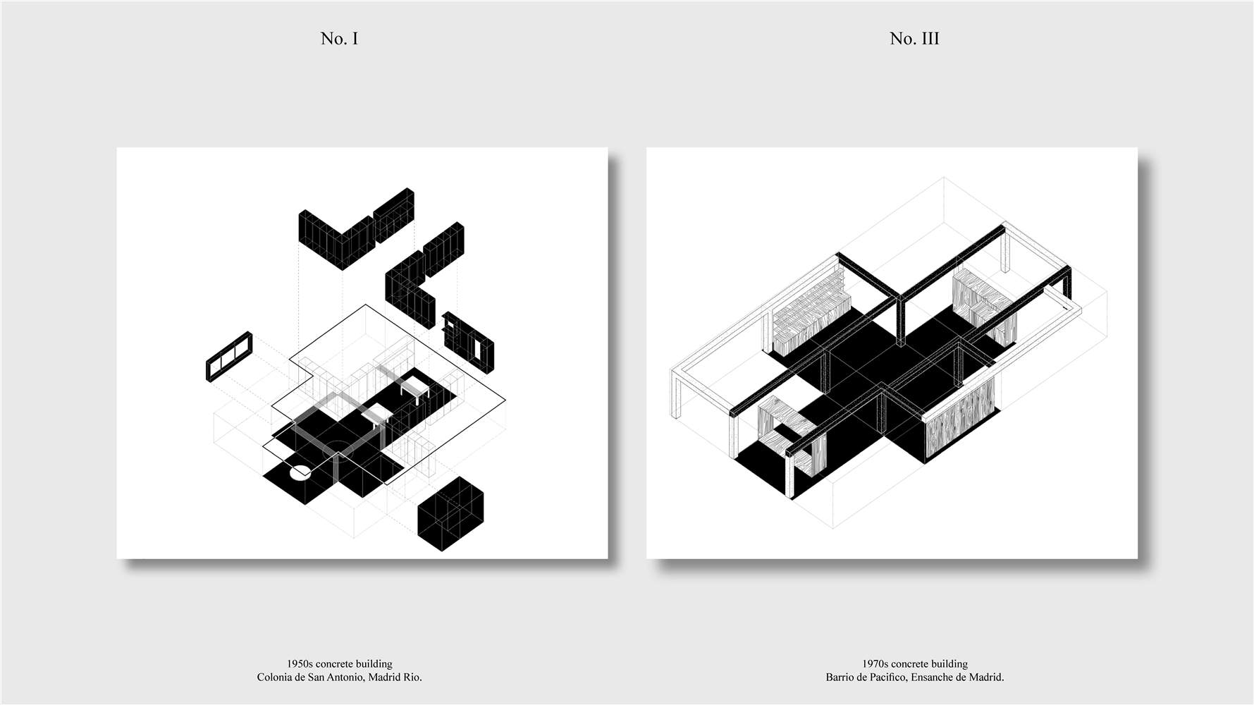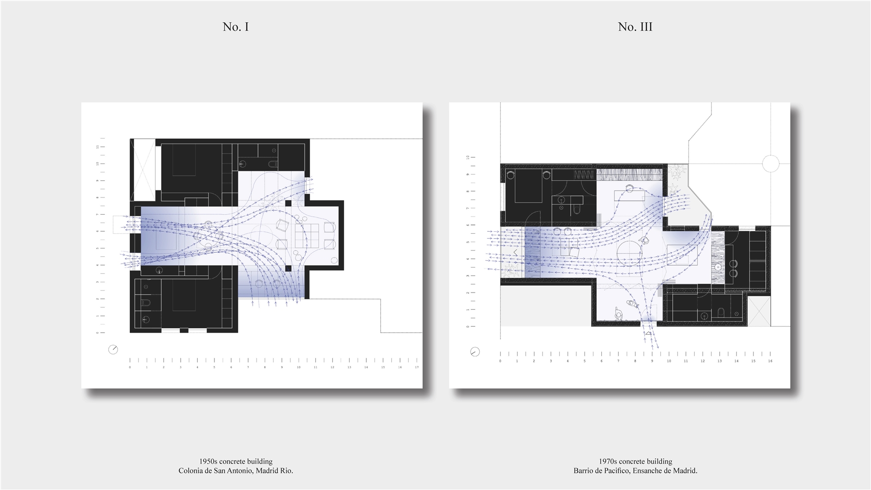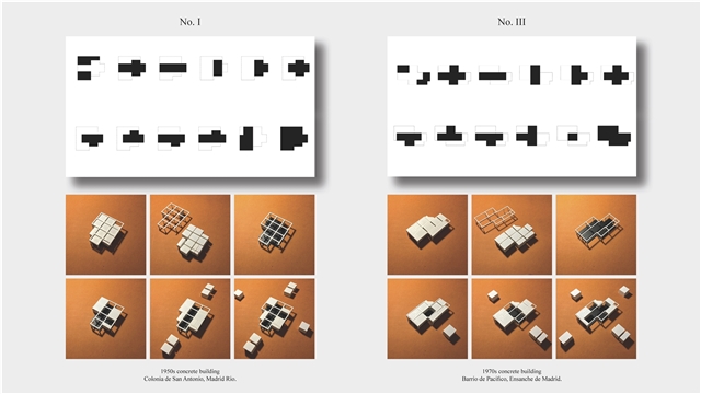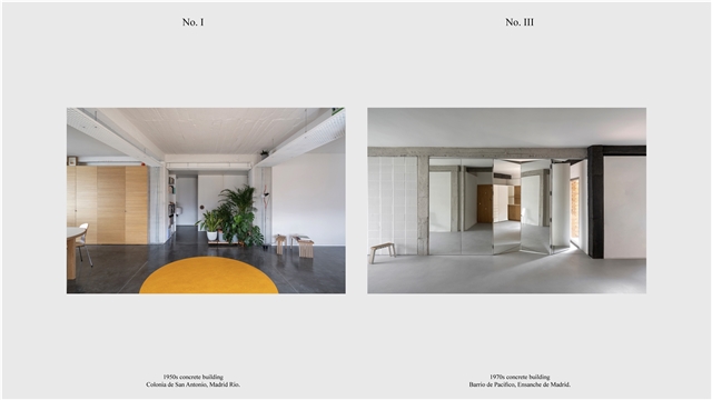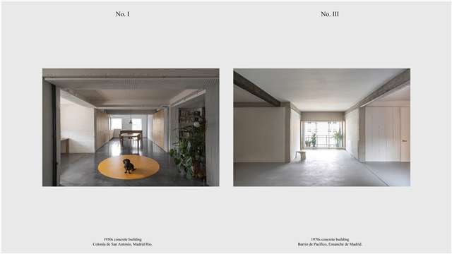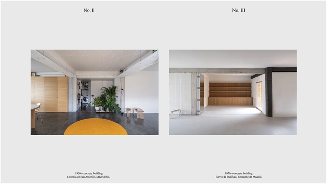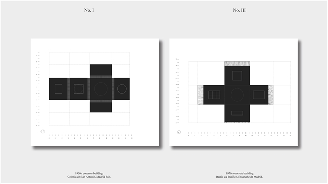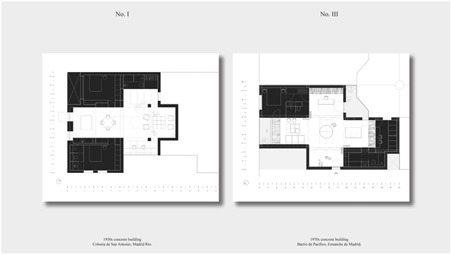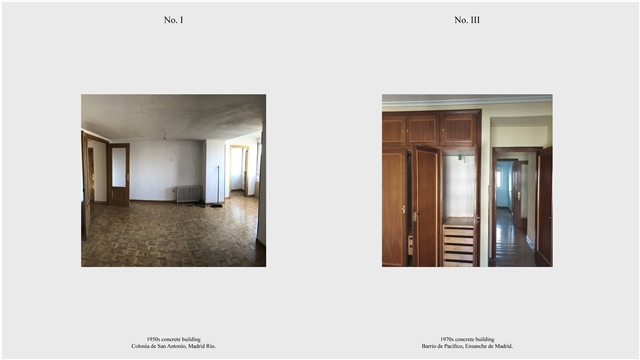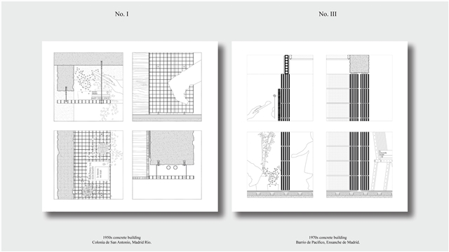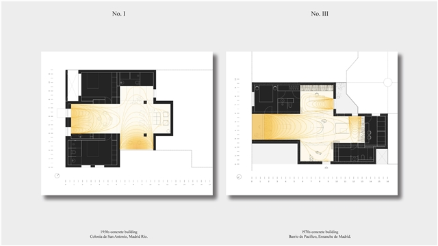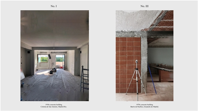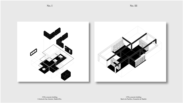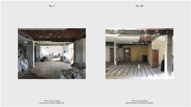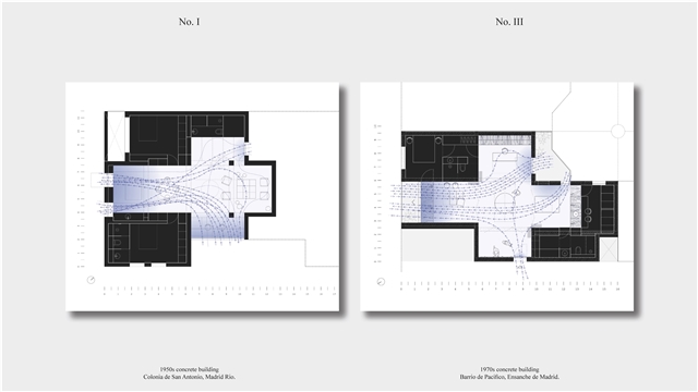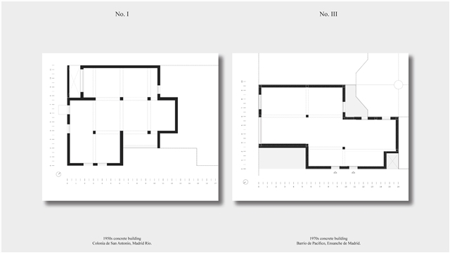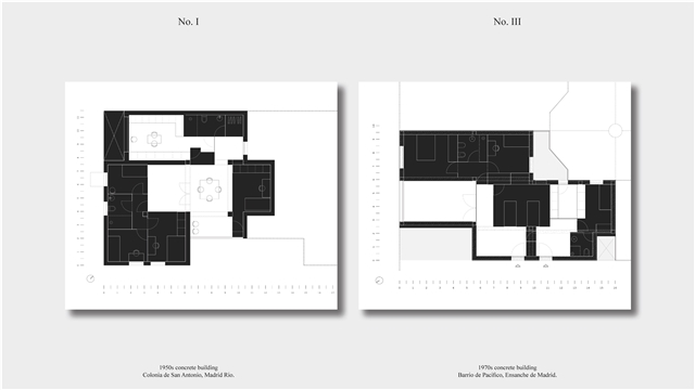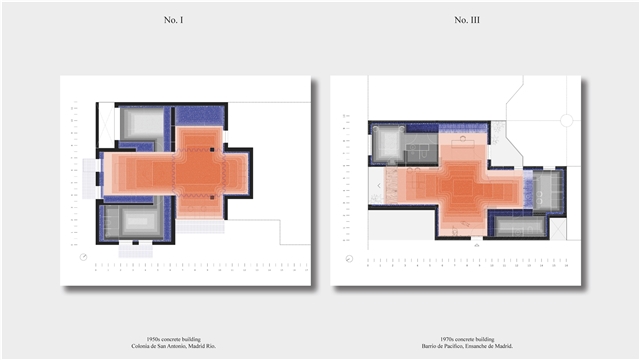 Los primeros casos de estudio corresponden a construcciones de hormigón de la segunda mitad del s. XX en ensanches y arrabales de Madrid, como Colonia de San Antonio, Pacífico y Vallehermoso. La estrategia analiza la retícula estructural para delimitar dos tipos de espacios: binarios, definidos; y no-binarios, polivalentes. Estos últimos incorporan estrategias pasivas y activas y liberan conexiones que mejoran iluminación natural, ventilación cruzada y acceso a exteriores mediante la recuperación de terrazas y patios.