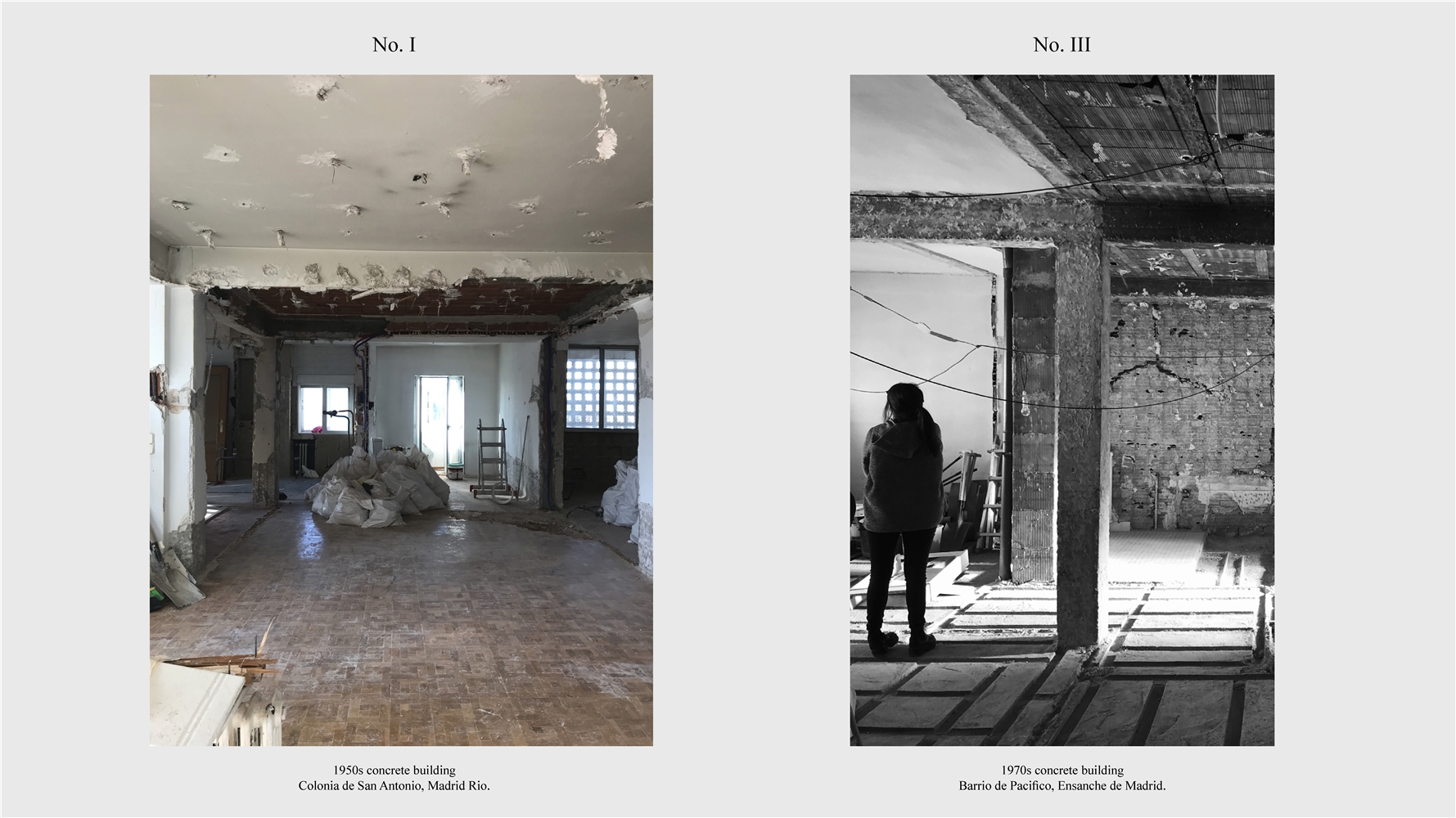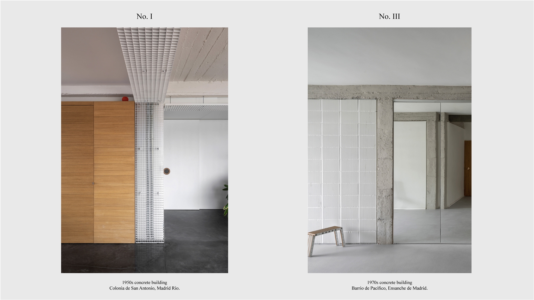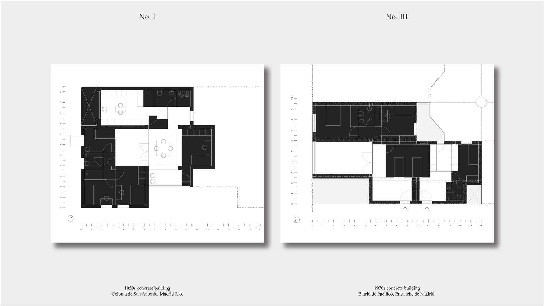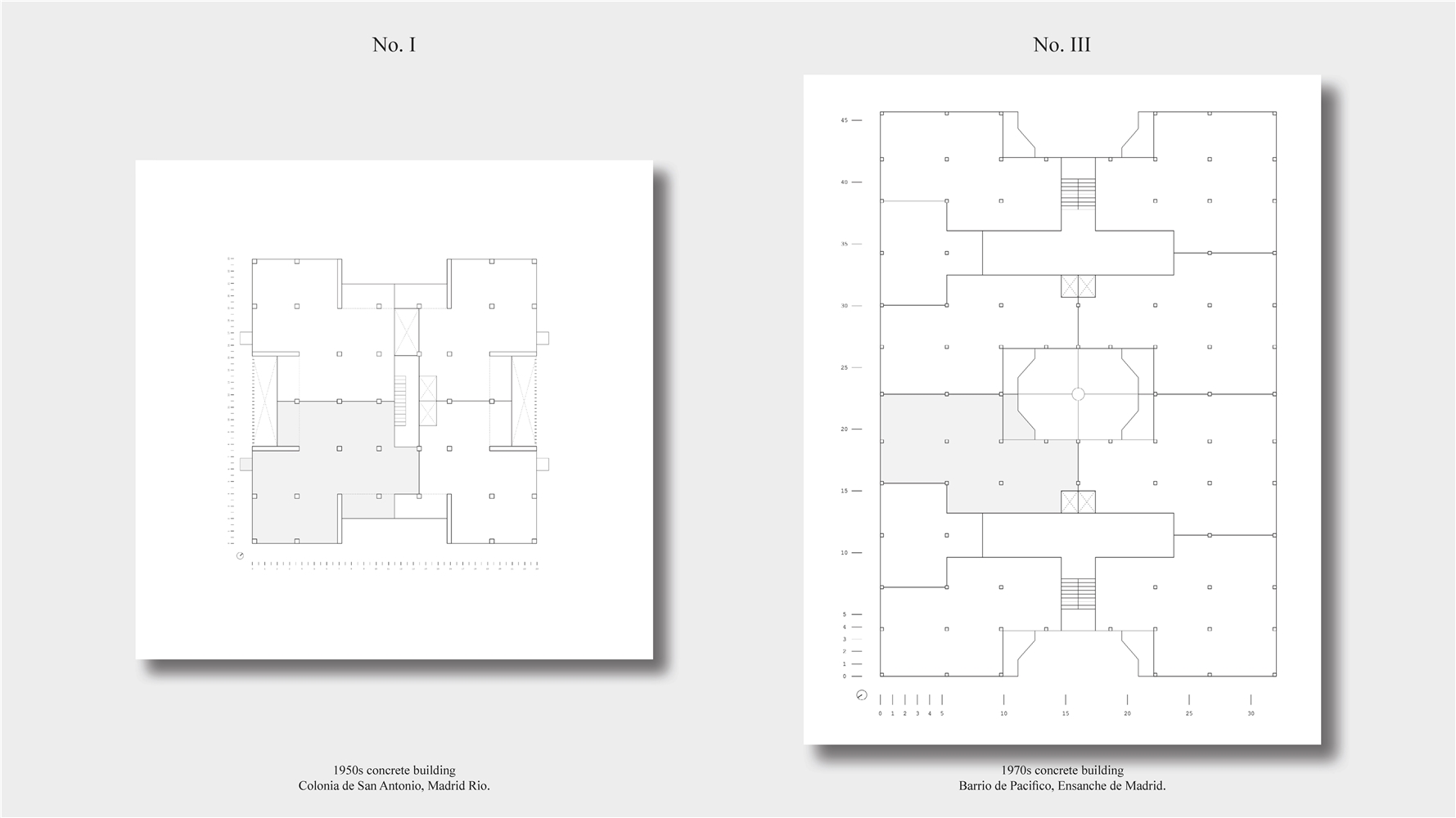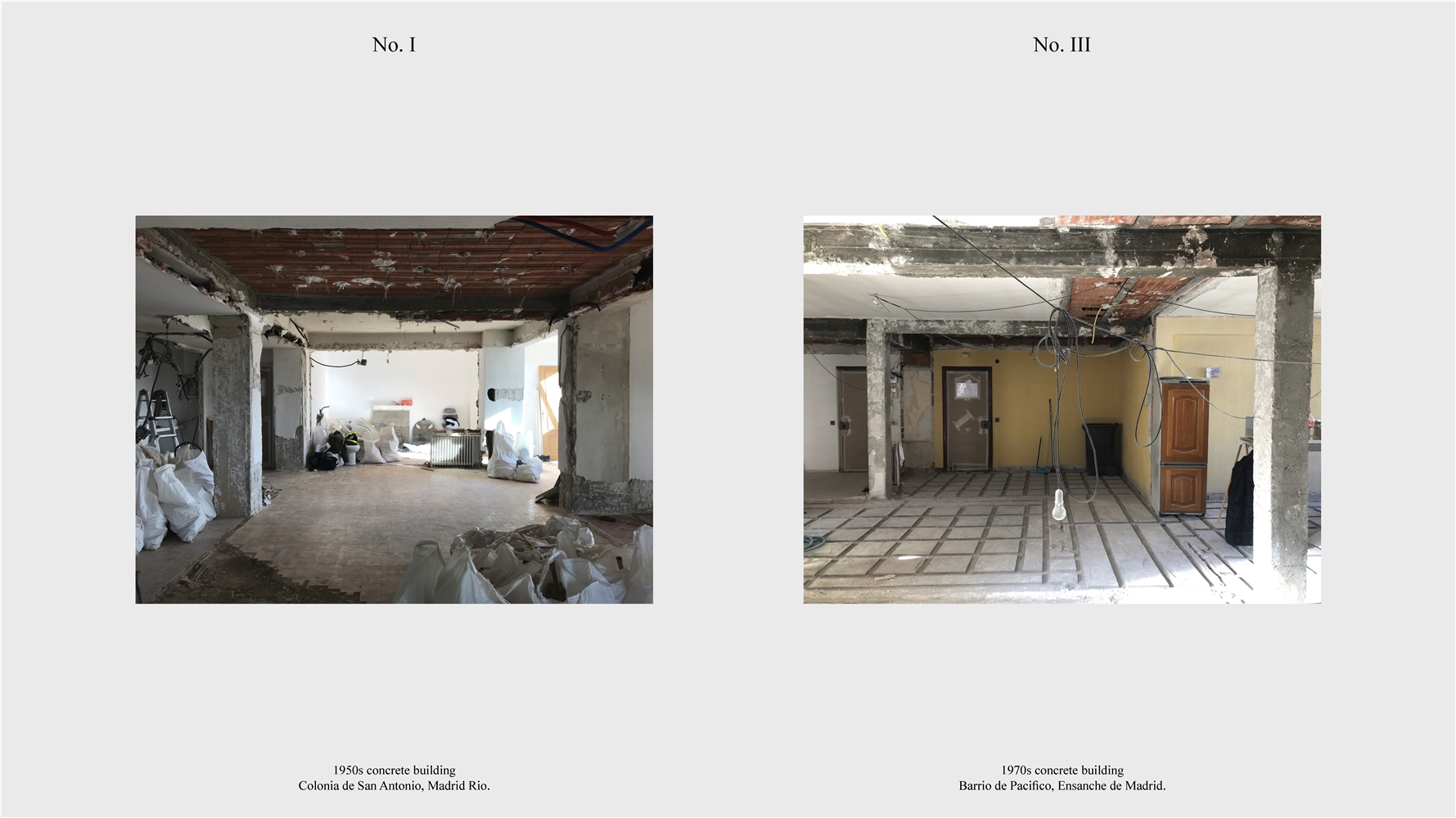 Los primeros casos de estudio corresponden a construcciones de hormigón de la segunda mitad del s. XX en ensanches y arrabales de Madrid, como Colonia de San Antonio, Pacífico y Vallehermoso. La estrategia analiza la retícula estructural para delimitar dos tipos de espacios: binarios, definidos; y no-binarios, polivalentes. Estos últimos incorporan estrategias pasivas y activas y liberan conexiones que mejoran iluminación natural, ventilación cruzada y acceso a exteriores mediante la recuperación de terrazas y patios.