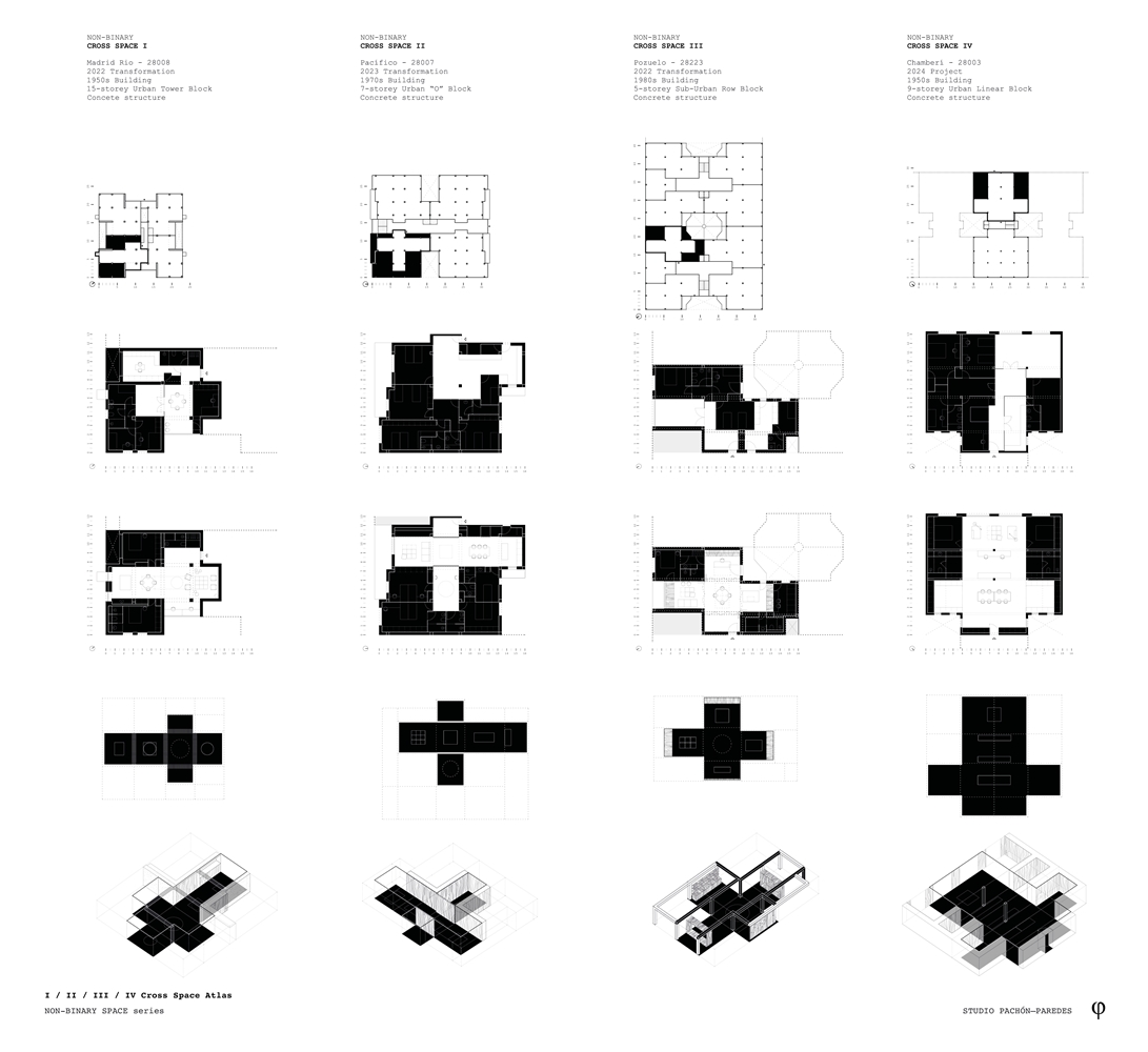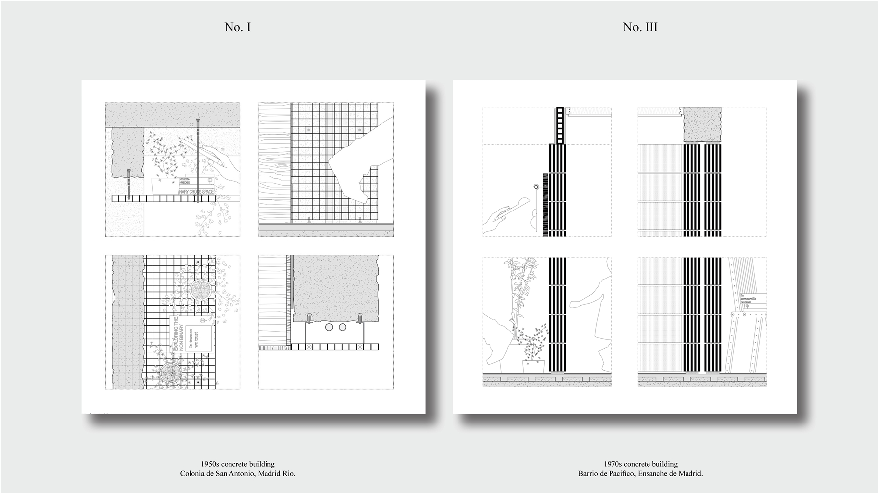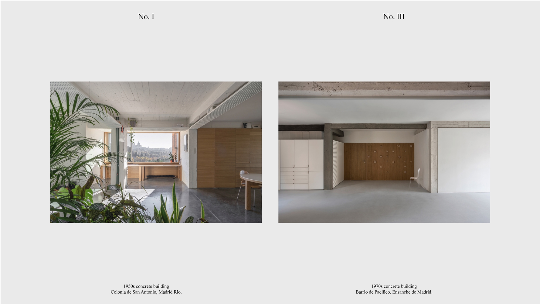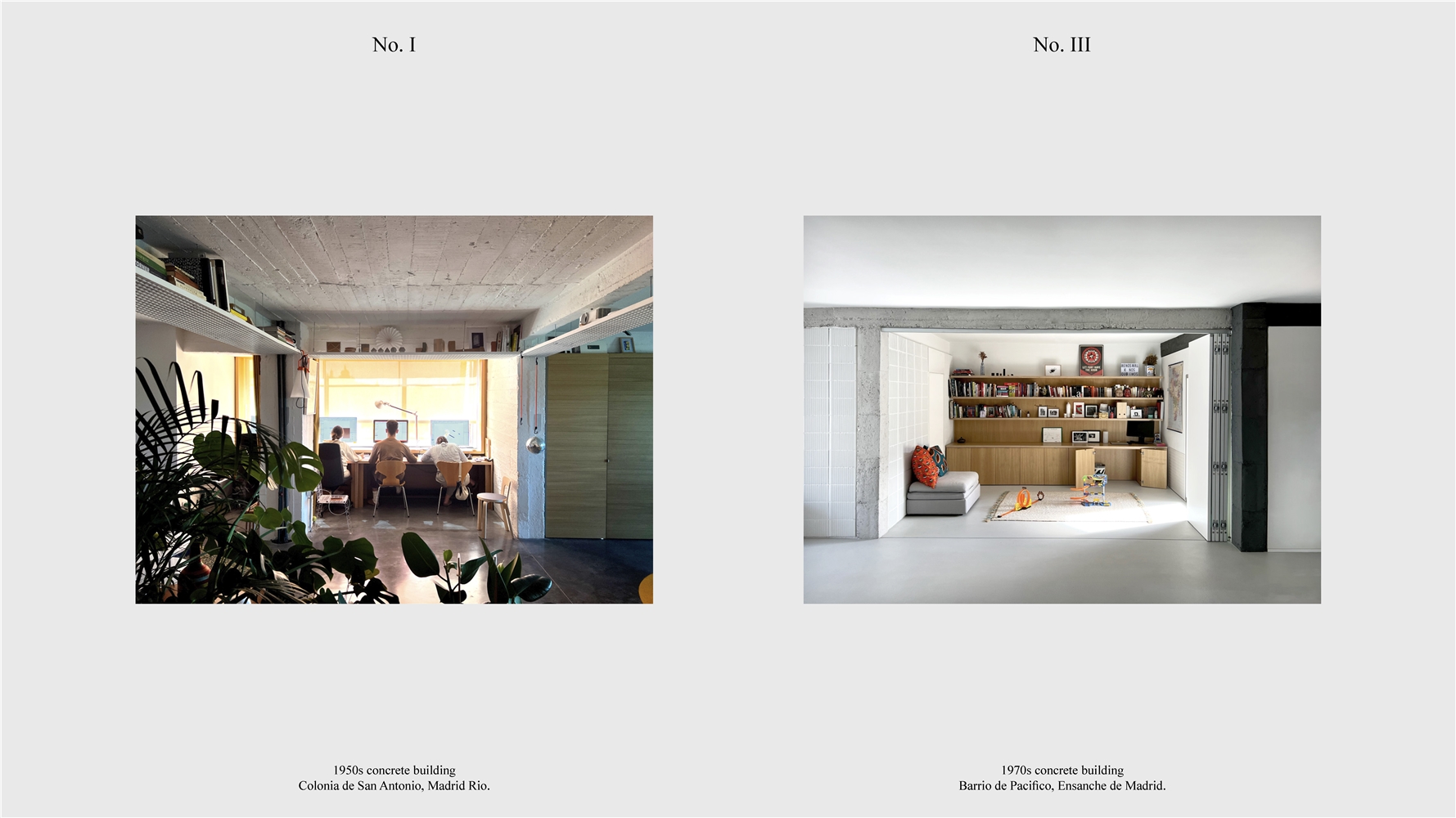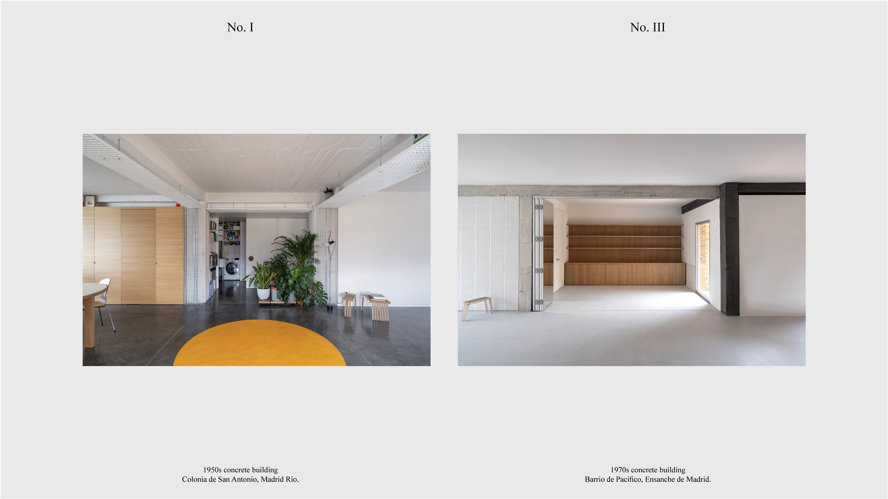Los primeros casos de estudio corresponden a construcciones de hormigón de la segunda mitad del s. XX en ensanches y arrabales de Madrid, como Colonia de San Antonio, Pacífico y Vallehermoso. La estrategia analiza la retícula estructural para delimitar dos tipos de espacios: binarios, definidos; y no-binarios, polivalentes. Estos últimos incorporan estrategias pasivas y activas y liberan conexiones que mejoran iluminación natural, ventilación cruzada y acceso a exteriores mediante la recuperación de terrazas y patios.