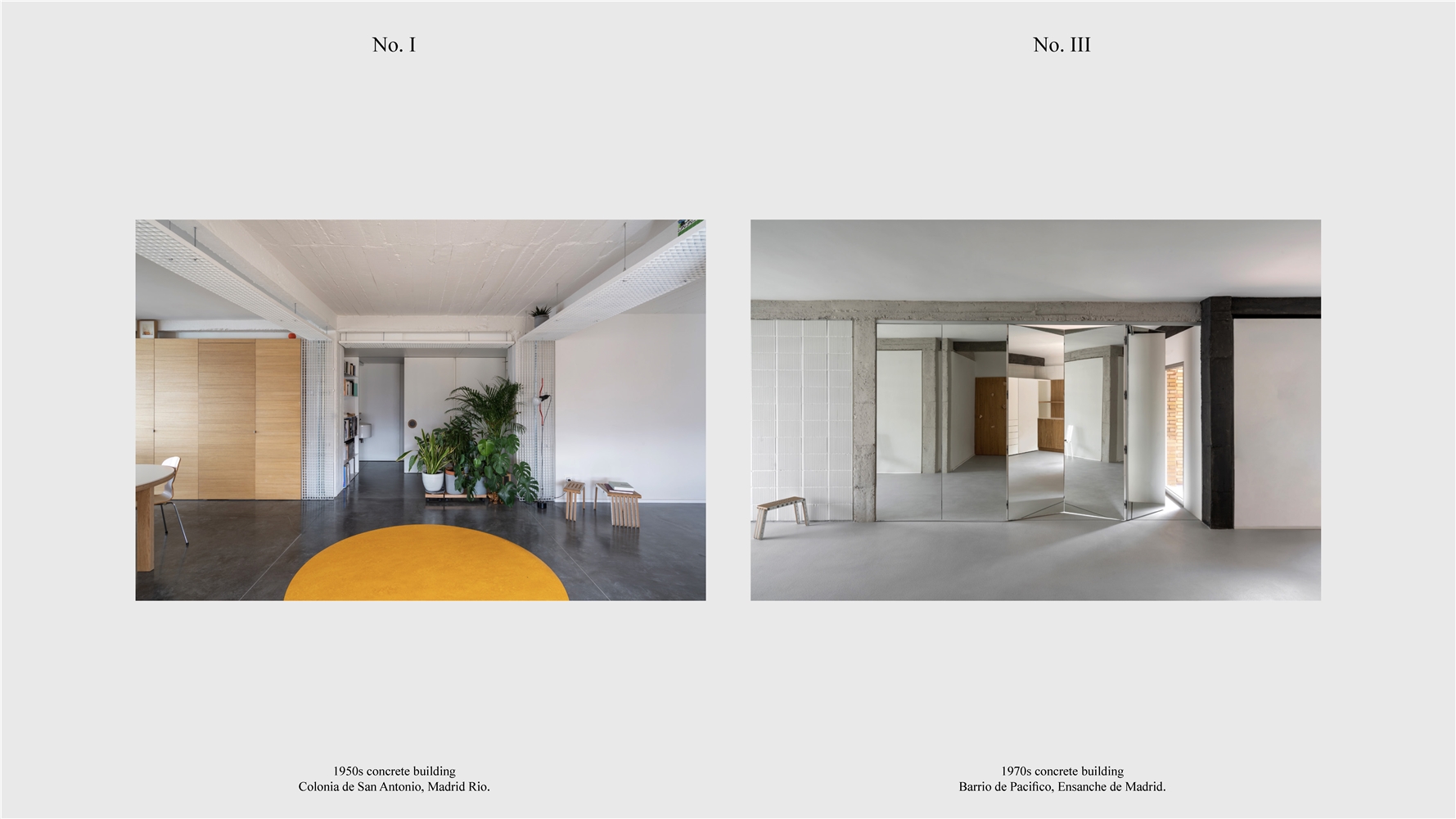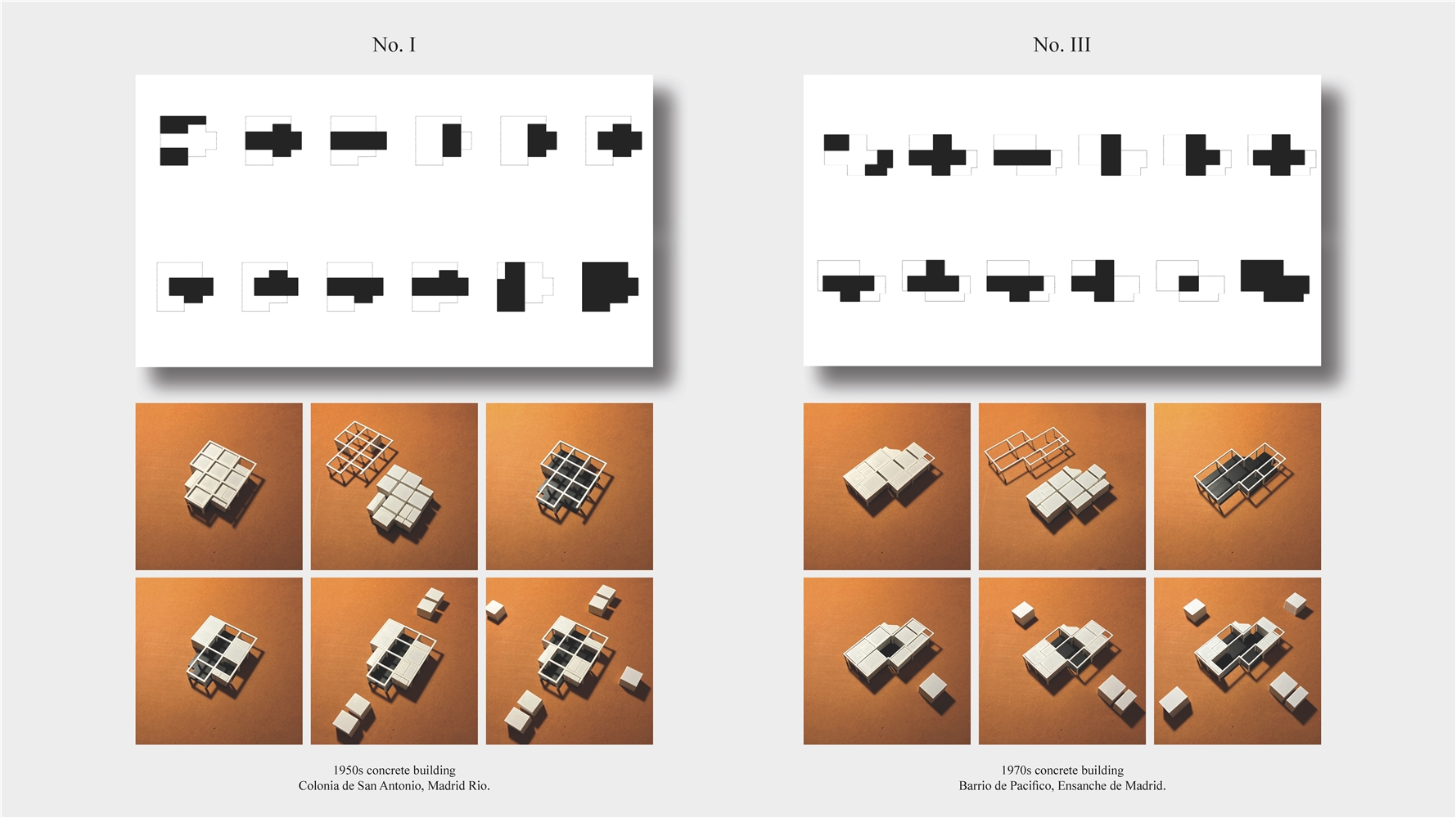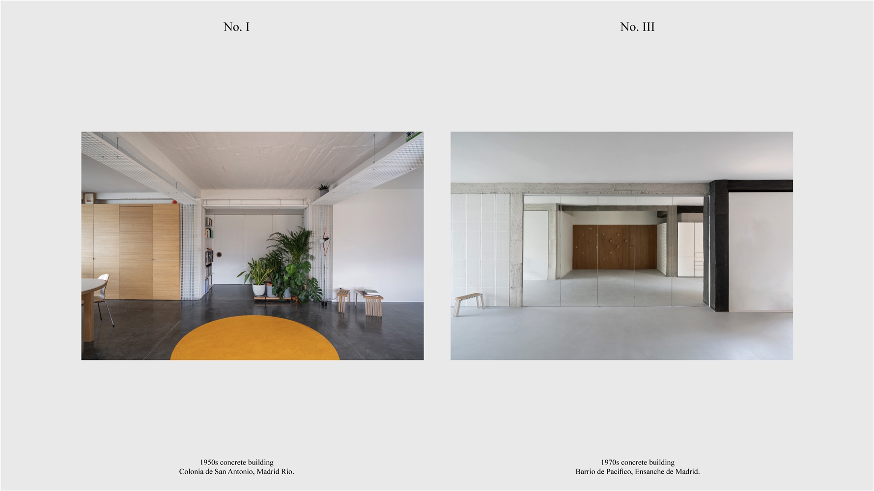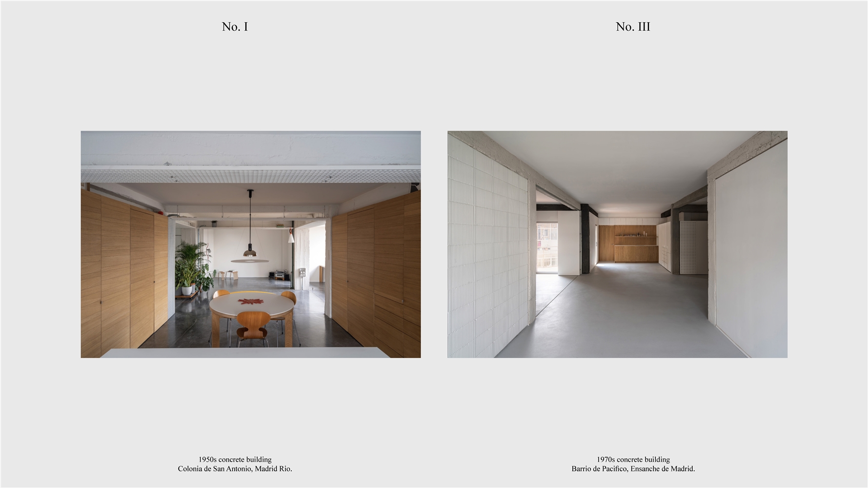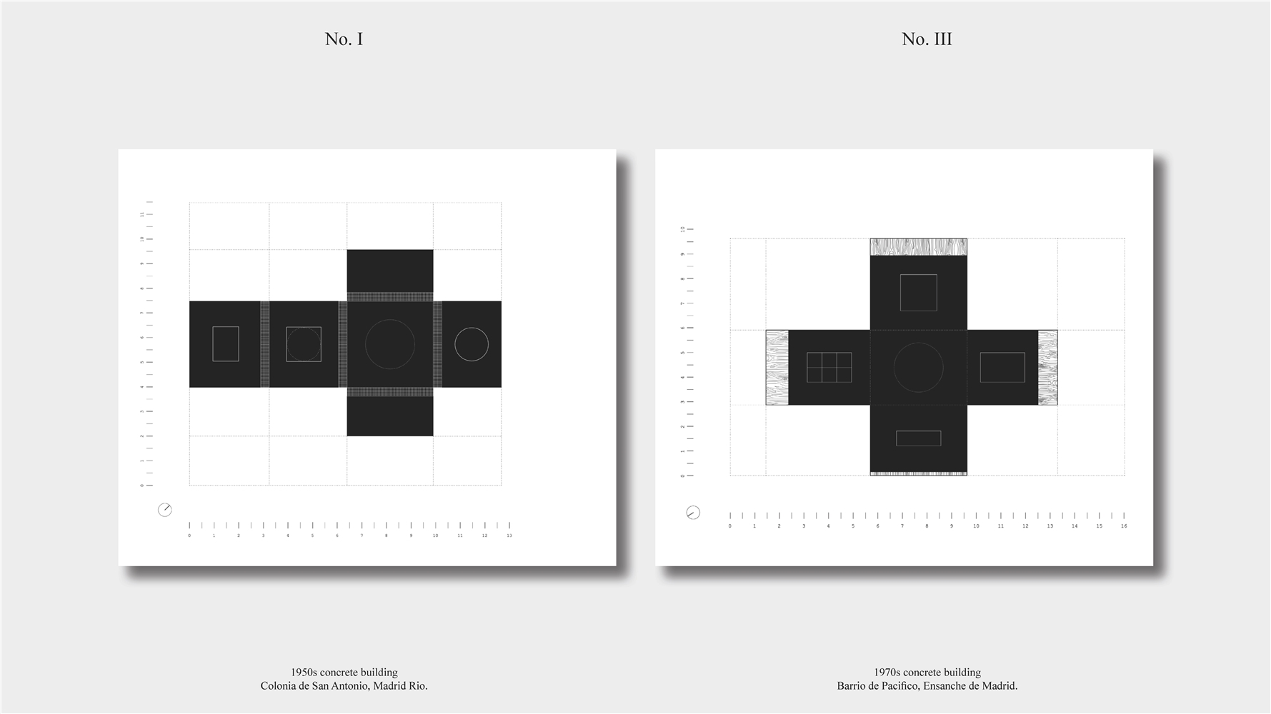 Los primeros casos de estudio corresponden a construcciones de hormigón de la segunda mitad del s. XX en ensanches y arrabales de Madrid, como Colonia de San Antonio, Pacífico y Vallehermoso. La estrategia analiza la retícula estructural para delimitar dos tipos de espacios: binarios, definidos; y no-binarios, polivalentes. Estos últimos incorporan estrategias pasivas y activas y liberan conexiones que mejoran iluminación natural, ventilación cruzada y acceso a exteriores mediante la recuperación de terrazas y patios.