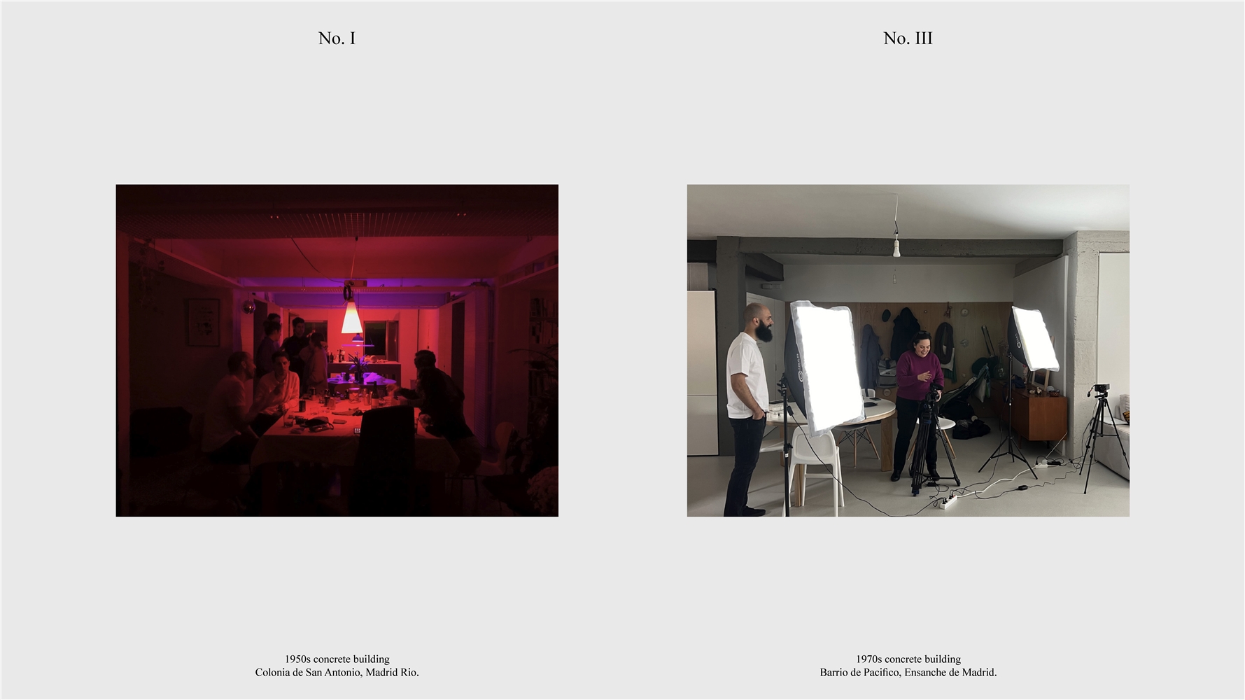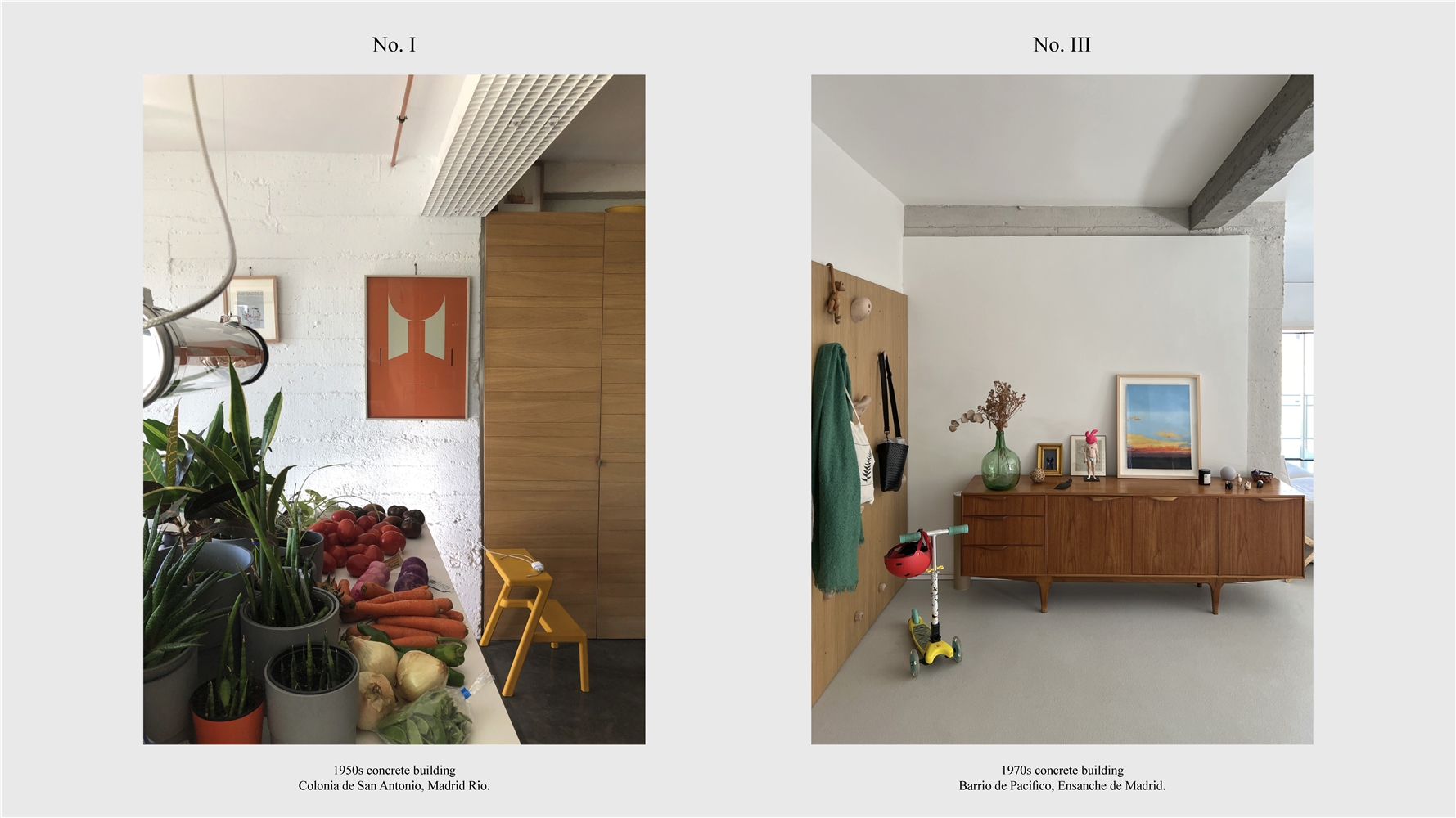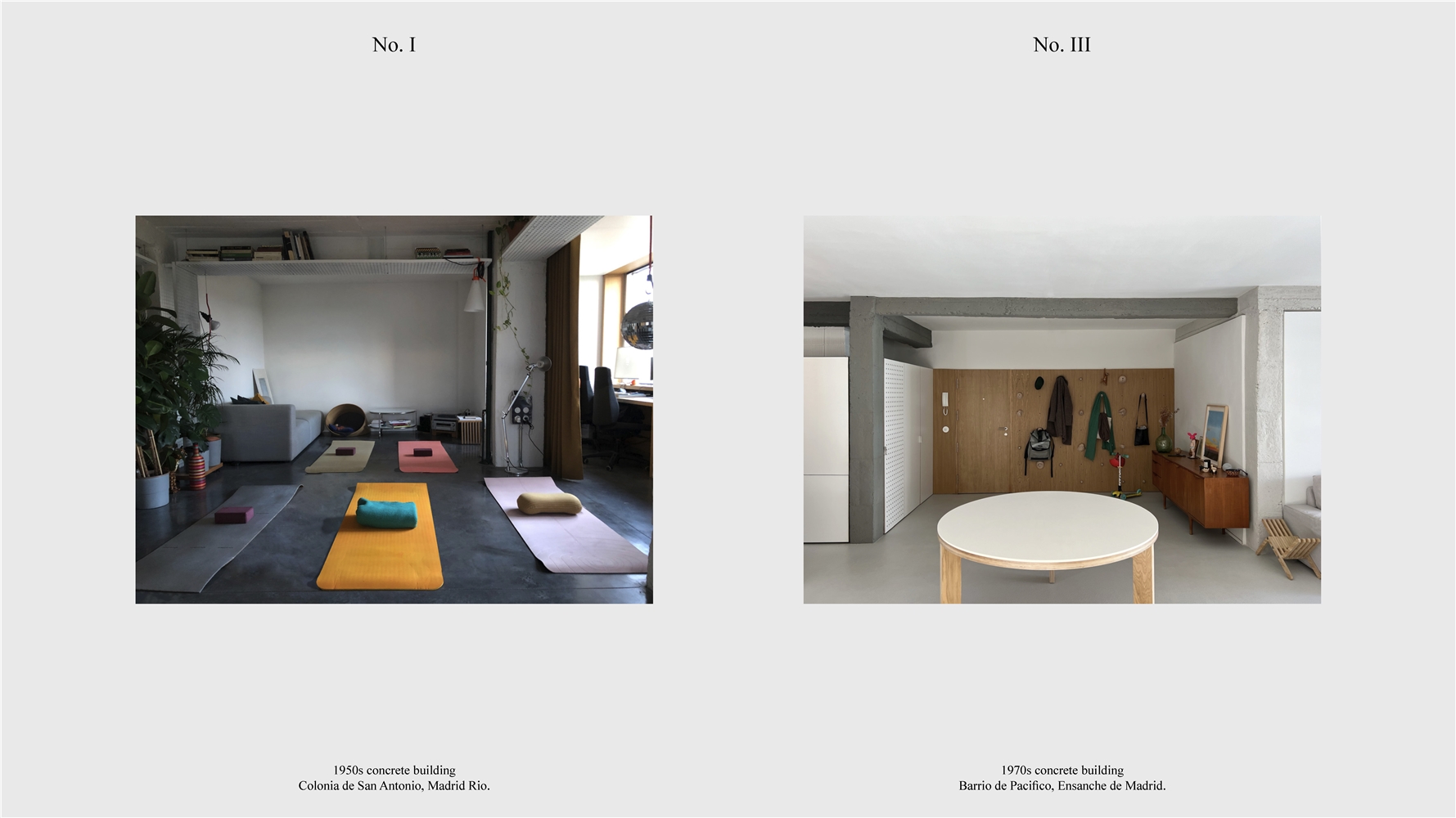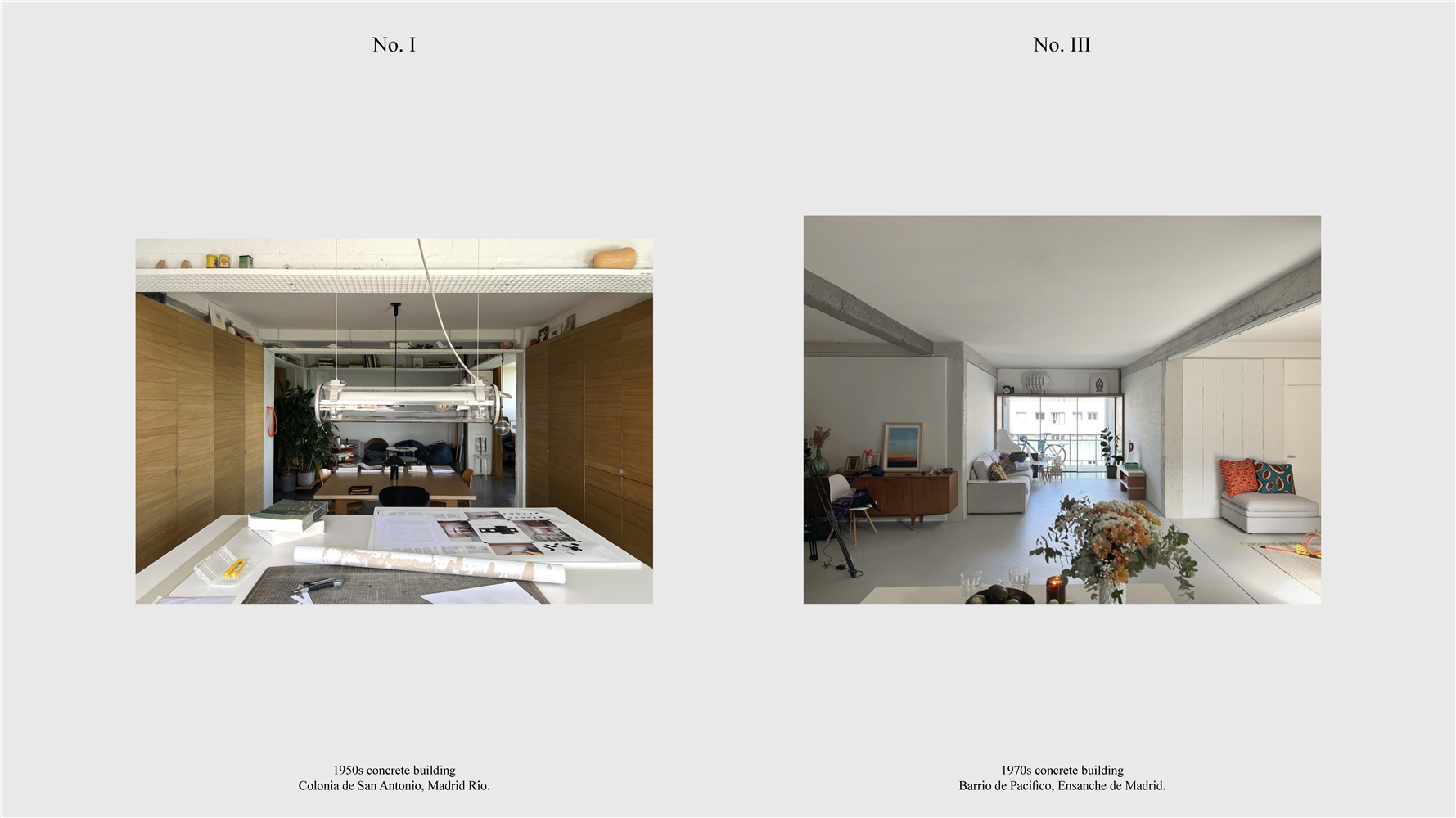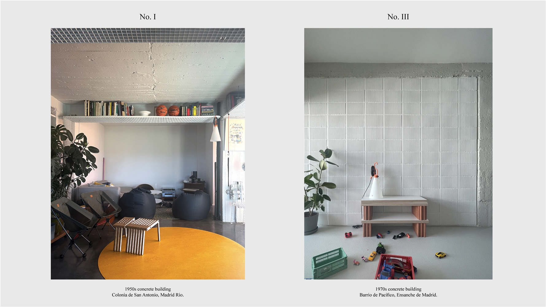 Los primeros casos de estudio corresponden a construcciones de hormigón de la segunda mitad del s. XX en ensanches y arrabales de Madrid, como Colonia de San Antonio, Pacífico y Vallehermoso. La estrategia analiza la retícula estructural para delimitar dos tipos de espacios: binarios, definidos; y no-binarios, polivalentes. Estos últimos incorporan estrategias pasivas y activas y liberan conexiones que mejoran iluminación natural, ventilación cruzada y acceso a exteriores mediante la recuperación de terrazas y patios.