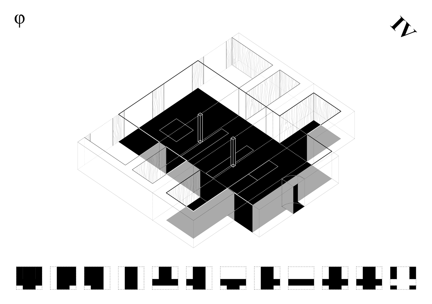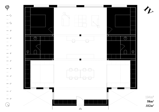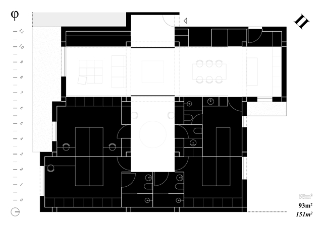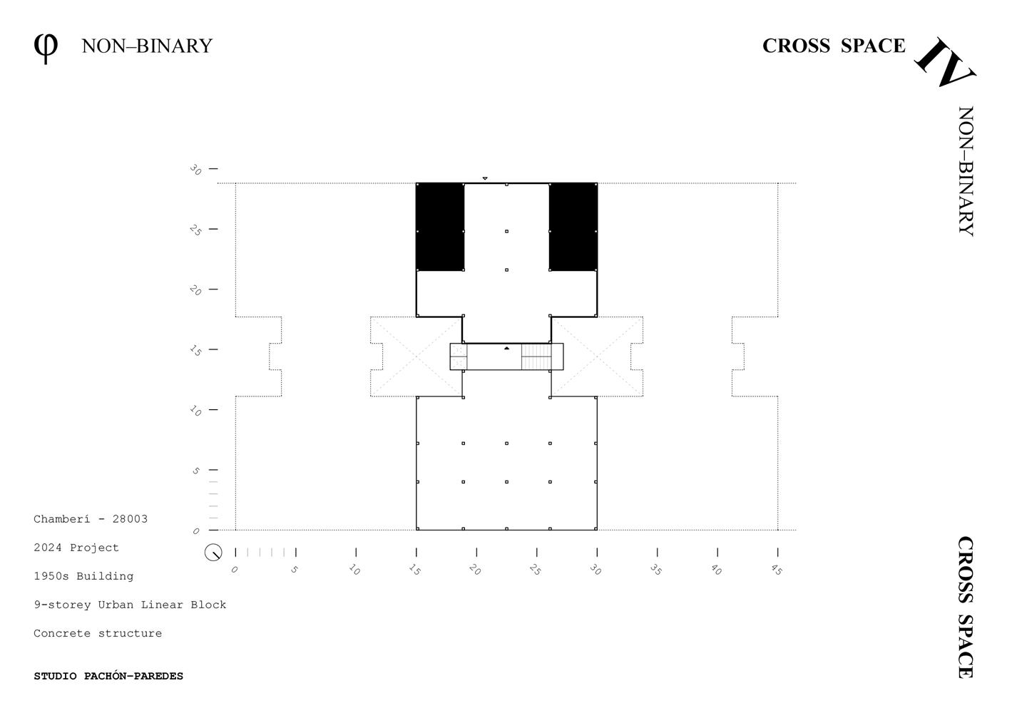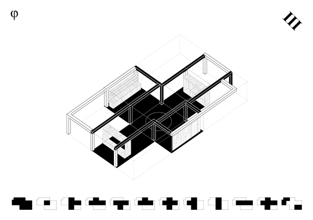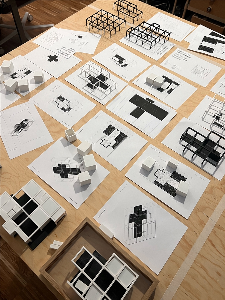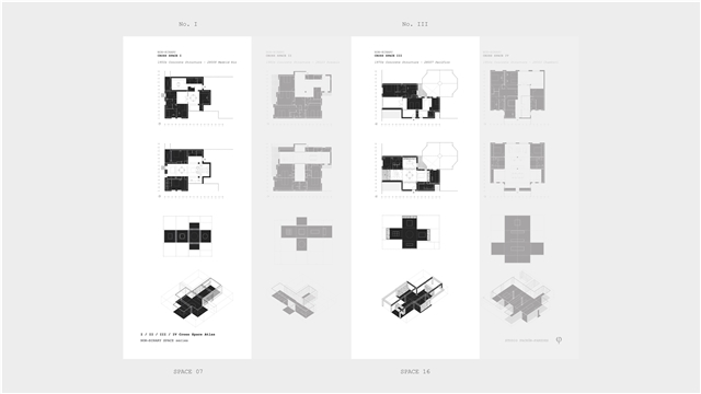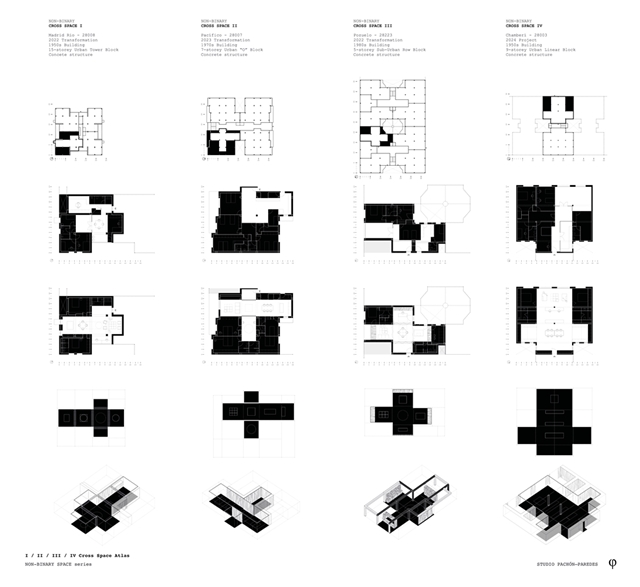Los cuadrantes no construidos del cross-space se conciben como espacios dinámicos, colectivos y cambiantes a lo largo del tiempo, carentes de definiciones tipológicas. El cuadrante central, donde se produce la intersección espacial, funciona como confluencia de tránsitos y cualidades termodinámicas. Con sistemas flexibles de división puede conectarse o separarse de los adyacentes, configurándose como plaza, calle o volumen de control energético y acústico. Los cuadrantes extremos, junto a los espacios binarios, pueden unirse o aislarse, catalizando intimidad y flexibilidad.