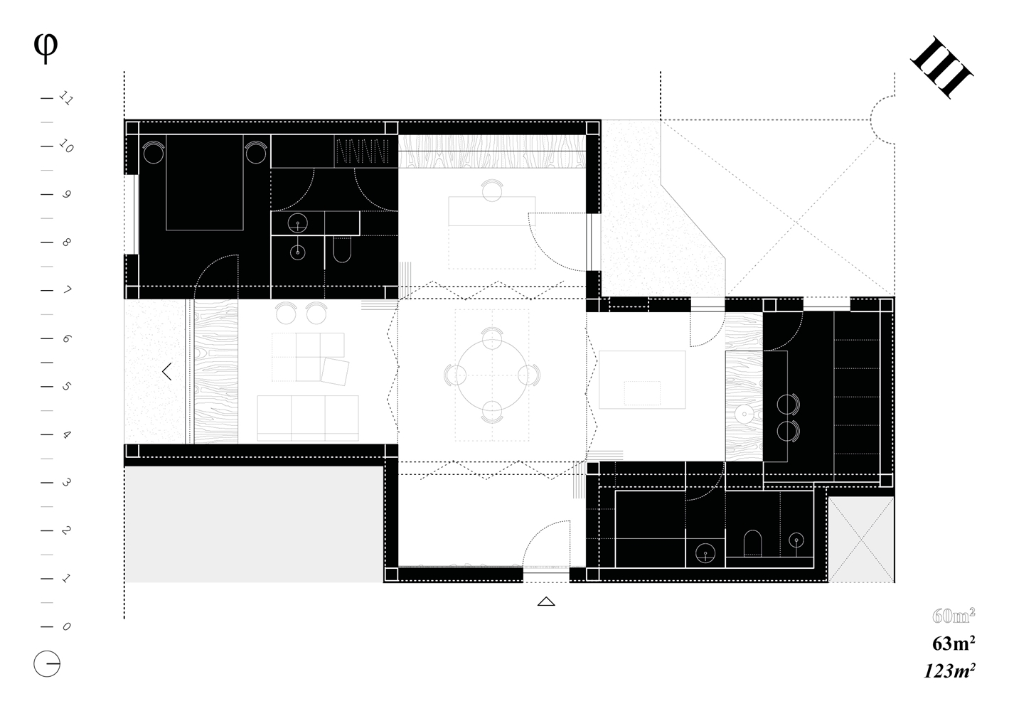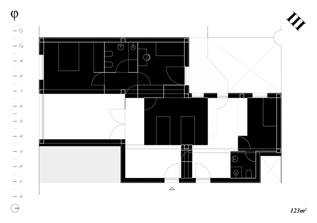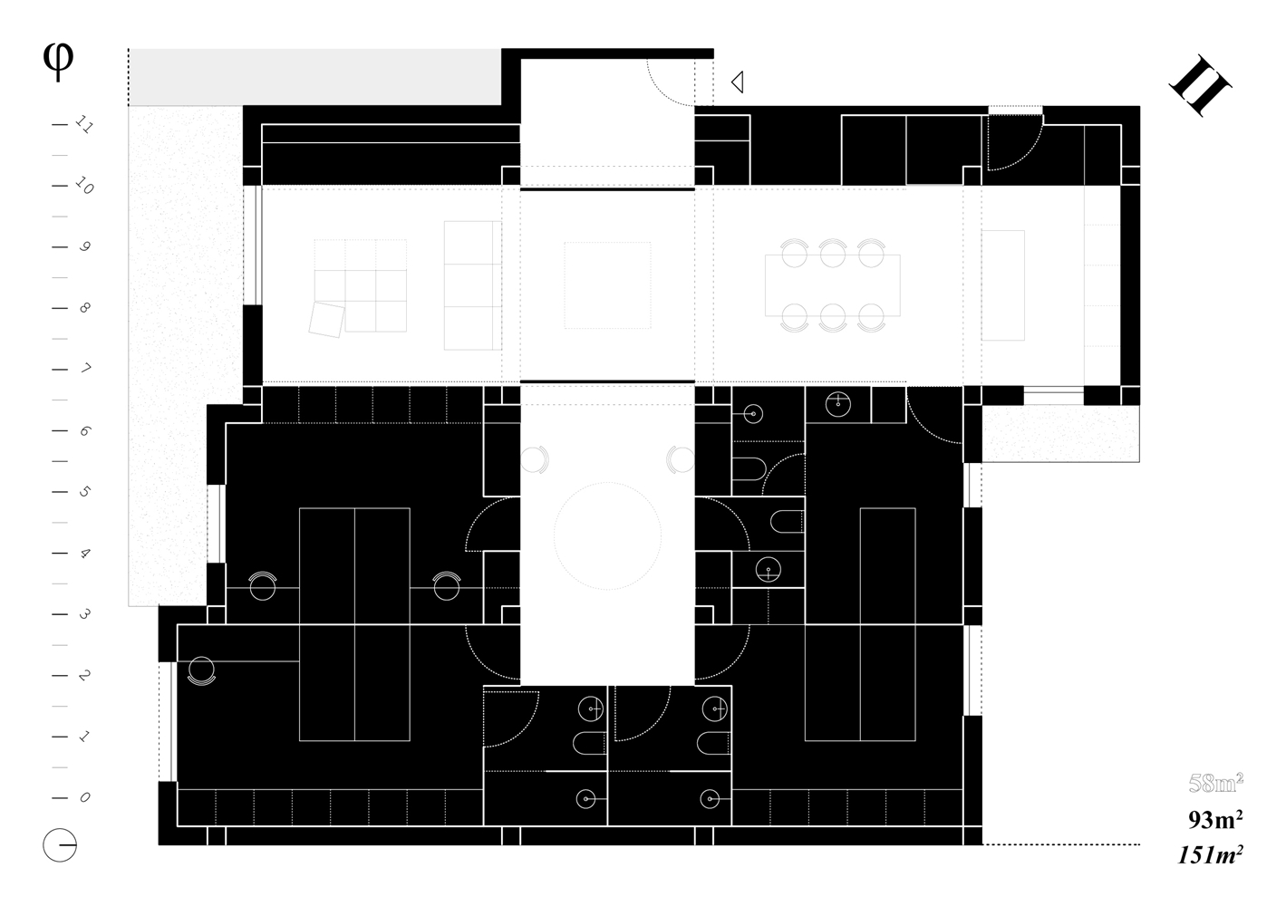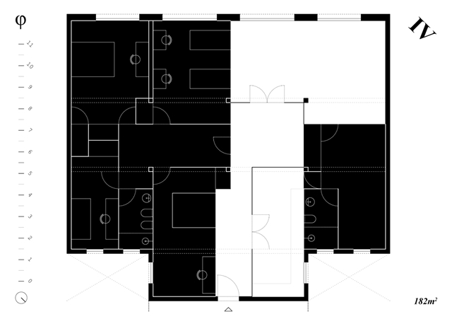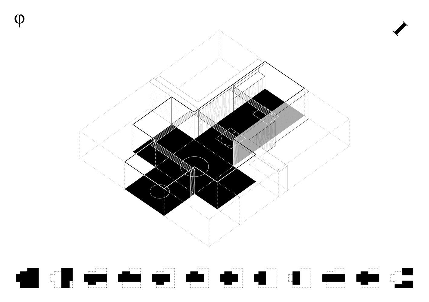 Los cuadrantes no construidos del cross-space se conciben como espacios dinámicos, colectivos y cambiantes a lo largo del tiempo, carentes de definiciones tipológicas. El cuadrante central, donde se produce la intersección espacial, funciona como confluencia de tránsitos y cualidades termodinámicas. Con sistemas flexibles de división puede conectarse o separarse de los adyacentes, configurándose como plaza, calle o volumen de control energético y acústico. Los cuadrantes extremos, junto a los espacios binarios, pueden unirse o aislarse, catalizando intimidad y flexibilidad.