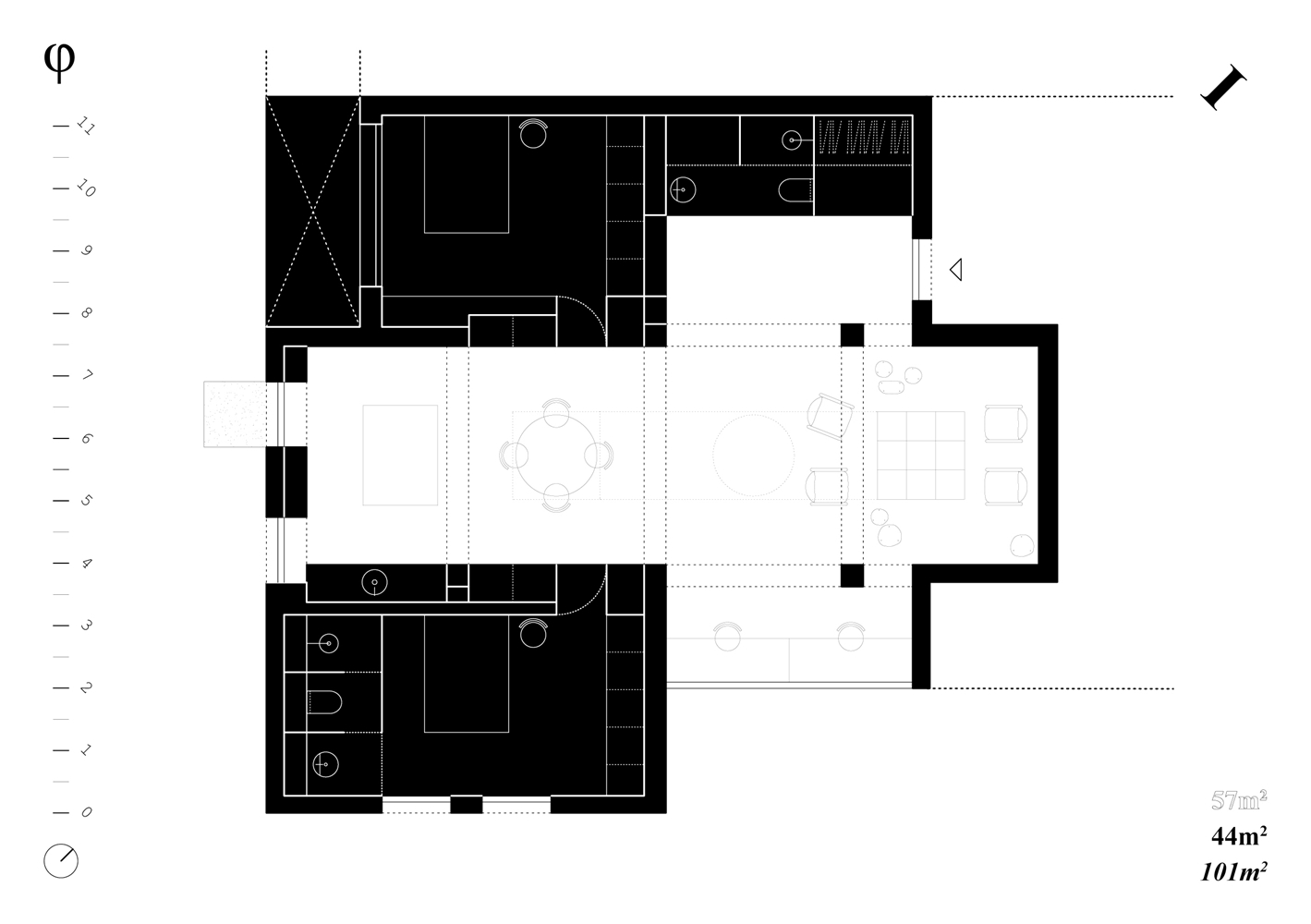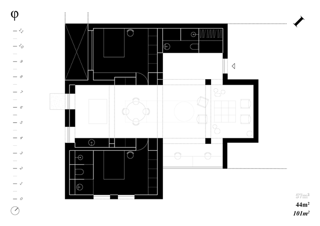 Los espacios binarios domésticos quedan encajados en el perímetro del cross-space, dando soporte al espacio indefinido y otorgando privacidad. Ese límite definido se convierte en fachada secundaria del espacio público doméstico, con puertas, armarios o instalaciones.