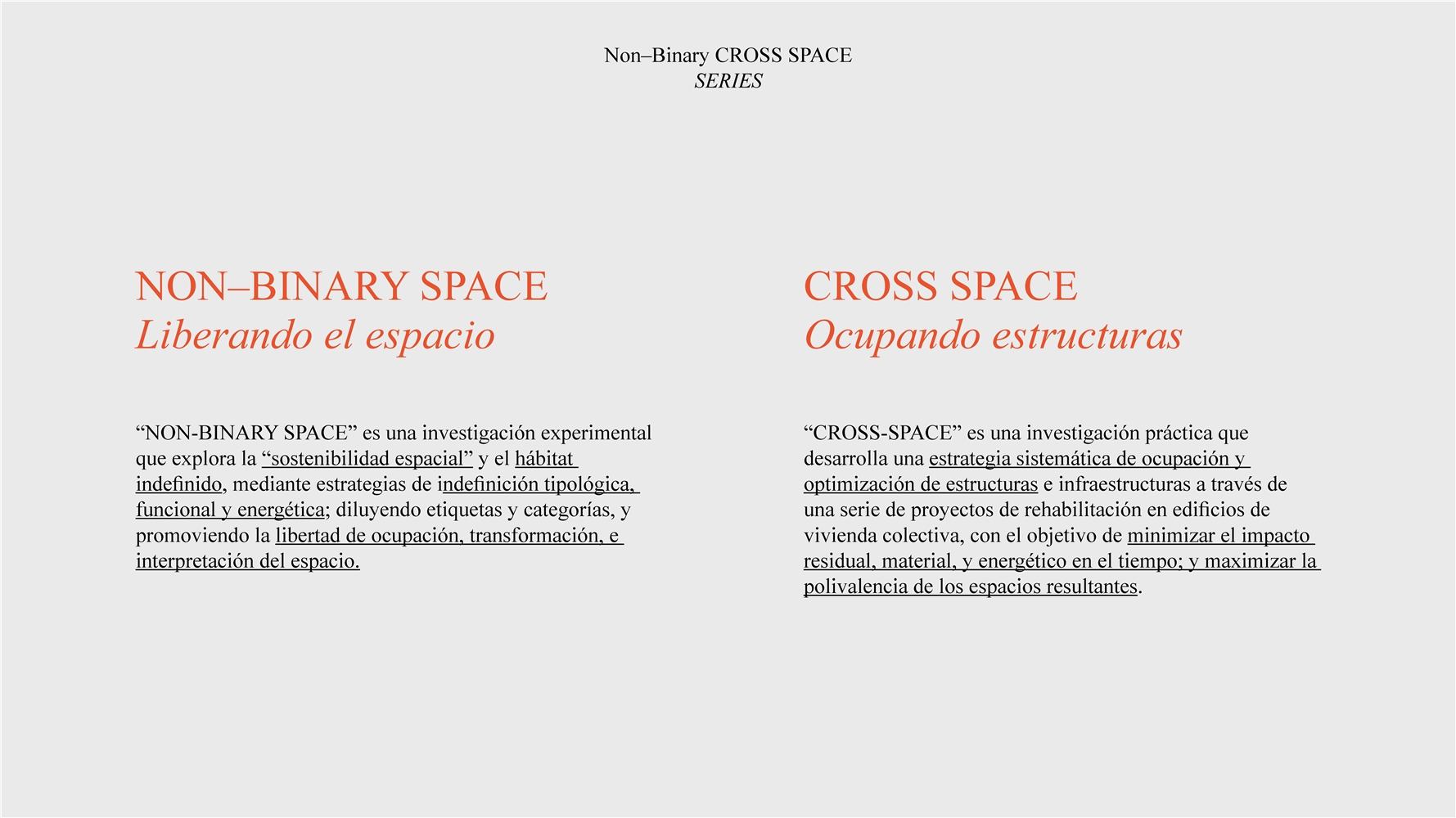 Los proyectos de la serie pretenden dar un soporte polivalente a la diversidad de formas de habitar, enmarcándose en dos investigaciones activas:
