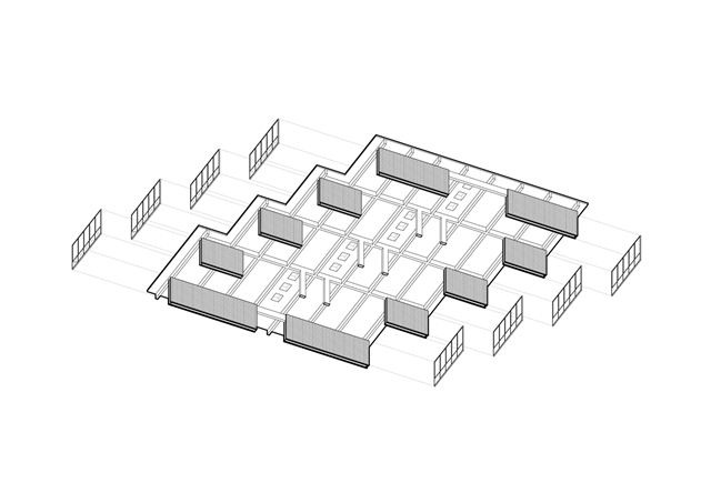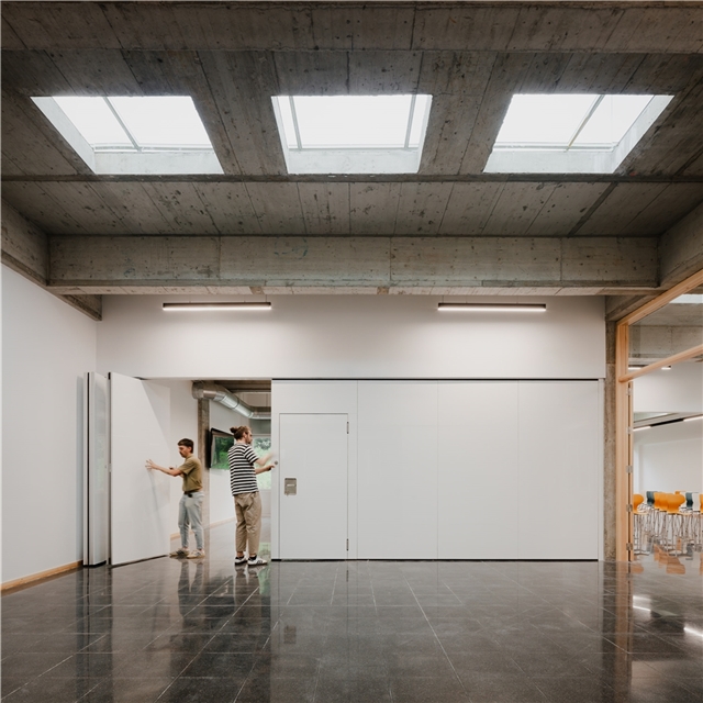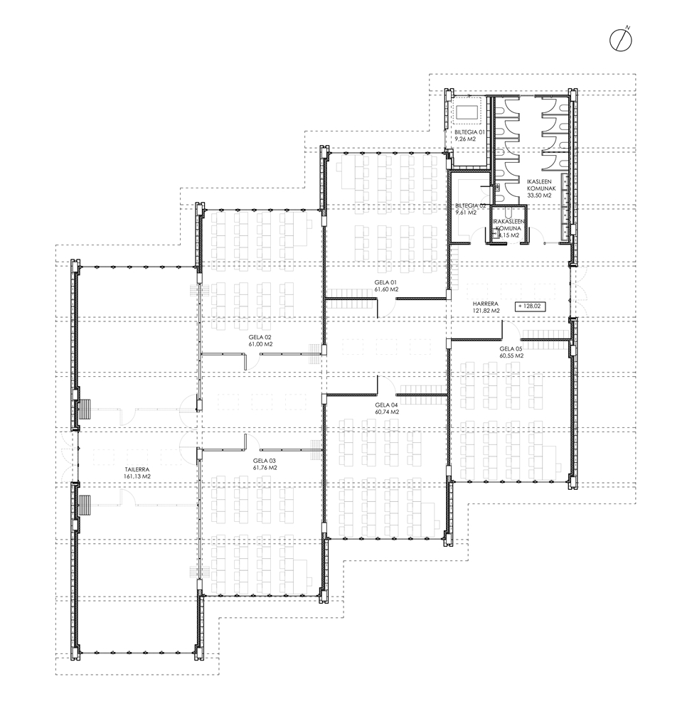 La planta se organiza en franjas paralelas que acogen las aulas requeridas por el programa, desplegándose de forma ligeramente escalonada hasta conformar un espacio continuo de más de 900 m². Más que una ampliación convencional, el proyecto propone una nueva centralidad para la vida escolar: un gran patio cubierto, versátil y protegido de la lluvia, preparado para absorber tanto la actividad docente cotidiana como encuentros colectivos, celebraciones y eventos comunitarios. El espacio puede compartimentarse en siete aulas independientes y, gracias a un sistema de tabiques móviles, transformarse con rapidez en una superficie diáfana que amplía sus posibilidades de uso.
