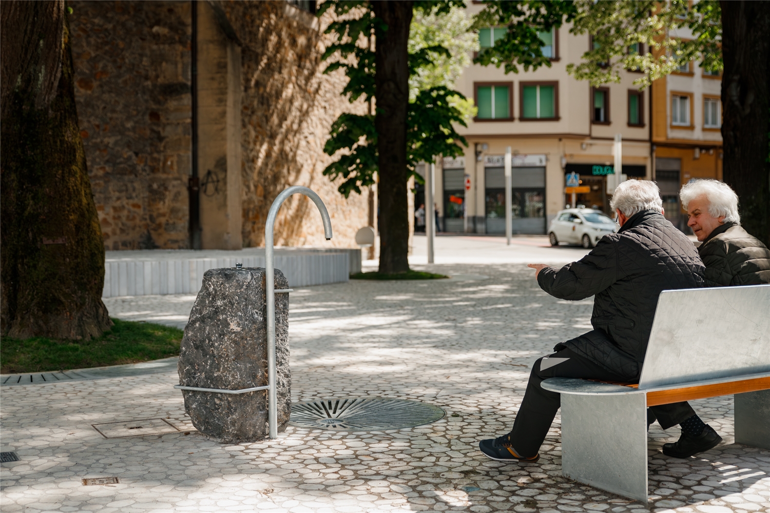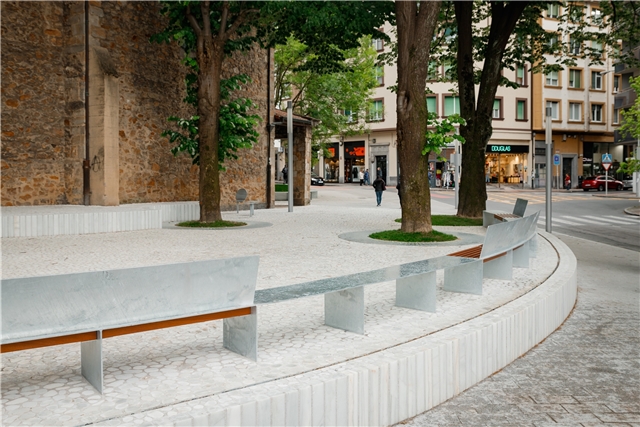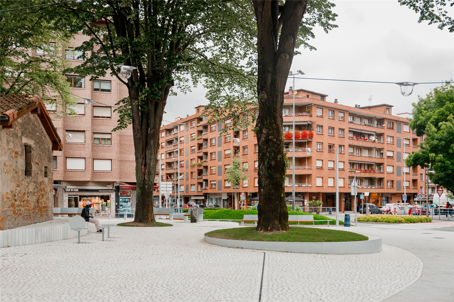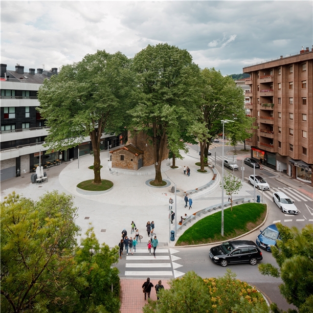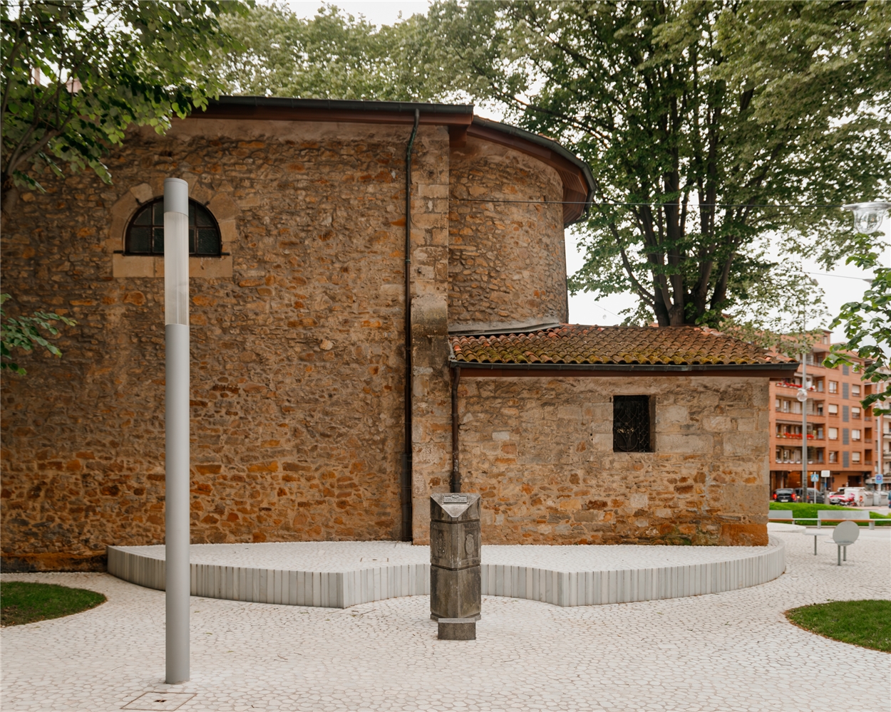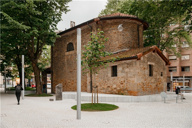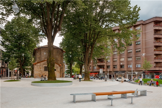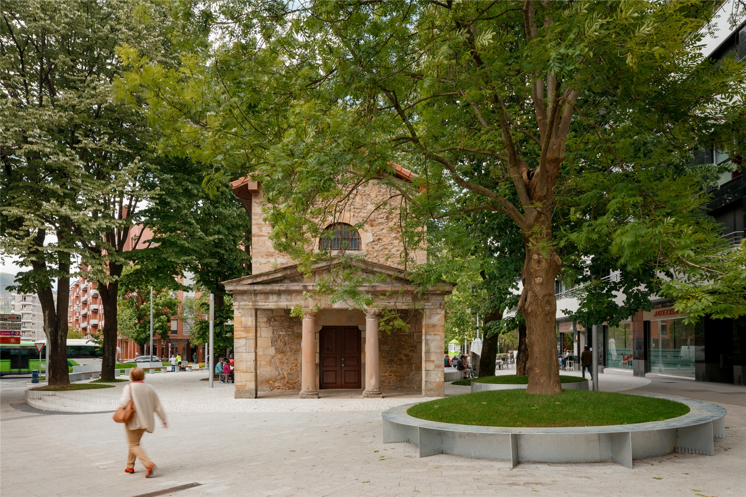 La primitiva iglesia de la Magdalena fue construida a principios del siglo XIX cuando las tropas francesas afincadas en la Villa de Durango, decretaron que los cementerios, que hasta entonces estaban en los pórticos de Santa María y Santa Ana, tenían que salir fuera del centro de la Villa. Posteriormente el cementerio fue trasladado a las afueras construyéndose en su lugar la ermita de la Magdalena que conocemos. Ubicado en pleno centro de Durango, el crecimiento de la trama urbana ha convertido este espacio en un nodo importante de tránsito peatonal, albergando en su perímetro la estación municipal de autobuses o las oficinas de la seguridad social entre otros. 8 Tilos centenarios de gran envergadura se ubican alrededor de la ermita. Estos árboles definen el carácter del espacio público, generando una gran pérgola vegetal en la zona posterior del equipamiento religioso. De mor fología triangular, la plaza se abre en sentido sur-norte, albergando la mayoría del espacio libre en la zona norte, enfrentado al ábside de la ermita. A oeste y norte transitan dos vías de tráfico rodado, y en el lado este se ubica un edificio de viviendas. Décadas de abandono y la implantación sistemática de elementos urbanos auxiliares como baños públicos, casetas de venta de tiques de bus… habían convertido el espacio público en una zona de tránsito, relegando la zona de estar a un espacio residual degradado. La intervención trata de recuperar la referencialidad de la ermita y de reactivar el espacio público a través de 6 acciones: