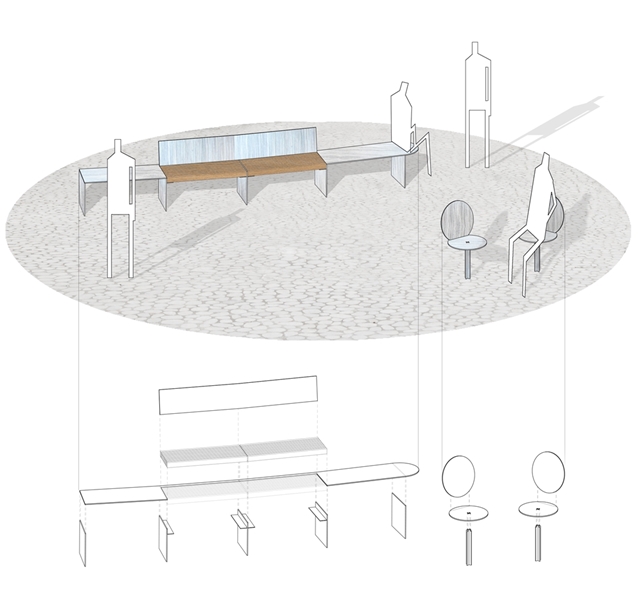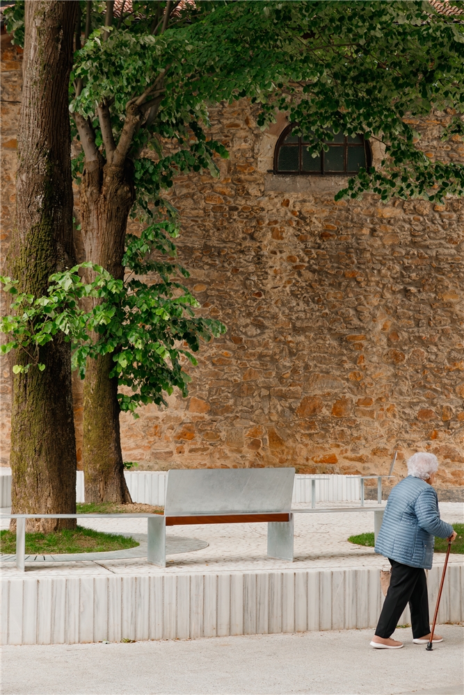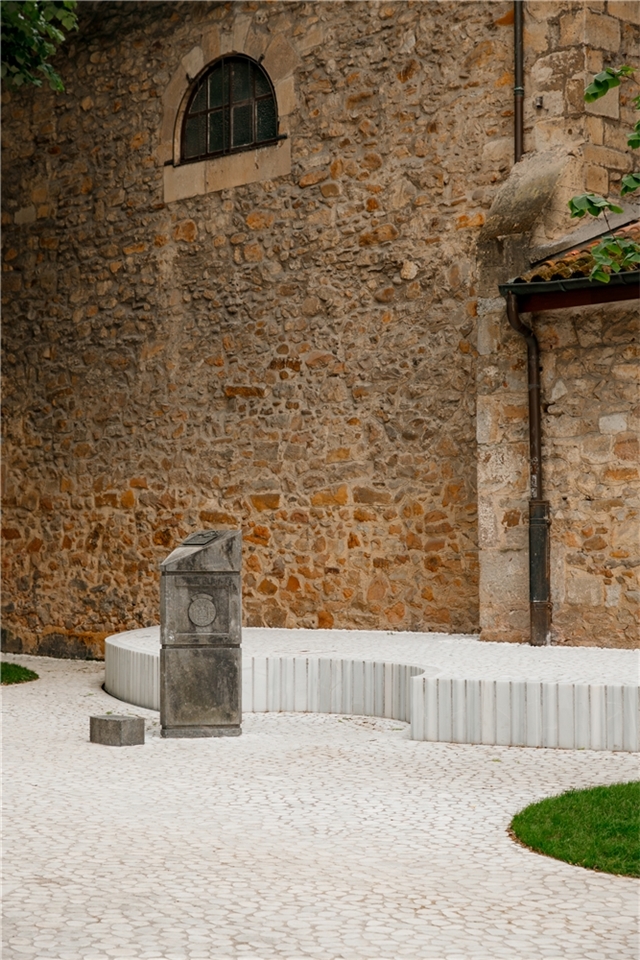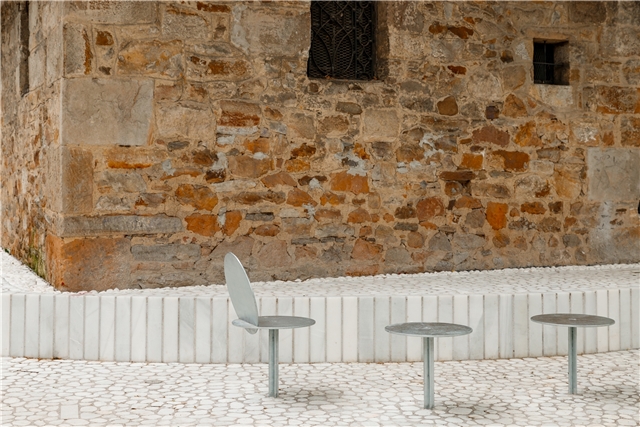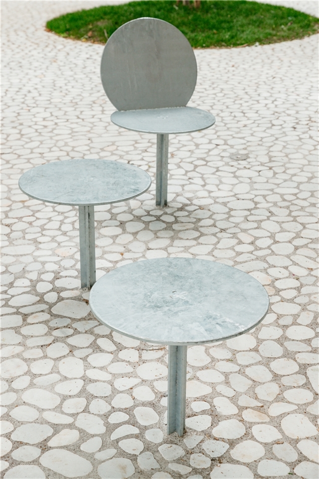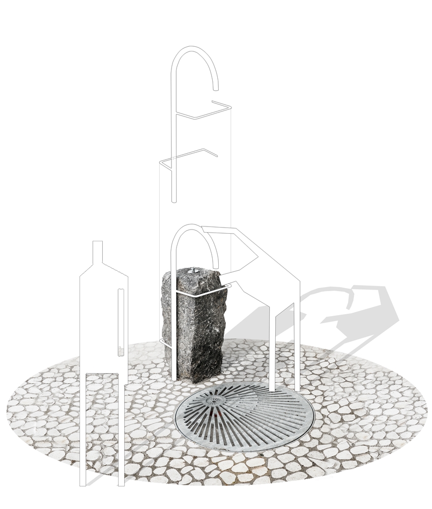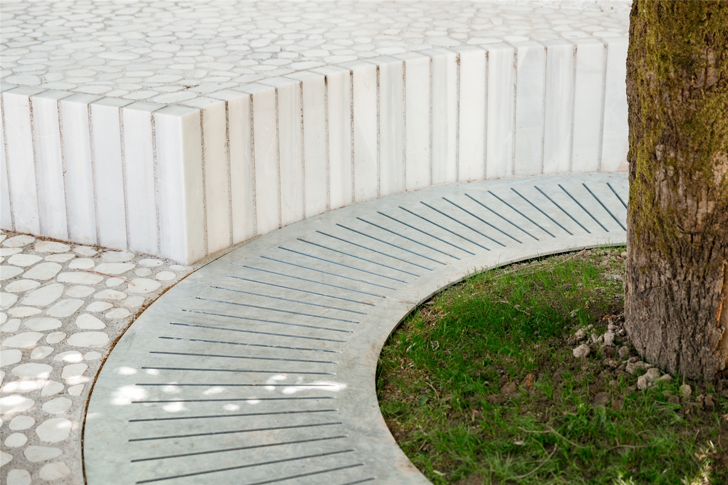 6- ACOMPAÑAR Los elementos de mobiliario acompañan a la idea principal de la intervención. Todos los elementos de mobiliario urbano han sido diseñados y ubicados de manera concéntrica en relación con el ábside de la ermita. La nueva fuente y el monolito existente se ubican estratégicamente dentro del círculo exterior para convertirse en dos puntos de referencia dentro de la intervención. El pavimento se resuelve mediante mármol Macael a la palladiana labrado pieza a pieza. El mobiliario ha sido ensamblando con chapa de acero galvanizado de 10 mm cortado a laser y listones de 4 x 6 cm de madera de roble.