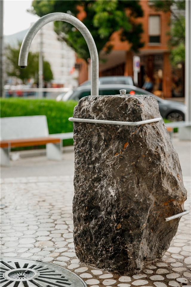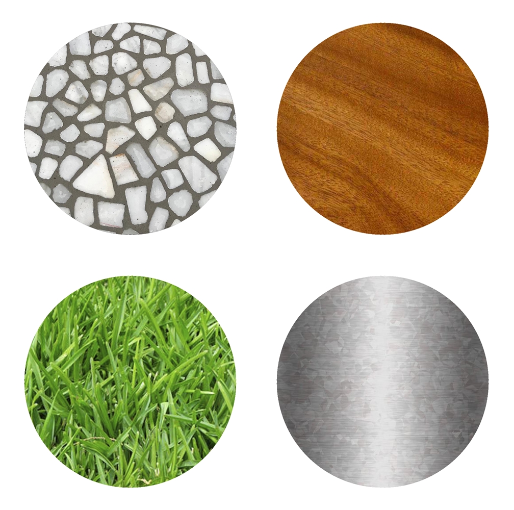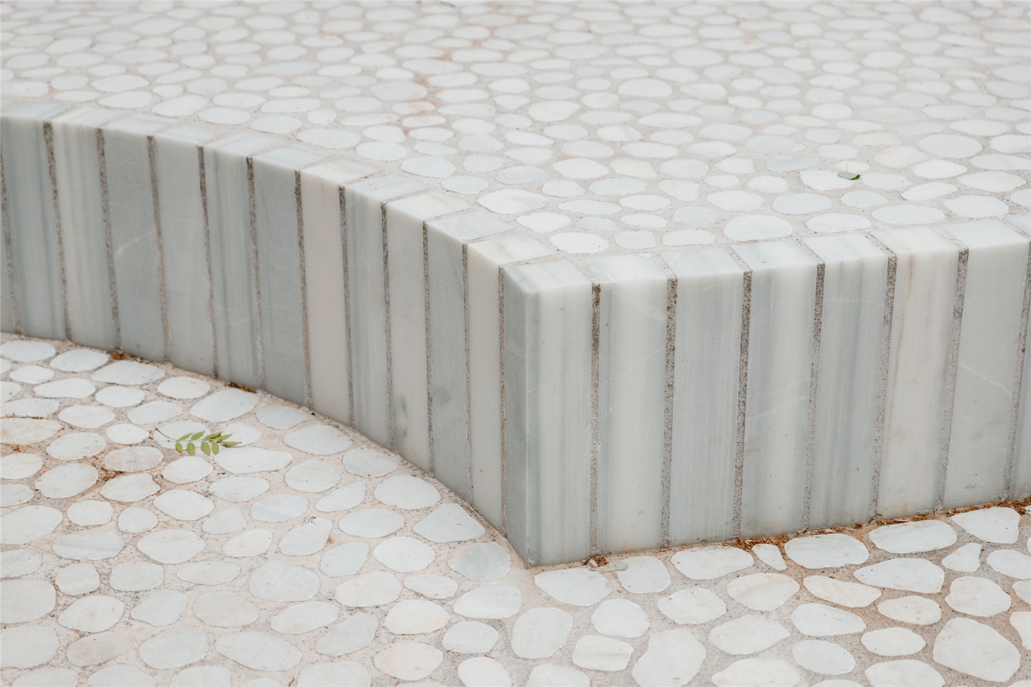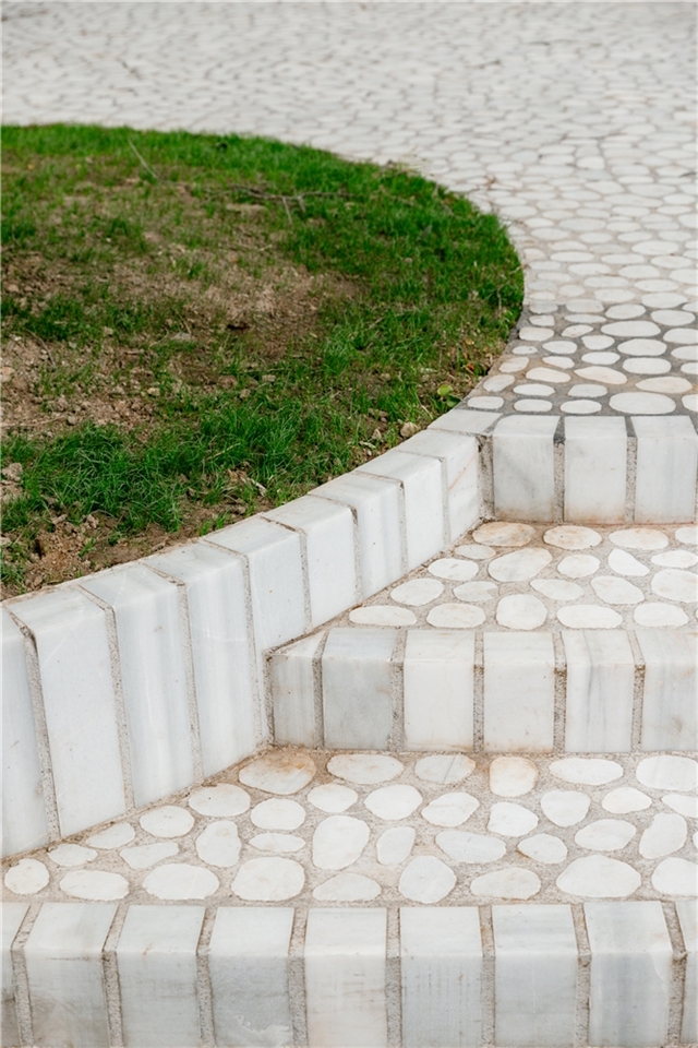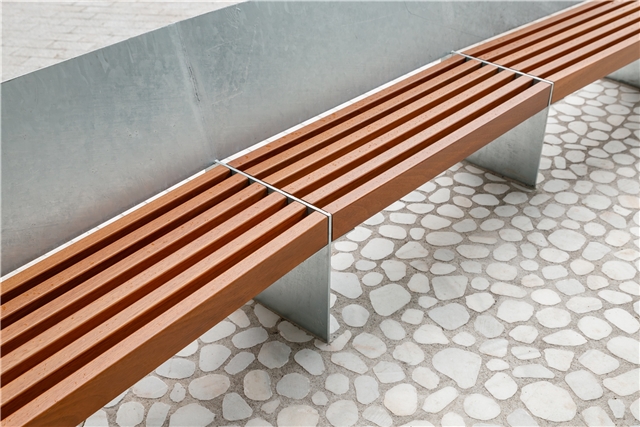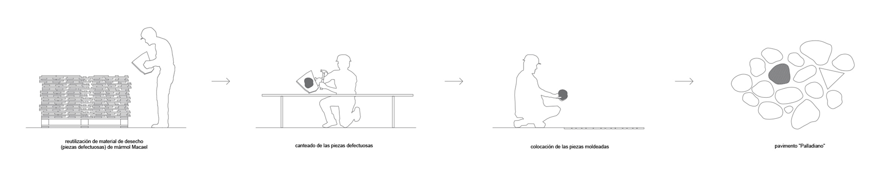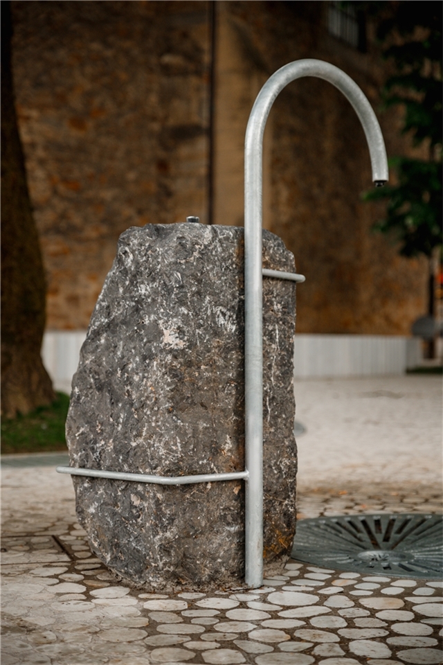 6- ACOMPAÑAR Los elementos de mobiliario acompañan a la idea principal de la intervención. Todos los elementos de mobiliario urbano han sido diseñados y ubicados de manera concéntrica en relación con el ábside de la ermita. La nueva fuente y el monolito existente se ubican estratégicamente dentro del círculo exterior para convertirse en dos puntos de referencia dentro de la intervención. El pavimento se resuelve mediante mármol Macael a la palladiana labrado pieza a pieza. El mobiliario ha sido ensamblando con chapa de acero galvanizado de 10 mm cortado a laser y listones de 4 x 6 cm de madera de roble.