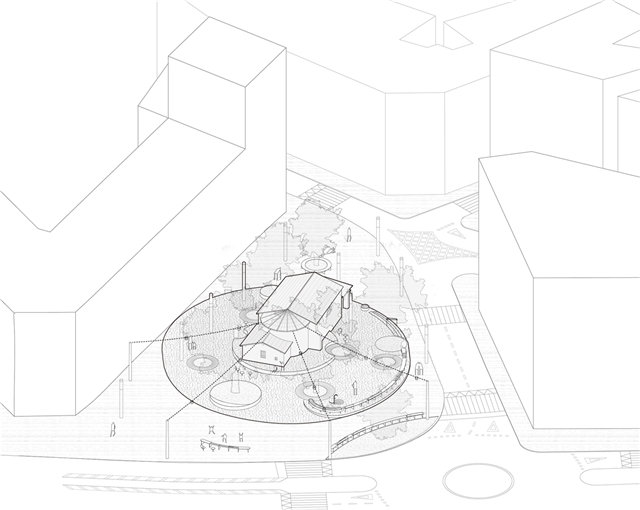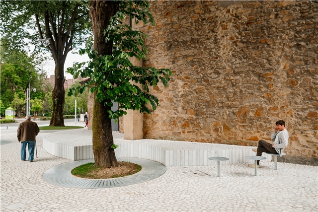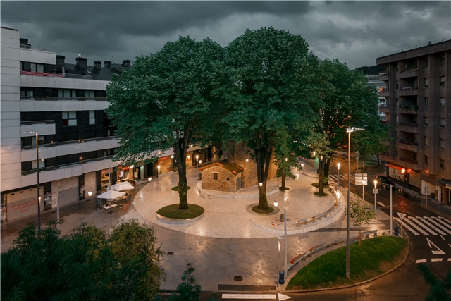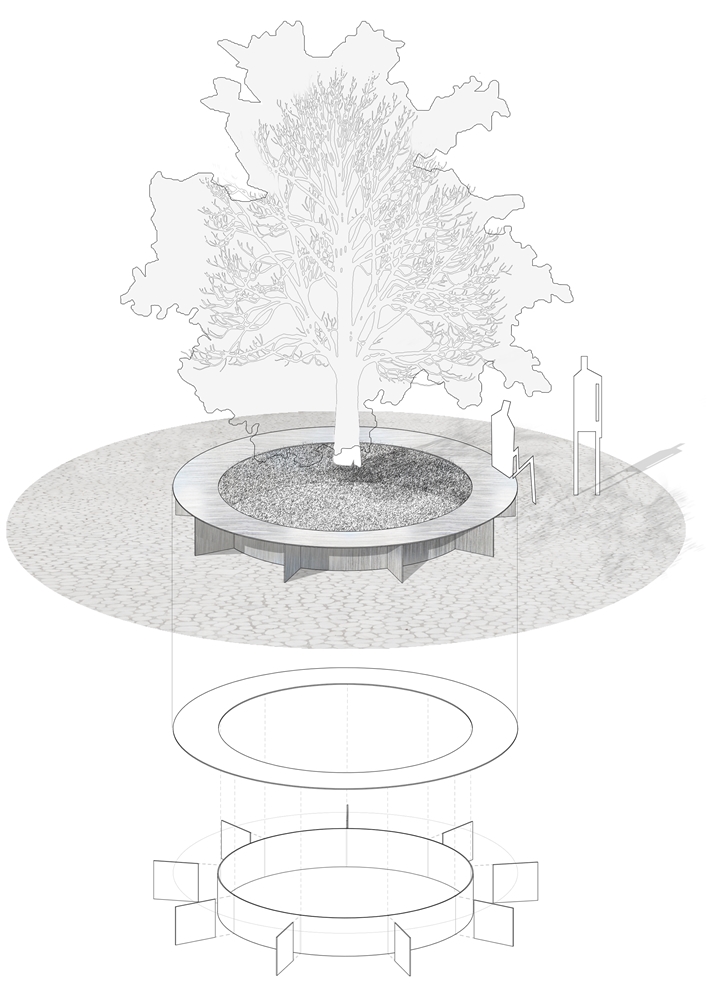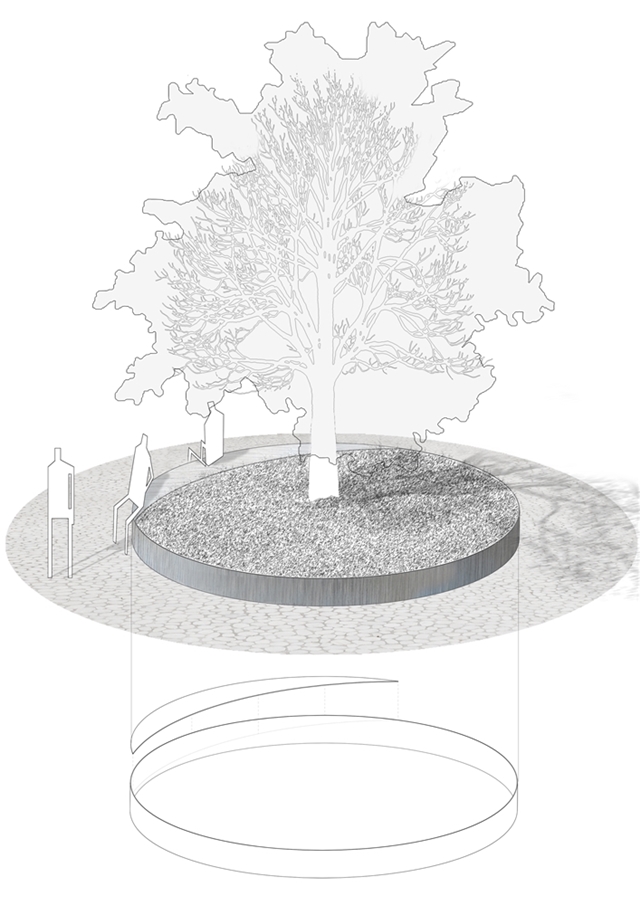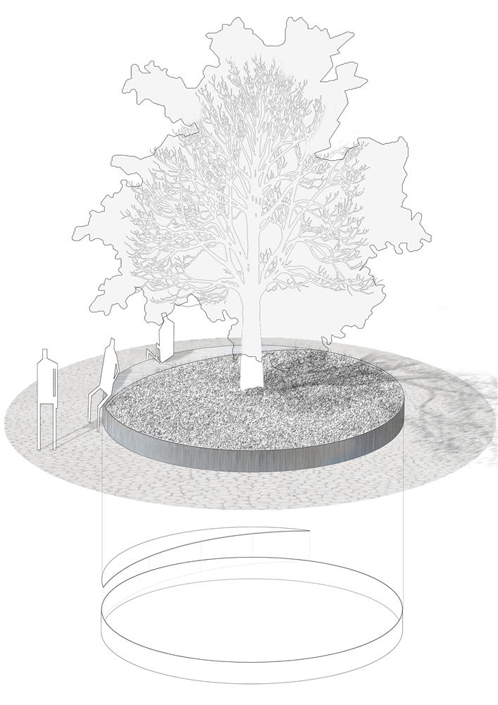 5- DESOCUPAR Se vacia / desocupa la nueva trama circular alrededor de los tilos centenarios e hitos existentes en la plaza. Los alcorques se han adaptado a la cota de las raíces de los tilos, habiendo sido diseñados como un elemento más de mobiliario urbano además de soportes para los árboles. La desocupación de la trama genera zonas de relación más íntimas dentro de la intervención general y reverbera en la importancia tanto de los árboles como de la fuente y el monolito existente.