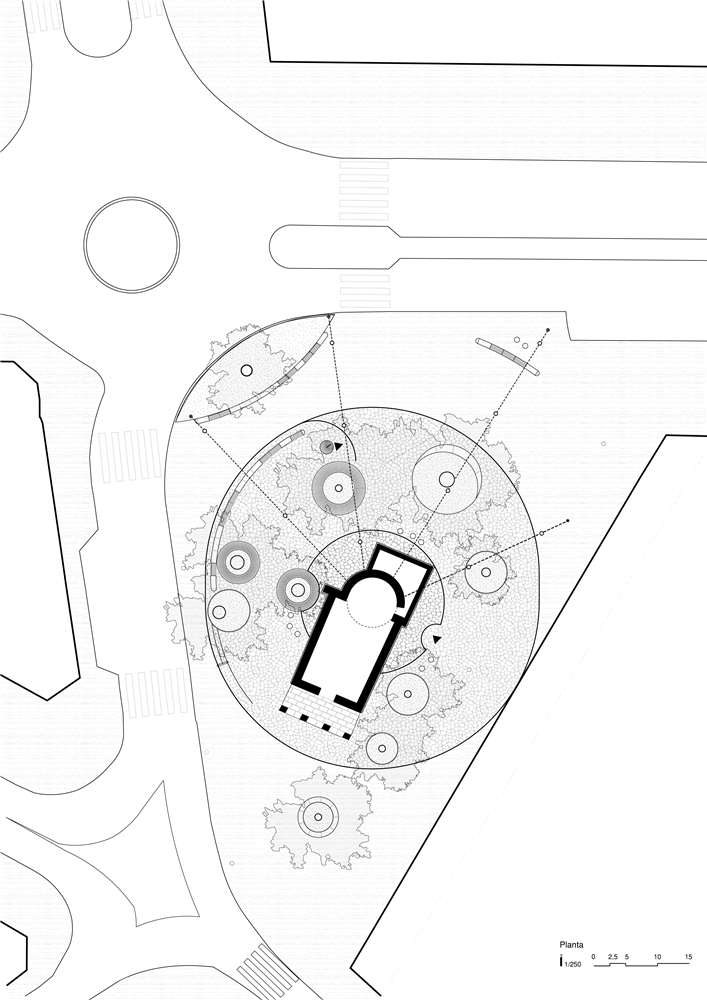 3- OCUPAR Se vuelve a ocupar el espacio tomando el abside de la ermita como eje central de la trama. Se extiende desde el ábside, mediante un único gesto, una trama circular que organiza y jerarquiza todo el espacio. Por un lado, se pone en valor la zona trasera de la ermita, desde la cual se crea una zona concéntrica de escenario/ graderío que mira al entorno perimetral. Por otro lado, mediante esta trama circular se resuelve la accesibilidad, integrando en una sola franja todos los desniveles que se van dando en sentido sur norte. El círculo exterior concéntrico con el ábside abraza los Tilos centenarios delimitando mediante un cambio de pavimento la zona de tránsito y la zona de descanso.