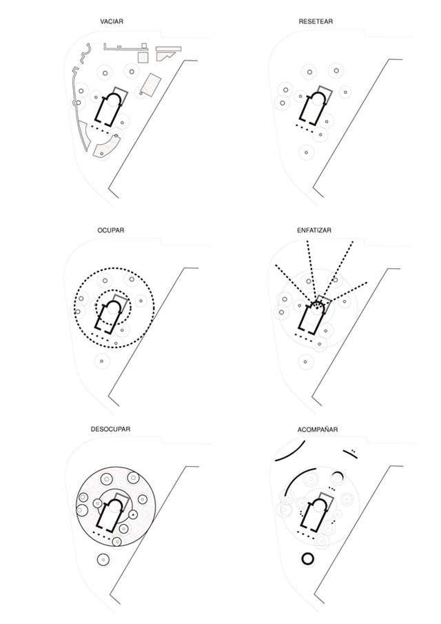 2- RESETEAR Se genera un lienzo en blanco alrededor de la ermita y los tilos con el fin de resetear el funcionamiento viciado de la antigua plaza. Se trata de borrar para poder reconfigurar el espacio (y a su vez al usuario) poniendo el foco en las potencialidades reales de la plaza.